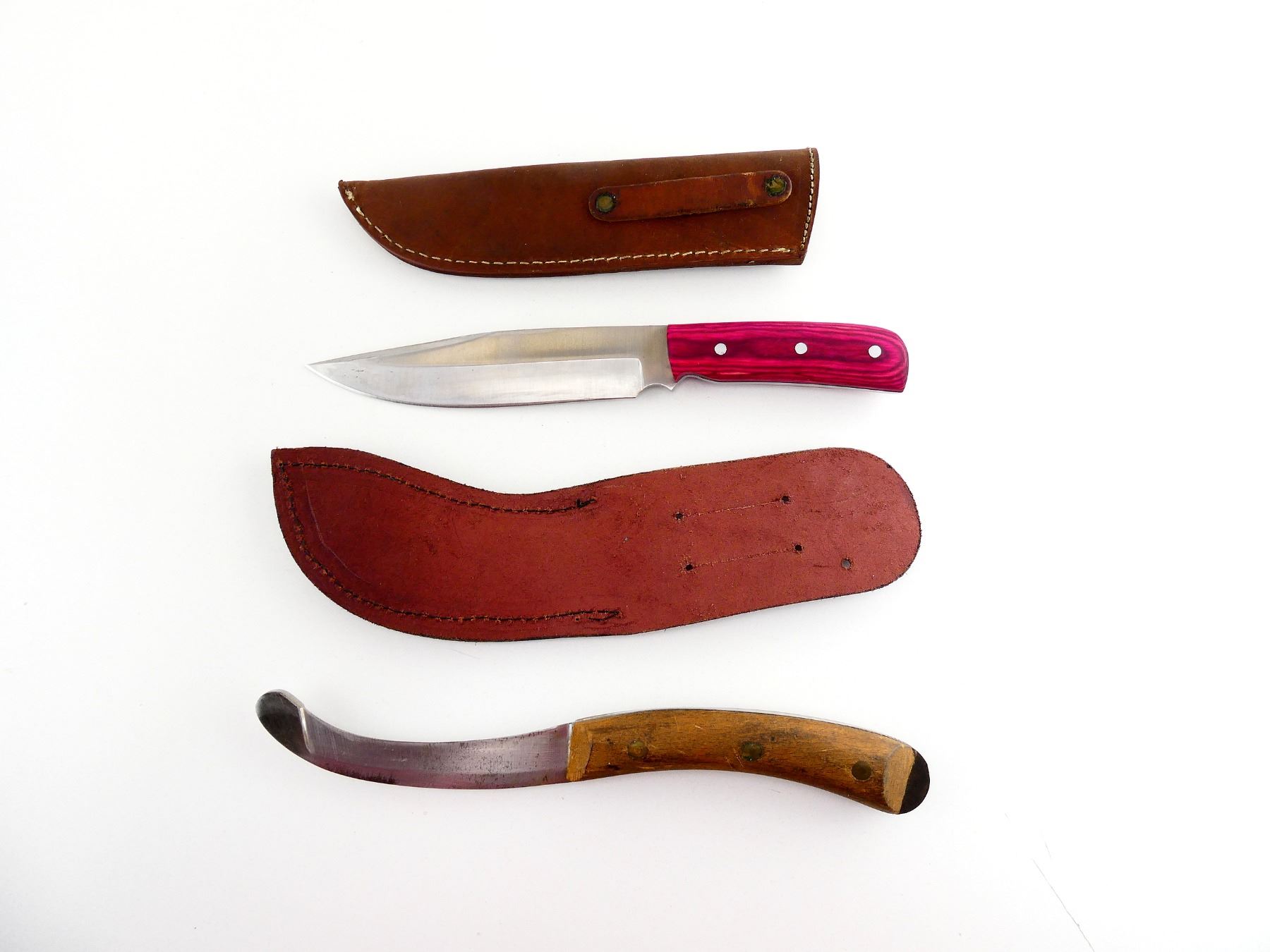 LOT INCLUDES; (1) PARACHUTE RELEASE KNIFE, STEEL BLADE, UNMARKED, WOODEN HANDLE, UNMARKED, SHOWS WEAR & TEAR / USE MARKS, BLADE OVERALL LENGTH APPROX. 5 1/8", OVERALL LENGTH APPROX. 11 1/8", WITH RED LEATHER SHEATH, UNMARKED & (1) UNKNOWN KNIFE, STEEL BLADE, UNMARKED, WOODEN HANDLE, UNMARKED, SHOWS WEAR & TEAR / USE MARKS, BLADE OVERALL LENGTH APPROX. 6.75", OVERALL LENGTH APPROX. 11", WITH BROWN LEATHER SHEATH, EMBOSSED WITH DESIGN. SEE PHOTOS.