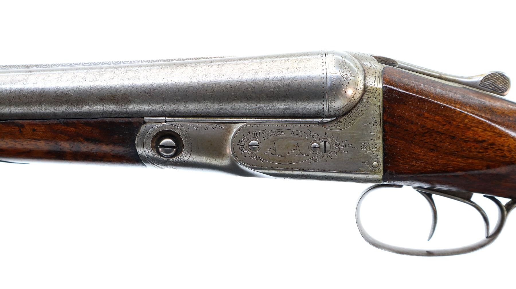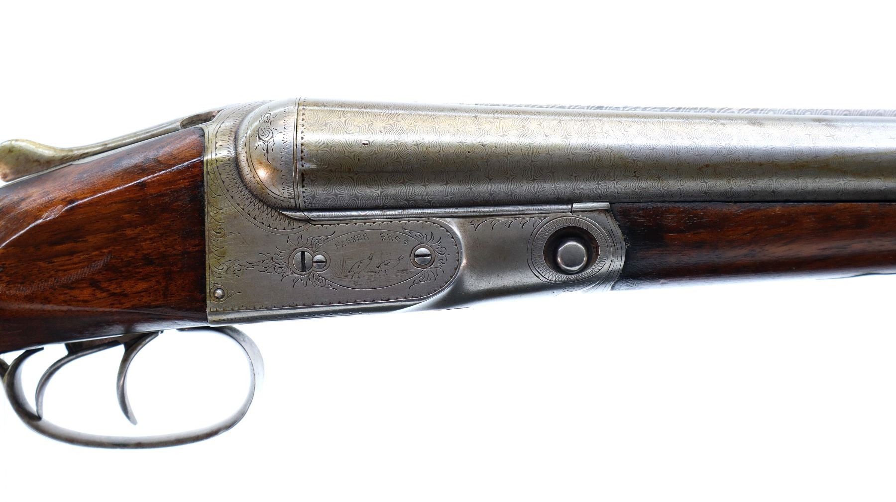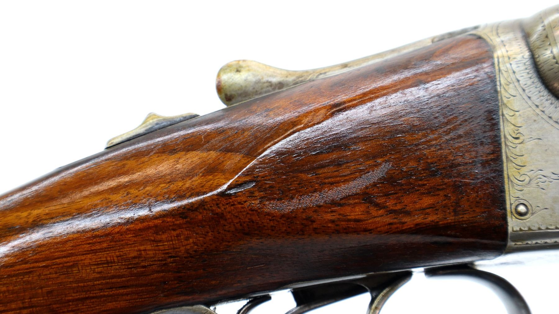 Main Description: Silver bead, Damascus barrels with smooth rib that chime and are tight on face, engraved receiver, automatic safety, ejectors, double triggers. Two piece wood stocks, pistol grip, red vented rubber recoil pad, 14" LOP, grip cap, vanity plate.