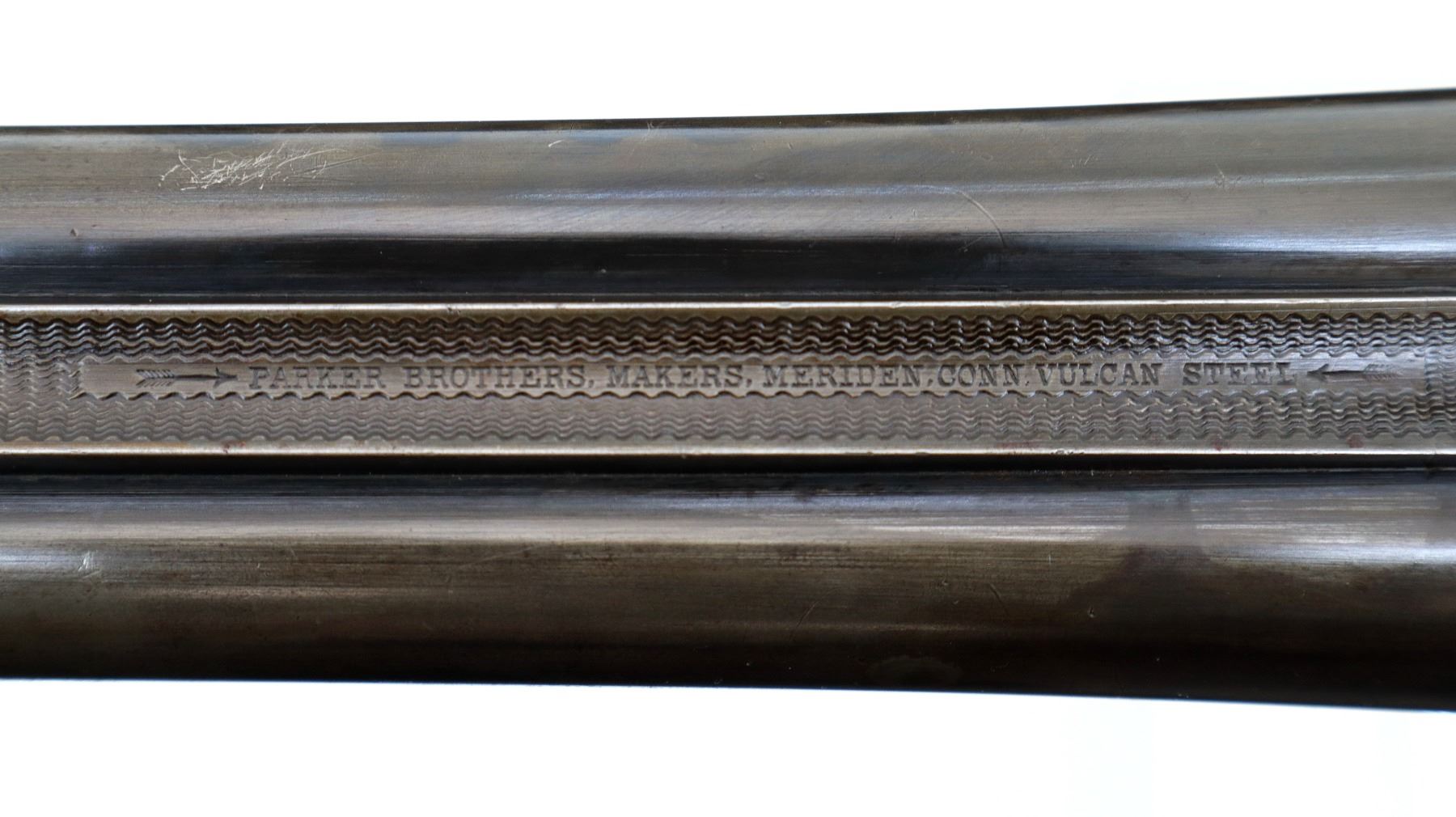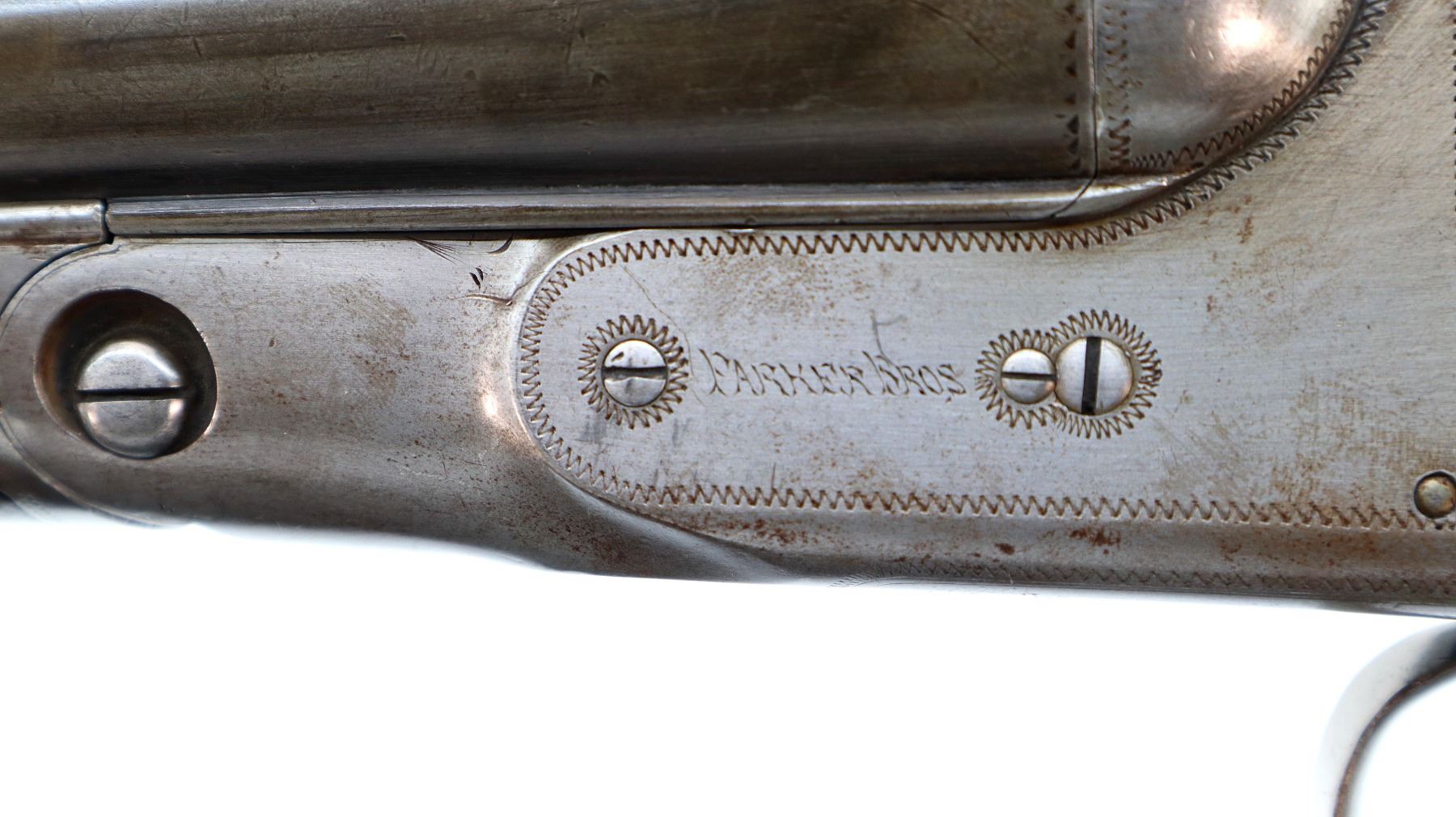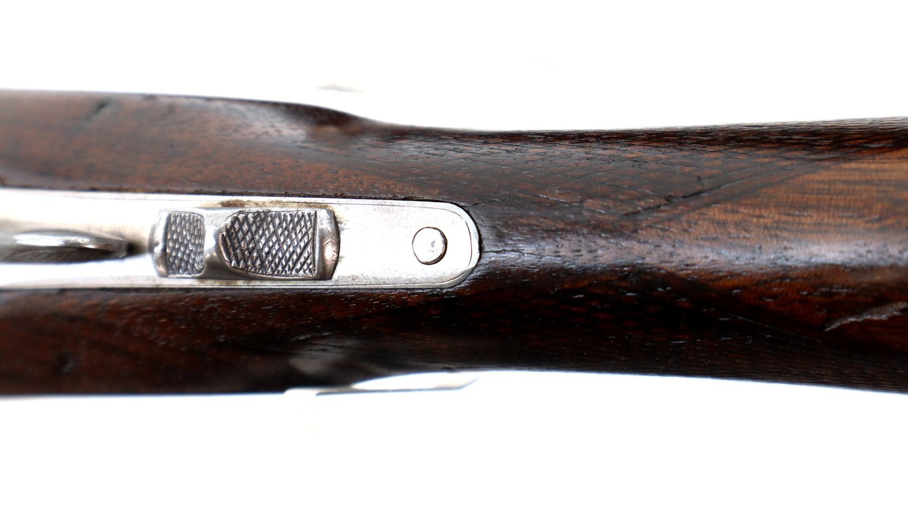Main Description: Silver bead, Barrels are bulged at the chokes with raised rib and are loose on face, automatic safety, extractor, double triggers. Two piece wood stocks, checkered forearm latch spring is broken requires repair. Checkered pistol grip cracked and repaired behind receiver, black rubber recoil pad, 13.5" LOP, grip cap, vanity plate