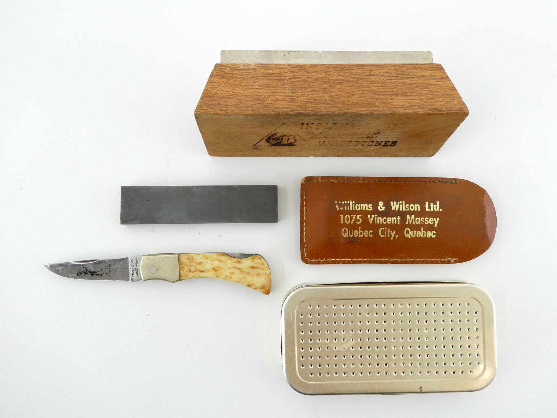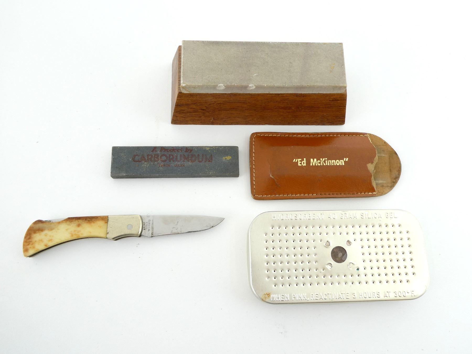 LOT INCLUDES; (1) LITTLE MUSTANG POCKET KNIFE, STEEL BLADE, BONE HANDLE, MARKED "LITTLE MUSTANG", ETC., BLADE OVERALL LENGTH APPROX. 2", (1) CARBORUNDUN KNIFE SHARPENING STONE WITH WILLIAMS & WILSON LTD. "ED MCKINNON" SHEATH, (1) INDIAN MOUNTAIN WHETSTONES KNIFE SHARPENING STONE & (1) HYDROSORBENT 40 GRAM SILICA GEL. SEE PHOTOS.