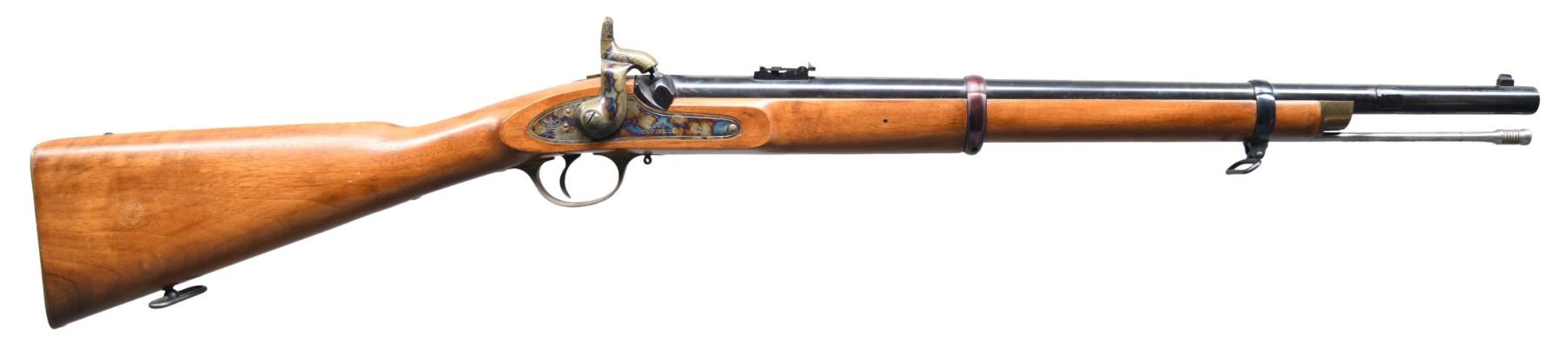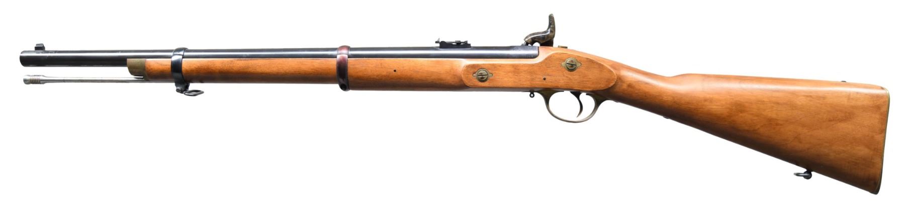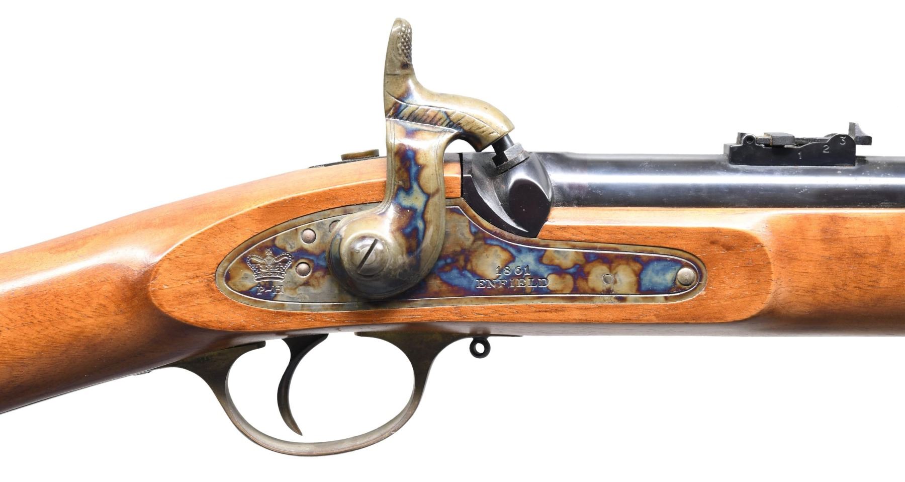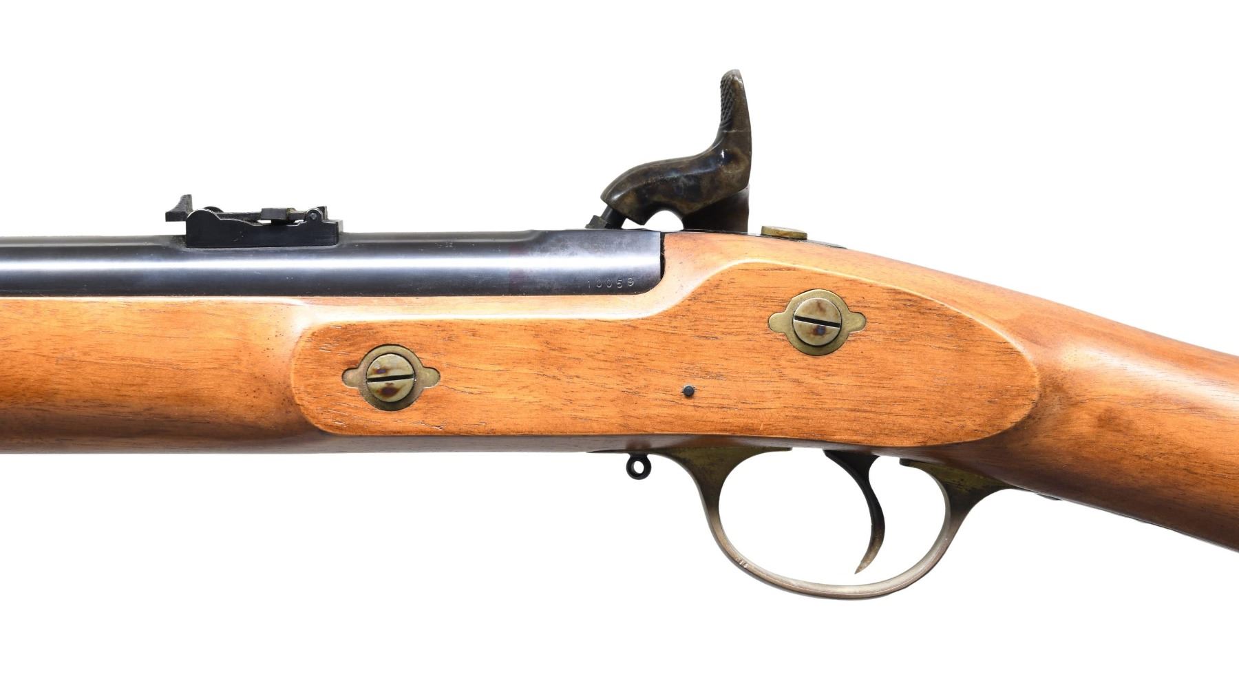Cal. 58. S# 10059. Bbl. 24" rnd. with rifled bore and left side bayonet lug. Fixed front sight with carbine leaf rear sight. Blue finished bbl. and bbl. bands with case colored lock and hammer. Lock has single line border engraving. "(CROWN)/ P-H" is found behind the hammer. "1861/ ENFIELD" is found forward of the hammer. 2-band fastened walnut stock with brass forearm tip, buttplate, trigger guard, and sideplate escutcheons. Right side of stock has circular Parker Hale Ltd. marking. Slotted tip iron ramrod. CONDITION: over 95% metal finish showing scattered light surface corrosion. Rear stock band has a faded plum cast. Brass fittings show some tarnish. Sound lock and trigger. Very good bright bore. (01-27393/DS). ANTIQUE. $300-500.