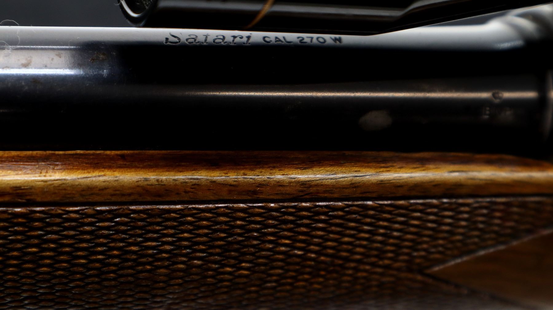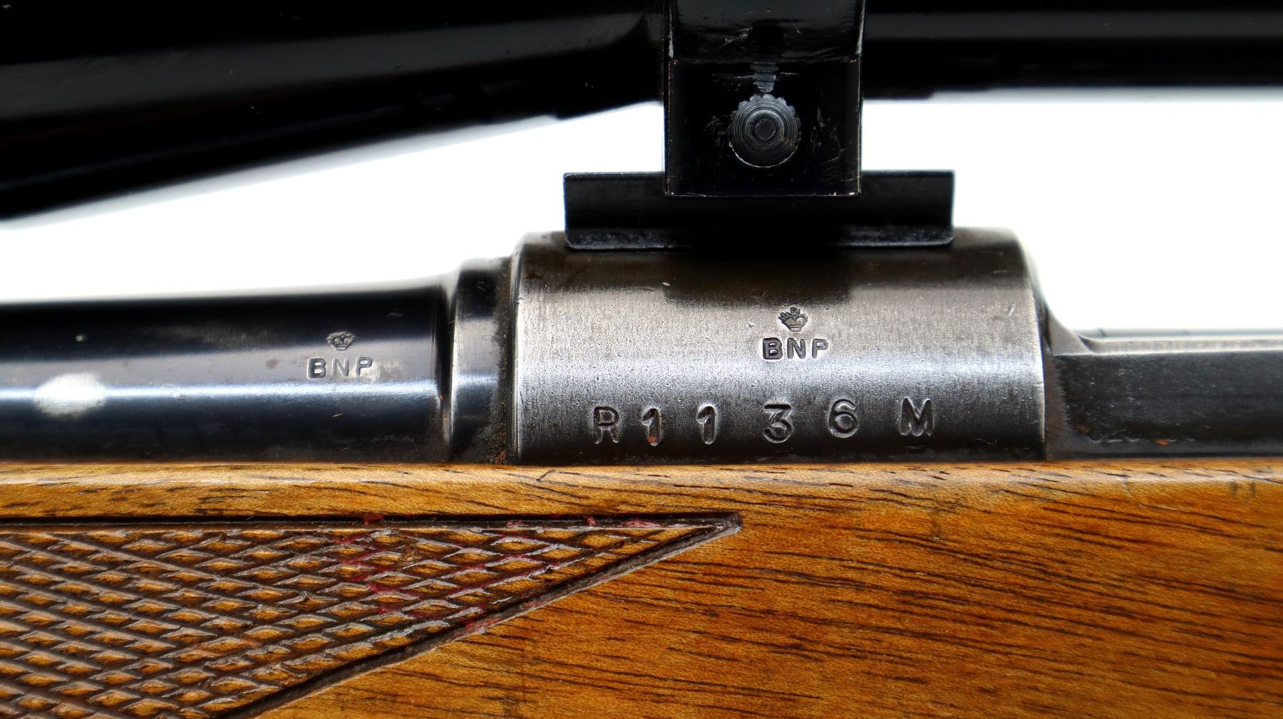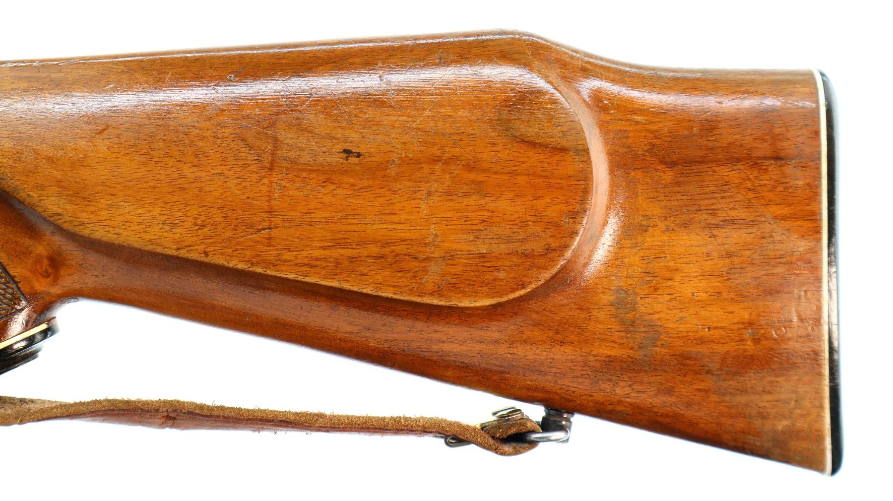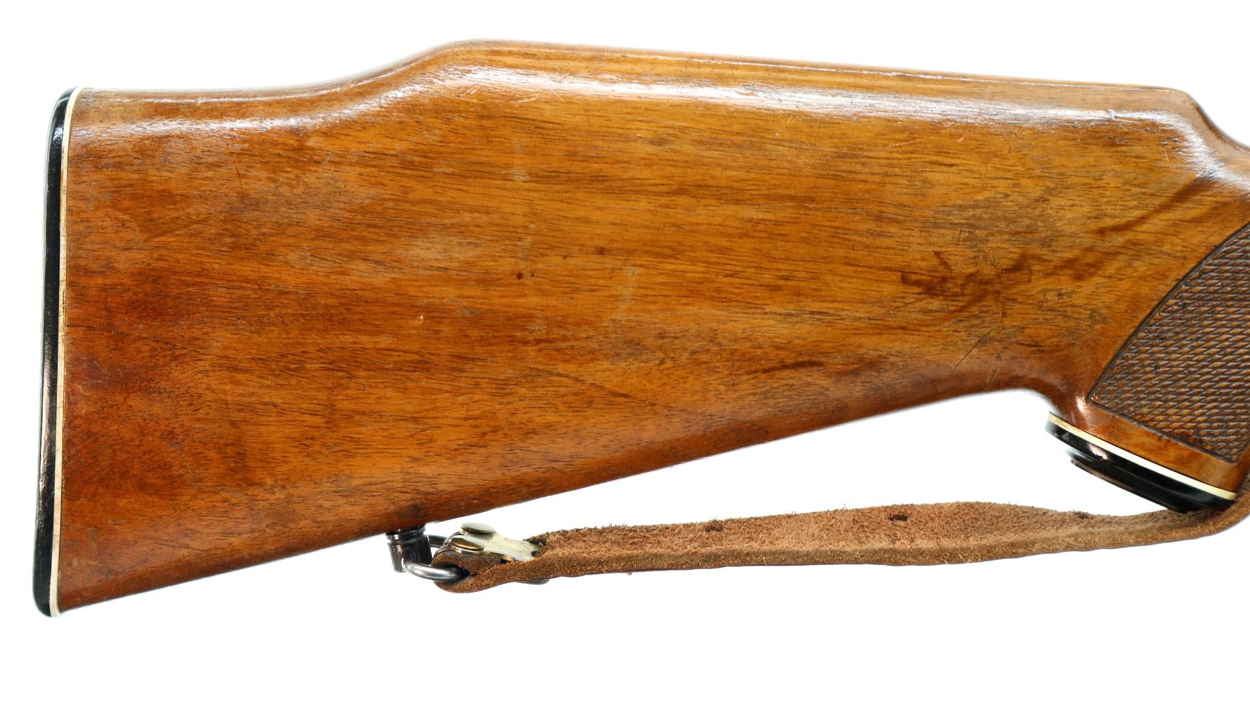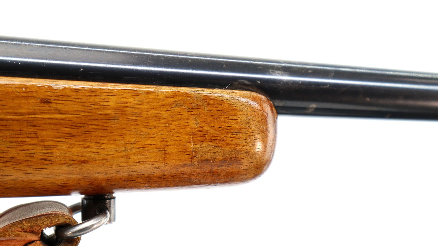 Main Description: Blade front sight with ramp, adjustable folding u notched rear sight, blued finish, receiver drilled and tapped with Leupold Vari X II 3-9x40 scope installed, clear optics with duplex crosshair. One piece wood stock, checkered forearm, pistol grip and black polymer butt plate, cheek rest, grip cap, sling swivels with brown leather sling