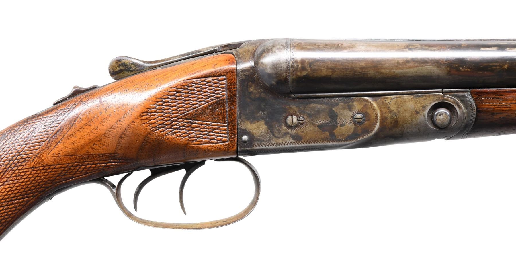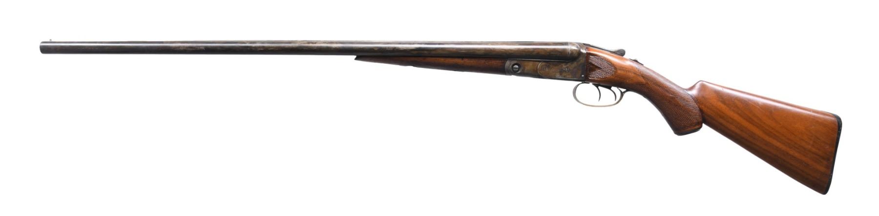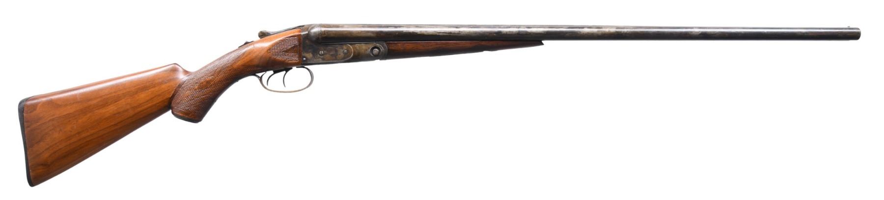 Cal. 16 ga. S# 147889. Bbls. 28" of Vulcan steel w/ fixed Mod & Full chokes. O frame boxlock action w/ borderline engraving. Double triggers. Extractors. Original splinter forearm w/ steel tip. Amateur quality replacement walnut stock w/ coarse checkering & stippled surfaces using original grip cap. LOP: 13 5/8" over original dog's head buttplate. CONDITION: metal has gray/brown coloration from touch-up finish. Forearm is refinished w/ coarsely recut checkering. Stock finish shows wear. Action is sound, top lever sits at center. Bbls. have lengthened forcing cones & chambers lengthened to 3". Lightly pitted bores. Left bbl. has dent 7" from breech. PROVENANCE: from the renowned collection of quality sporting arms from Lewis Drake together with inventory of Lewis Drake Associates. (24-6564/DS). CURIO. $500-1,000.
