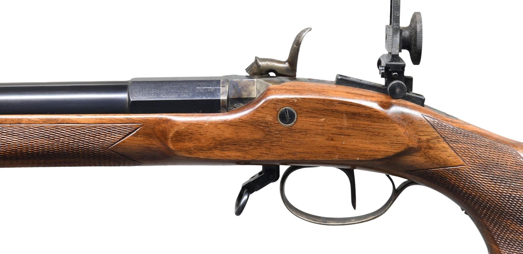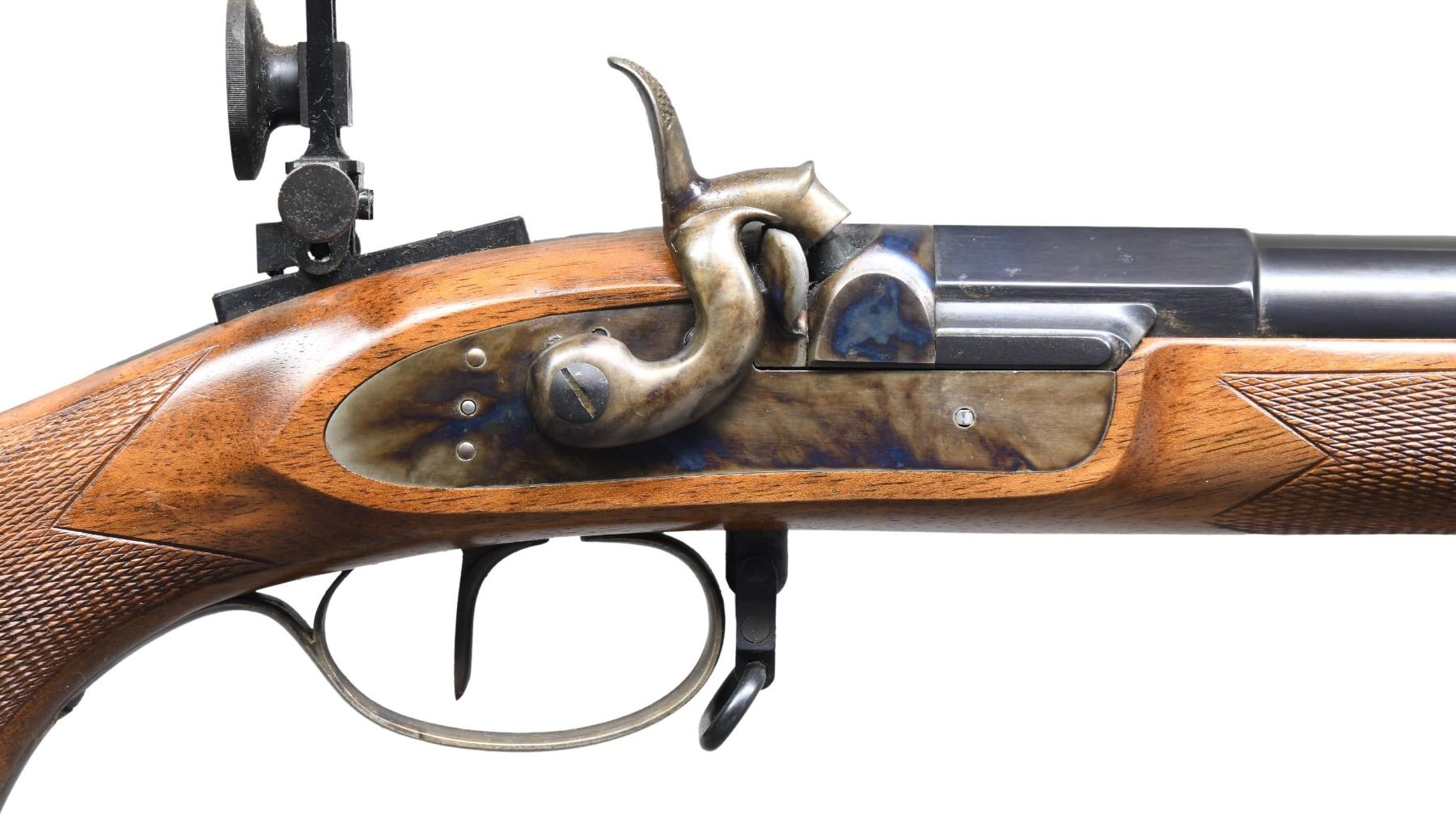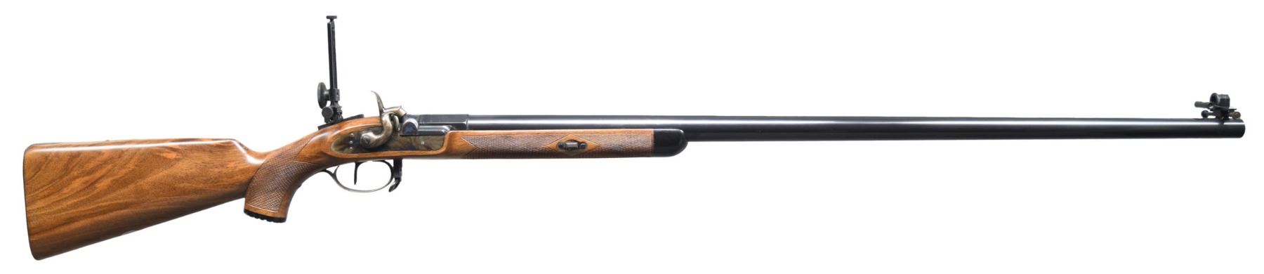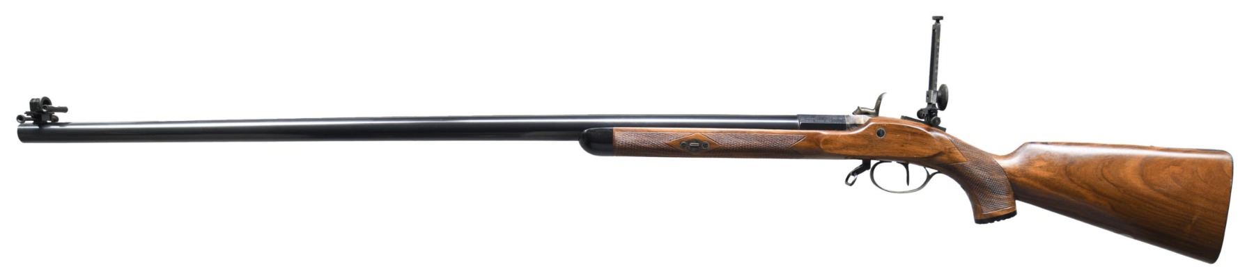 Cal. 45. S# DA100704. Bbl. 36" tapered heavy target weight with octagon shank. Creedmoor Vernier tang sight with large disc aperture and adj. spirit level tunnel front sight. Case colored lock, breech, top tang, trigger plate, and trigger guard. Plain trigger. Wedge fastened half length pistol grip stock of fine European walnut. Features include cut checkering, contrasting black forearm tip, black fluted grip cap, and long tang steel shotgun buttplate. Toe line has an unmarked oval escutcheon. Introduced in 2002. Weight: 11 lbs. 14oz. CONDITION: metal retains over 97% blue and case colored finish. Light oxidation is found scattered throughout all metal surfaces. Original stock finish shows a few small marks. Sound lock and trigger. Very good bright bore. (01-26270/DS). ANTIQUE. $300-500.