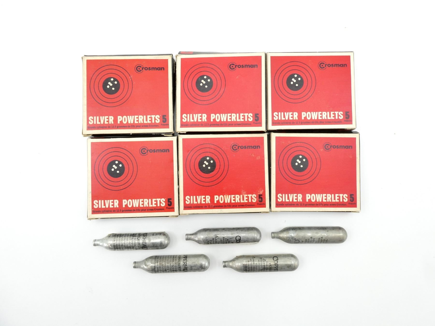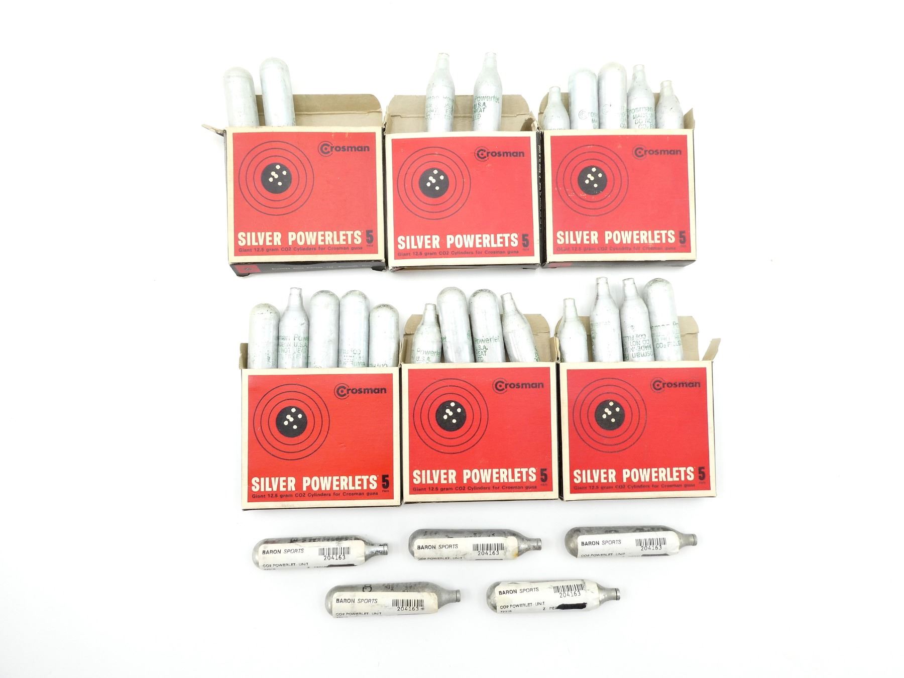 LOT INCLUDES; (6) PACKS OF 5 CROSMAN SILVER CO2 POWERLETS, 12.5 GRAM, MAY NOT BE COMPLETE / PIECES MAY BE MISSING & (5) BARON SPORTS CO2 POWERLETS. SEE PHOTOS.