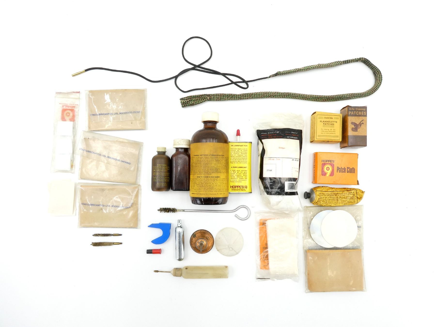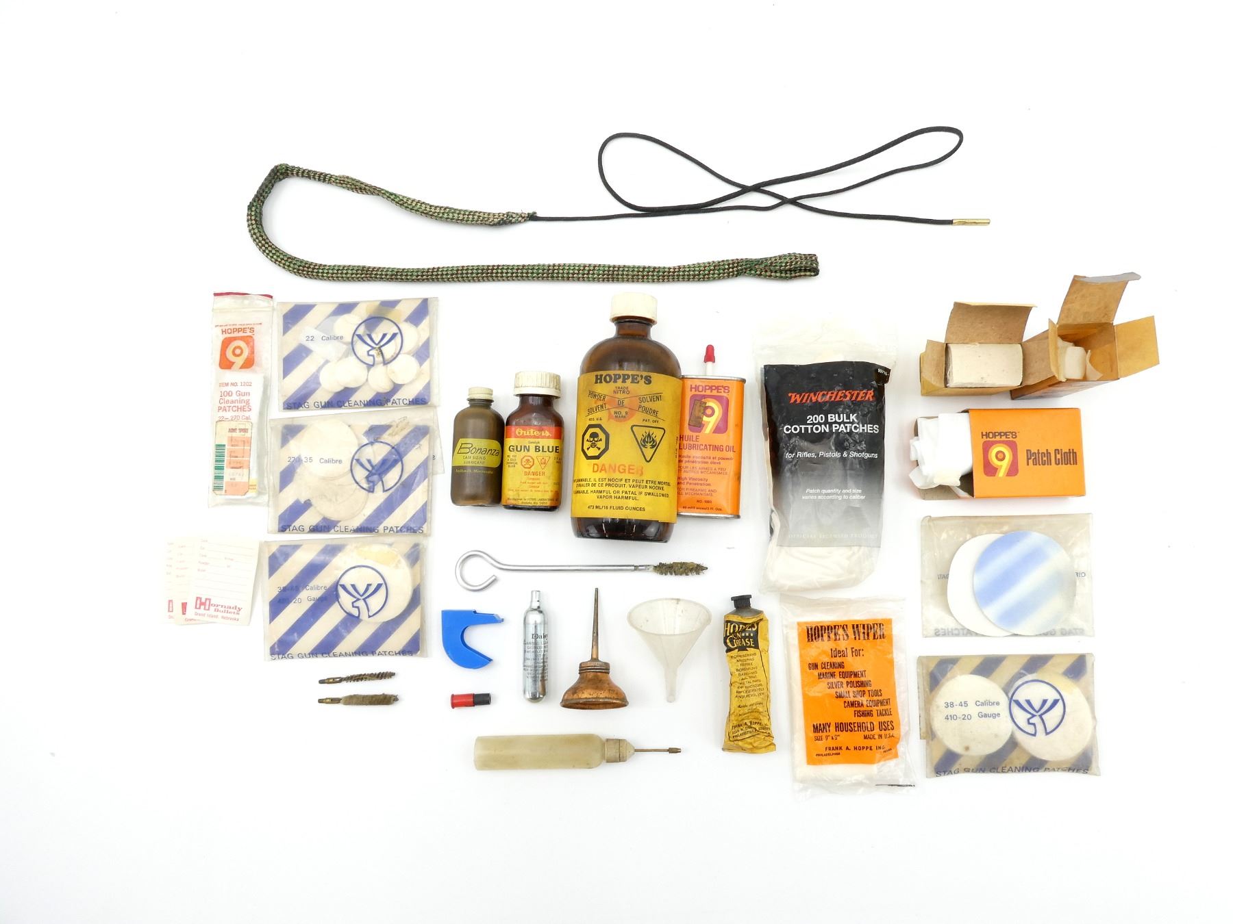 LOT INCLUDES; (1) HOPPE'S TRADE NITRO POWDER SOLVENT, 16FL OZ (473ML), MAY NOT BE COMPLETE / SOME FLUID MAY BE MISSING, (1) HOPPE'S LUBRICATING OIL, NO. 1003, 3FL OZ (89ML), MAY NOT BE COMPLETE / SOME FLUID MAY BE MISSING, (1) BONANZA CASE SIZING LUBRICANT, MAY NOT BE COMPLETE / SOME FLUID MAY BE MISSING, (1) OUTERS GUNSLICK GUN BLUE, NO. 450, 2FL OZ, MAY NOT BE COMPLETE / SOME FLUID MAY BE MISSING, (1) HOPPE'S GUN GREASE, MAY NOT BE COMPLETE / SOME GREASE MAY BE MISSING, (1) FUNNEL, (2) OILERS & (1) BORE SNAKE, ETC. SEE PHOTOS.
