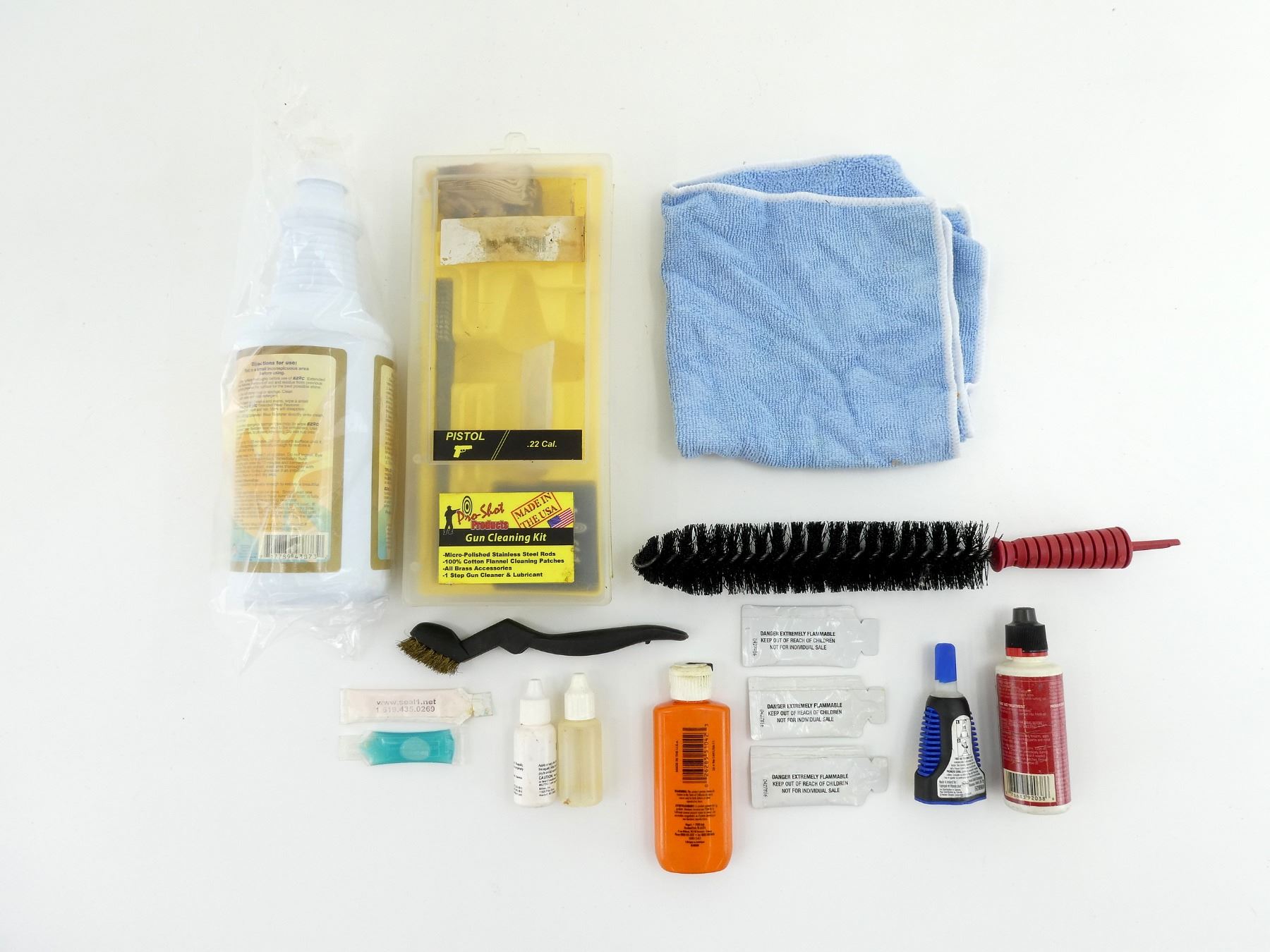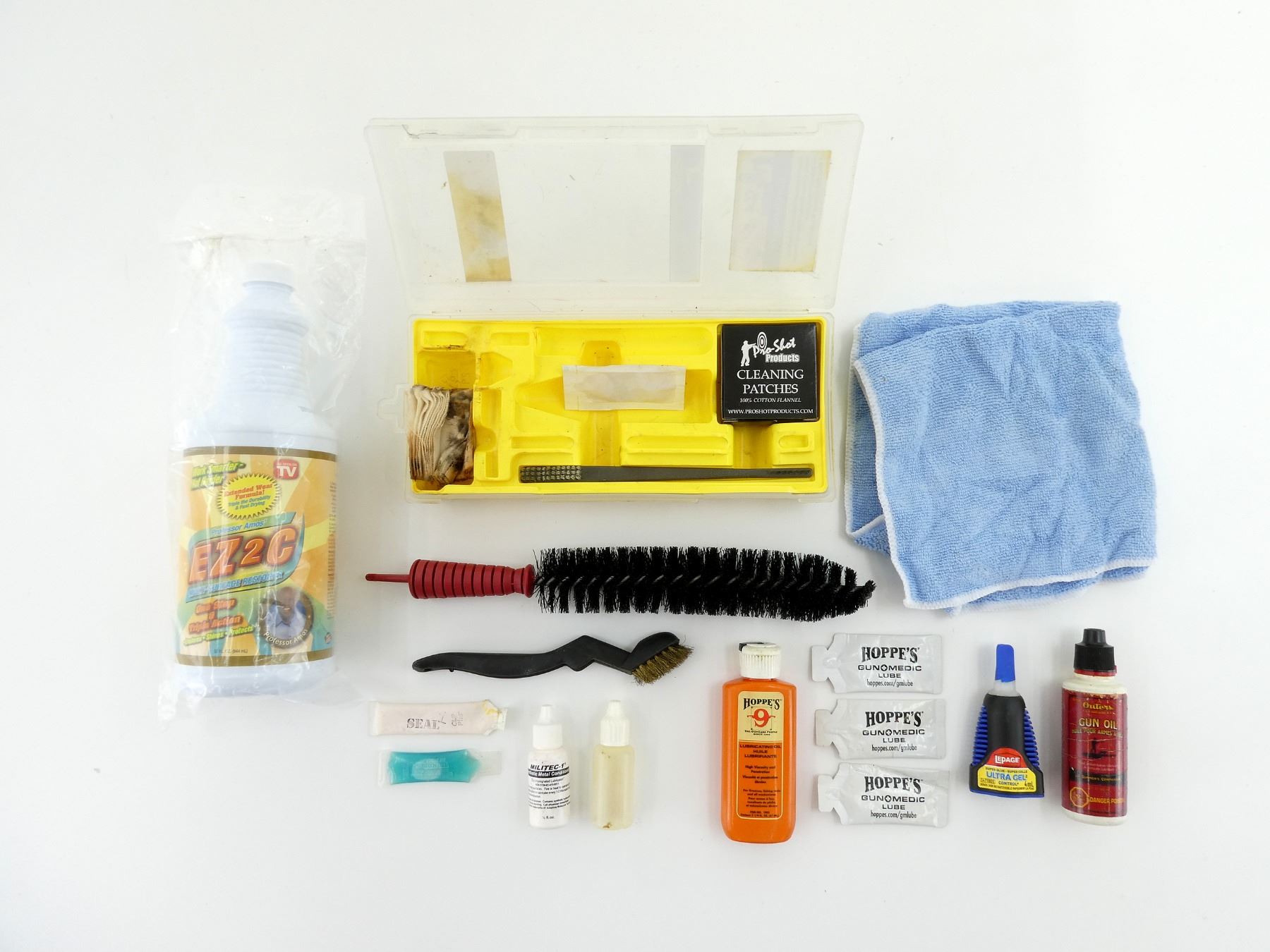 LOT INCLUDES; (1) PROFESSOR AMOS' EZ2C MULTI-SURFACE RESTORER, SEALED IN ORIGINAL PACKAGING, (1) OUTERS GUN OIL, (1) HOPPE'S LUBRICATING OIL, (1) MILITEC-1 SYNTHETIC METAL CONDITIONER, (2) CLEANING BRUSHES, (3) HOPPE'S GUNMEDIC LUBE & (1) PRO-SHOT GUN CLEANING KIT, MAY NOT BE COMPLETE / PIECES MAY BE MISSING, ETC. SEE PHOTOS.