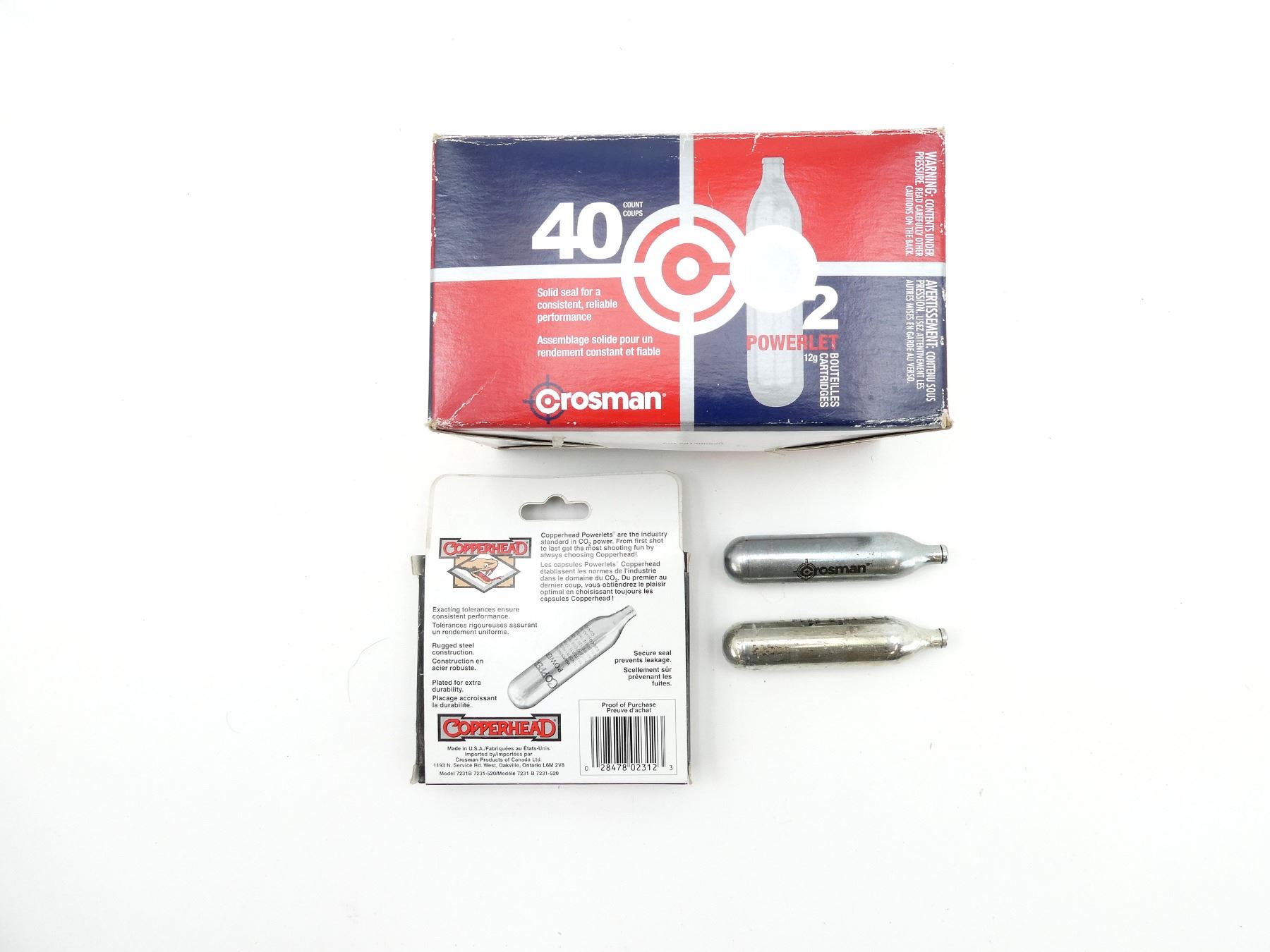 LOT INCLUDES; (1) BOX OF 40 CO2 POWERLETS, 12G CARTRIDGES, MAY NOT BE COMPLETE, PIECES MAY BE MISSING & (1) PACK OF 5 CO2 POWERLETS, 12G CARTRIDGES, MAY NOT BE COMPLETE / PIECES MAY BE MISSING. SEE PHOTOS.
