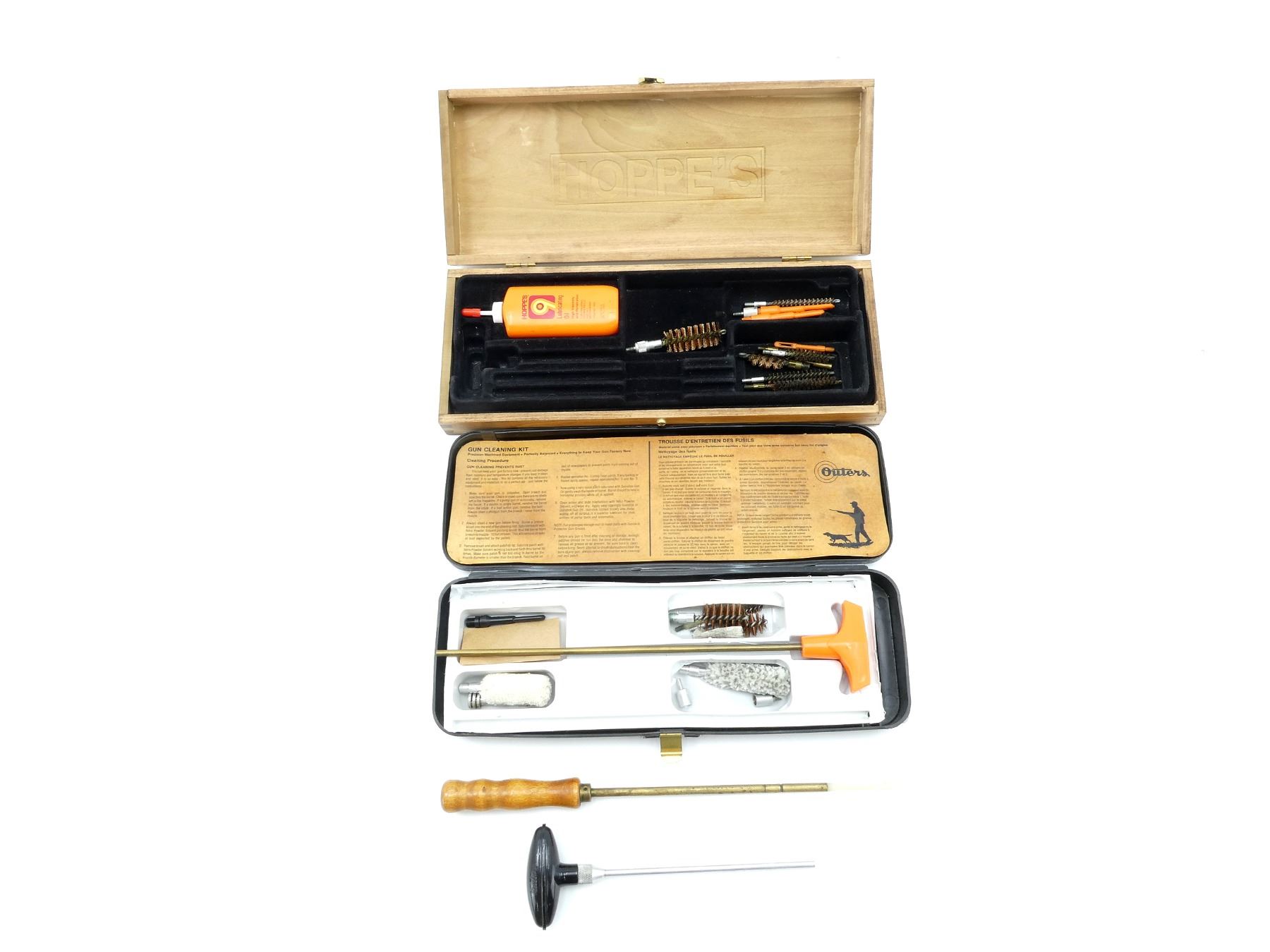 LOT INCLUDES; (1) HOPPE'S GUN CLEANING KIT, INCLUDES; JAGS, BRUSHES, LUBRICATING OIL, ETC., MAY NOT BE COMPLETE / PIECES MAY BE MISSING, (1) OUTERS GUN CLEANING KIT, INCLUDES; ROD, JAGS, BRUSHES, MOPS, ETC., MAY NOT BE COMPLETE / PIECES MAY BE MISSING & (2) ASSORTED CLEANING RODS, MAY NOT BE COMPLETE / PIECES MAY BE MISSING. SEE PHOTOS.