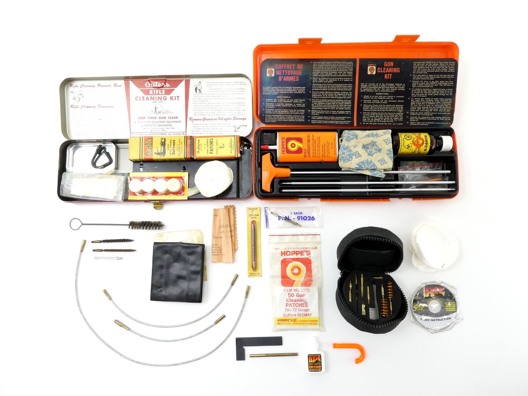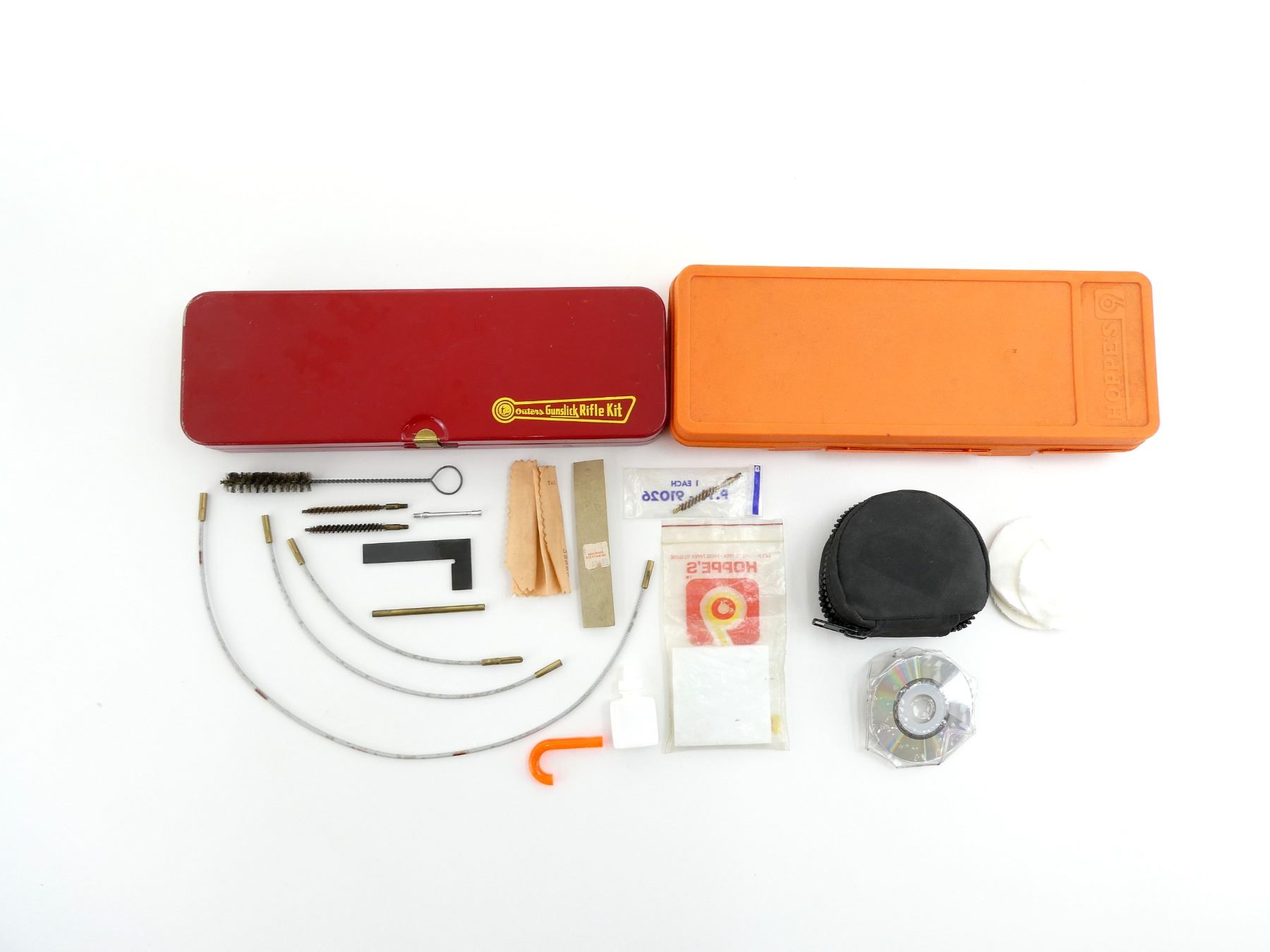 LOT INCLUDES; (1) OUTERS RIFLE CLEANING KIT, INCLUDES; PATCHES & SOLVENT, MAY NOT BE COMPLETE / PIECES MAY BE MISSING (1) HOPPE'S GUN CLEANING KIT, INCLUDES; 3-PIECE CLEANING ROD, BRUSH, PATCHES, SOLVENT & LUBRICATING OIL, ETC. & (1) OTIS GUN CLEANING KIT, INCLUDES; ROD ATTACHMENTS, BRUSHES, PATCHES, BORE CLEANSER, BORE REFLECTOR, ETC., APPEARS NEW OLD STOCK, ETC. SEE PHOTOS.