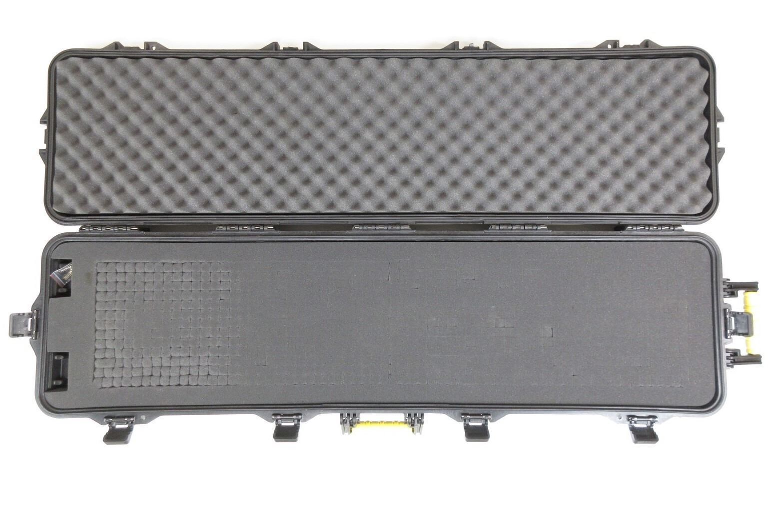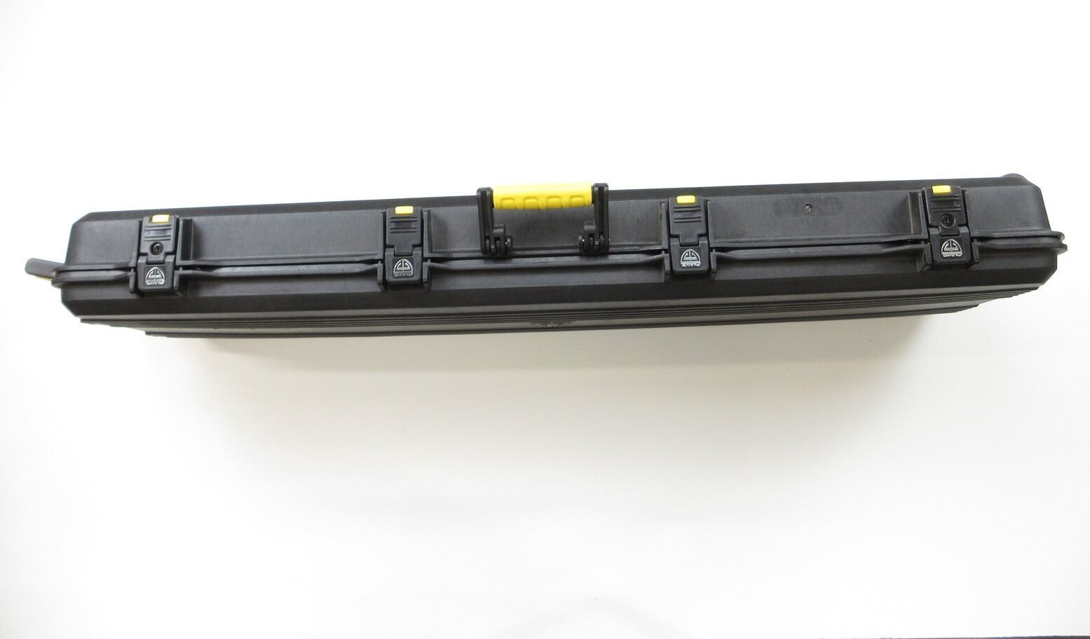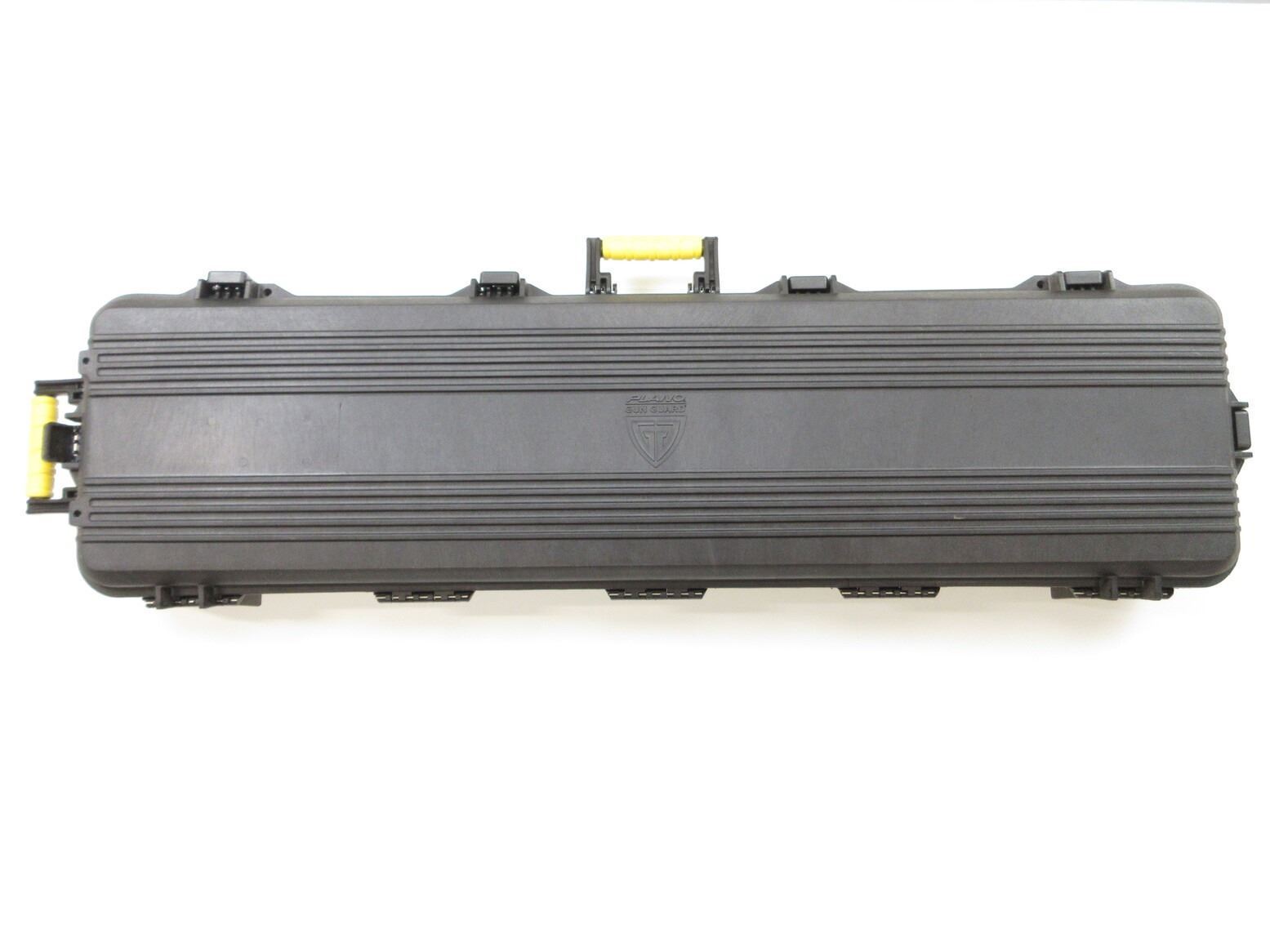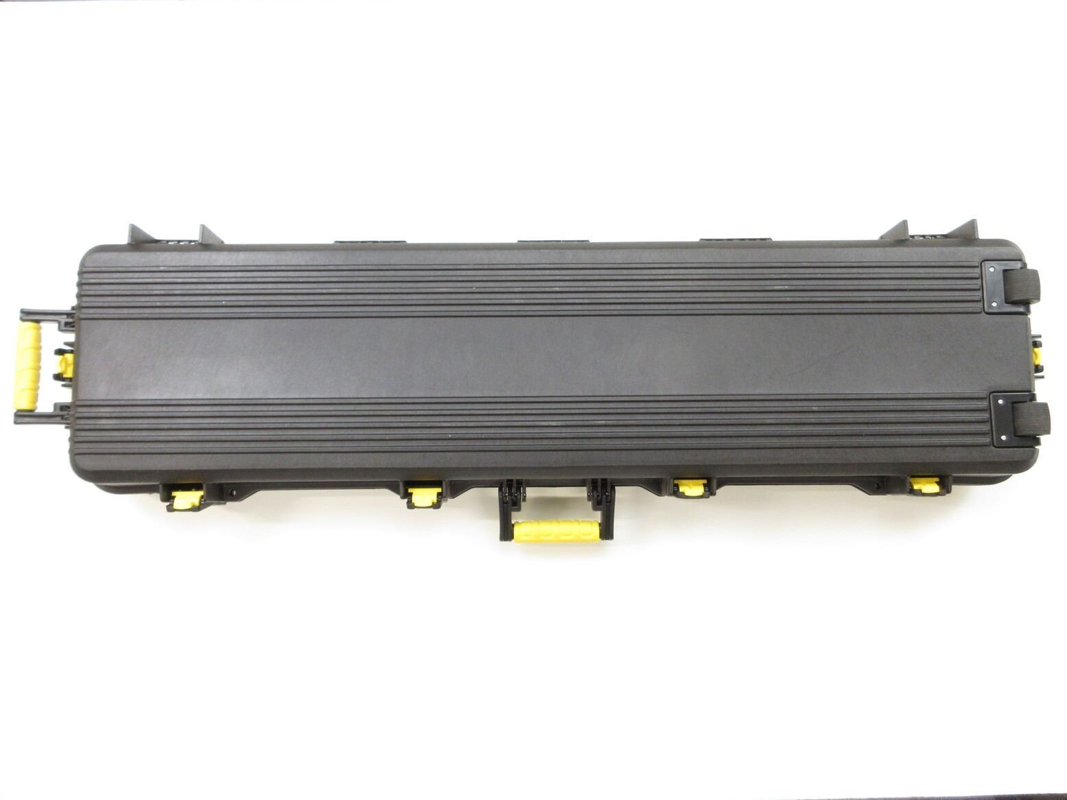 PLANO PADDED HARD DOUBLE RIFLE CASE , (1) BLACK HARD PLASTIC PADDED RIFLE CASE WITH ROLLING WHEELS AND PULL HANDLE, KEYS INCLUDED, APPROX. 54X16X7.