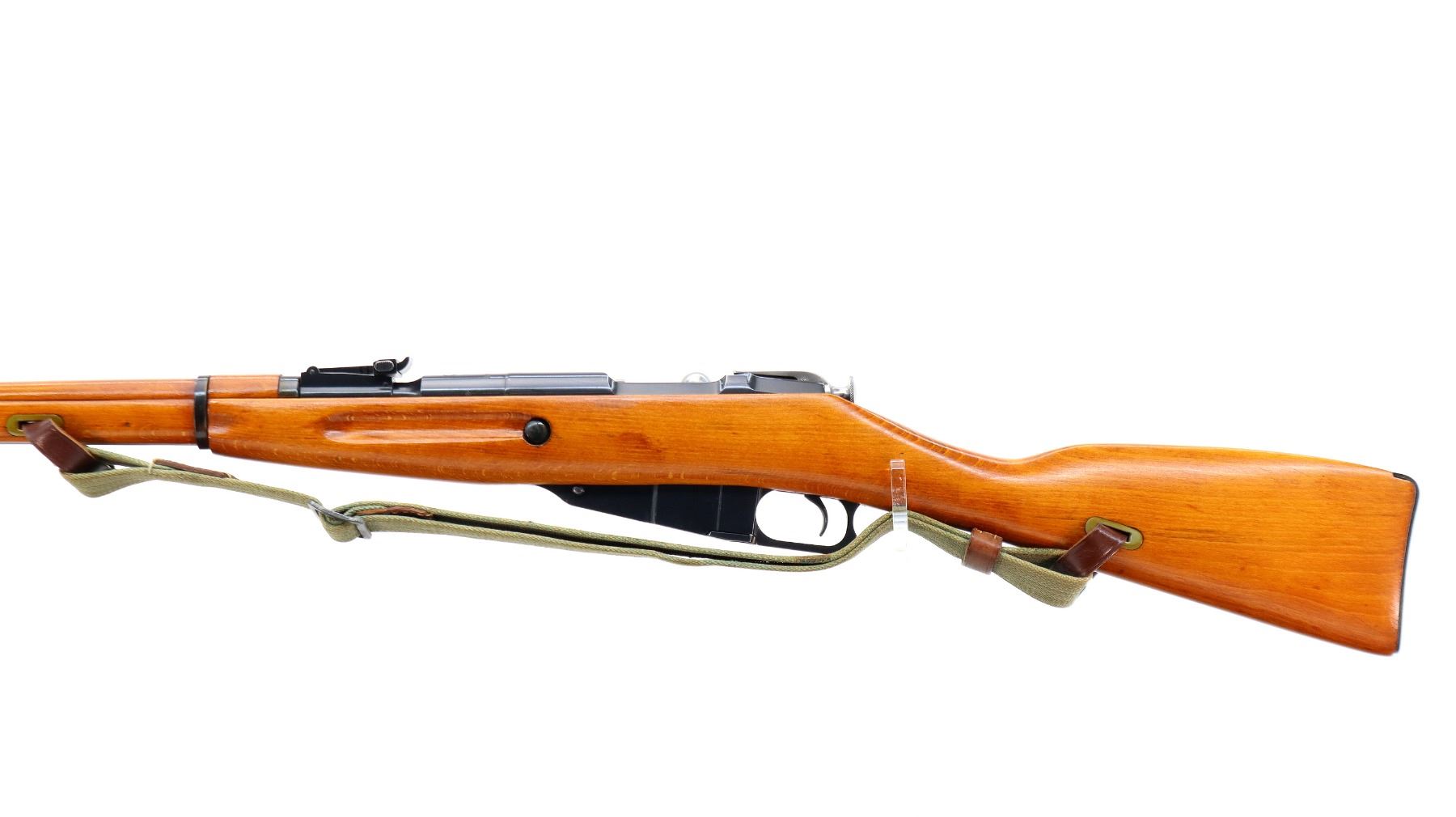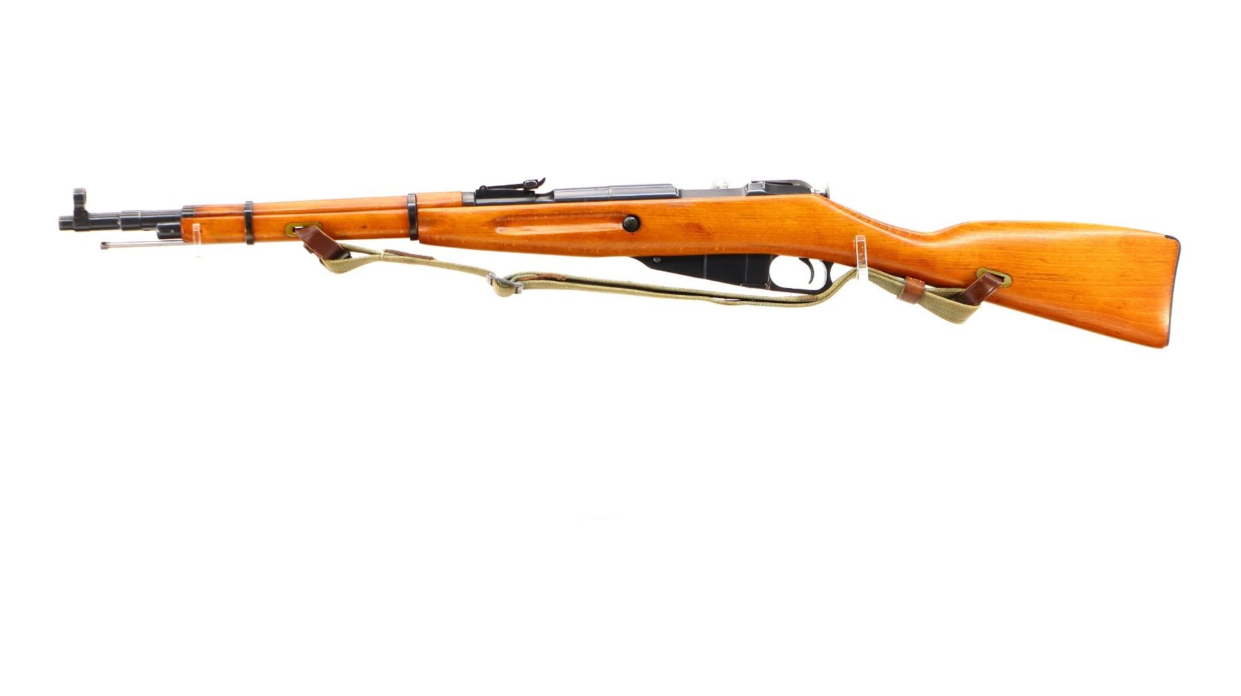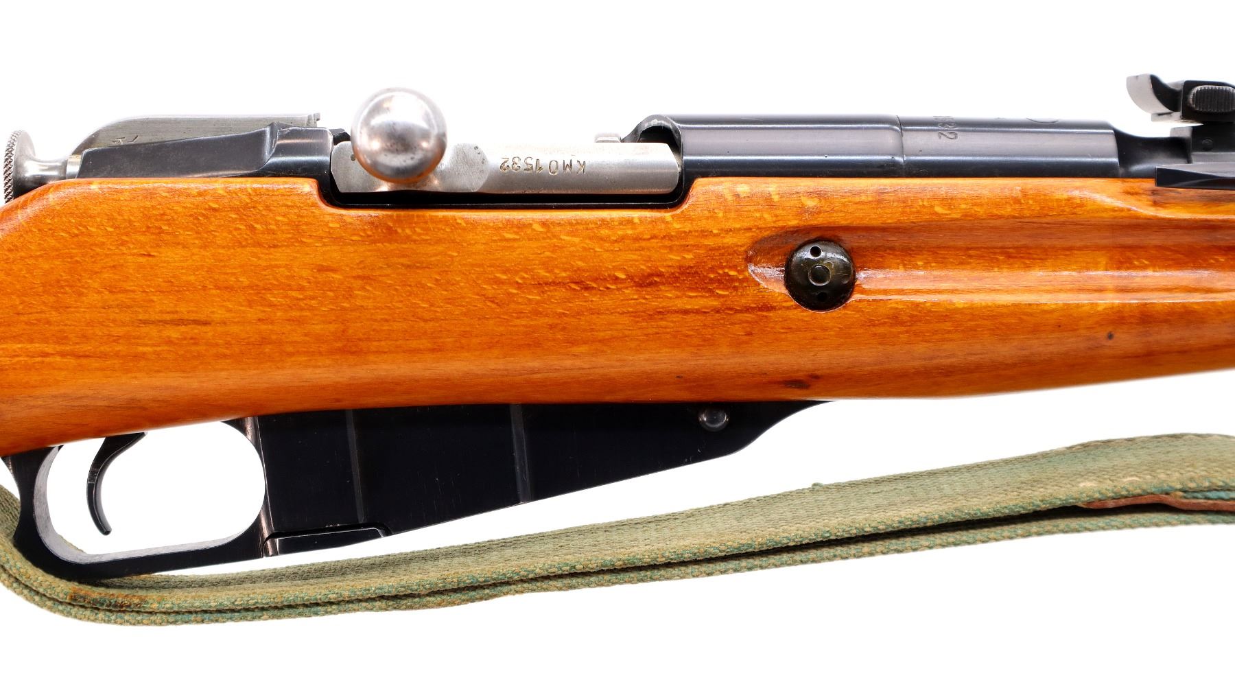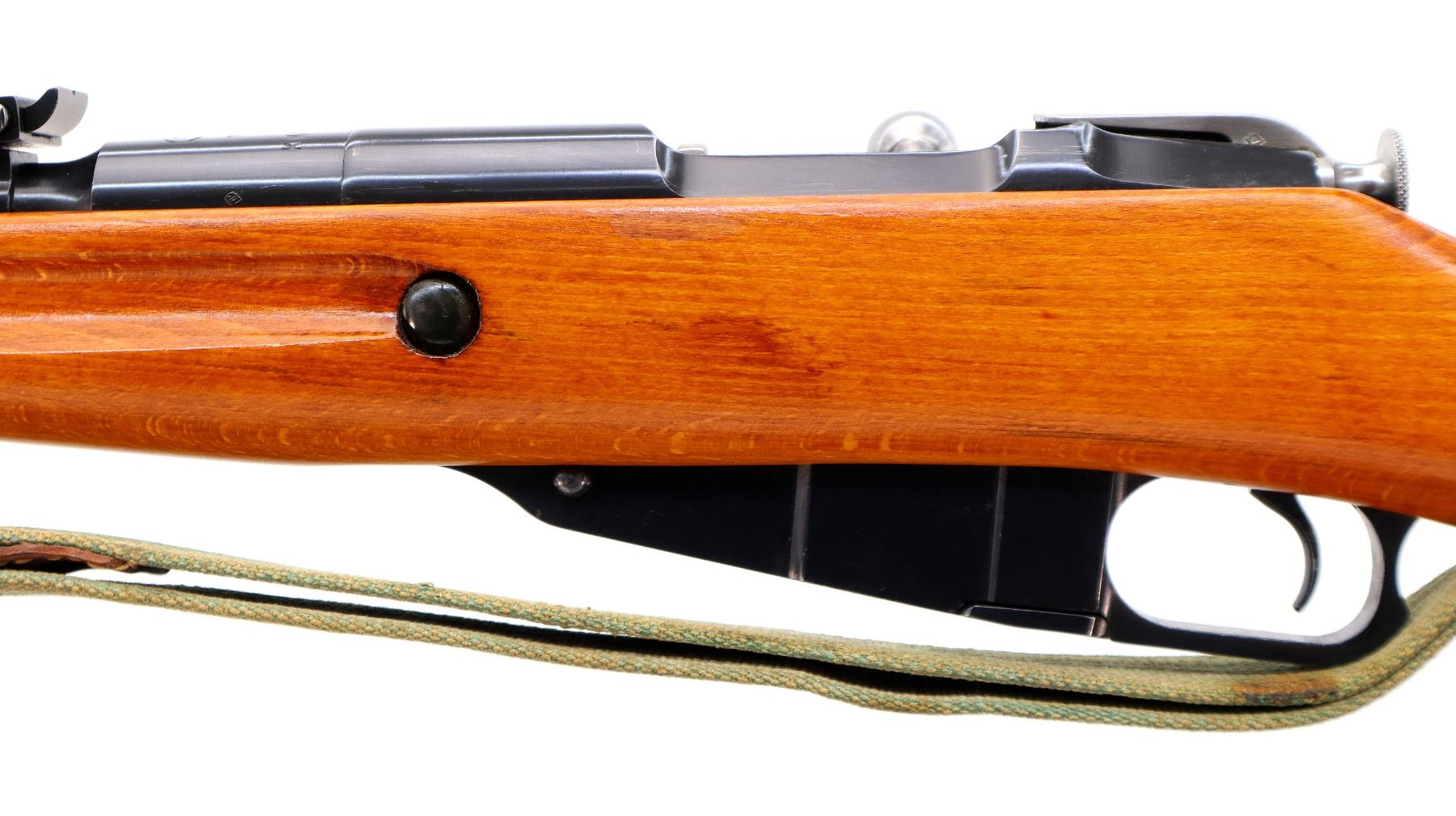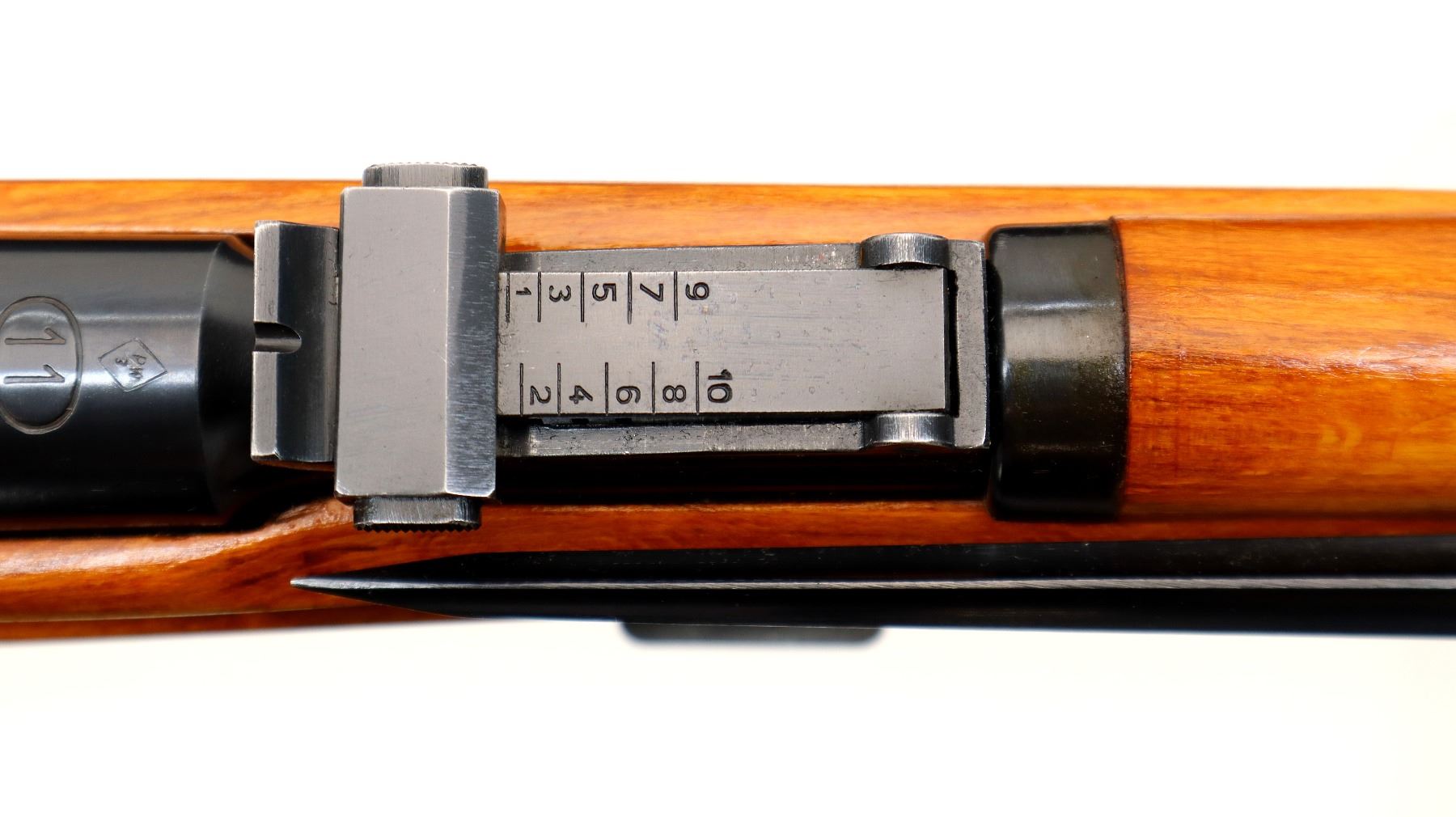Main Description: Manufactured by Factory 11, 1954, visible serial numbers match. Post front sight with hood and ramp, adjustable u notched rear sight, blued finish, round receiver, silver bolt with straight handle. Two piece full military wood stocks, finger grooved forearm, straight grip, smooth steel butt plate, sling slots with leather and green canvas military sling, cleaning rod and attached folding cruciform bayonet.