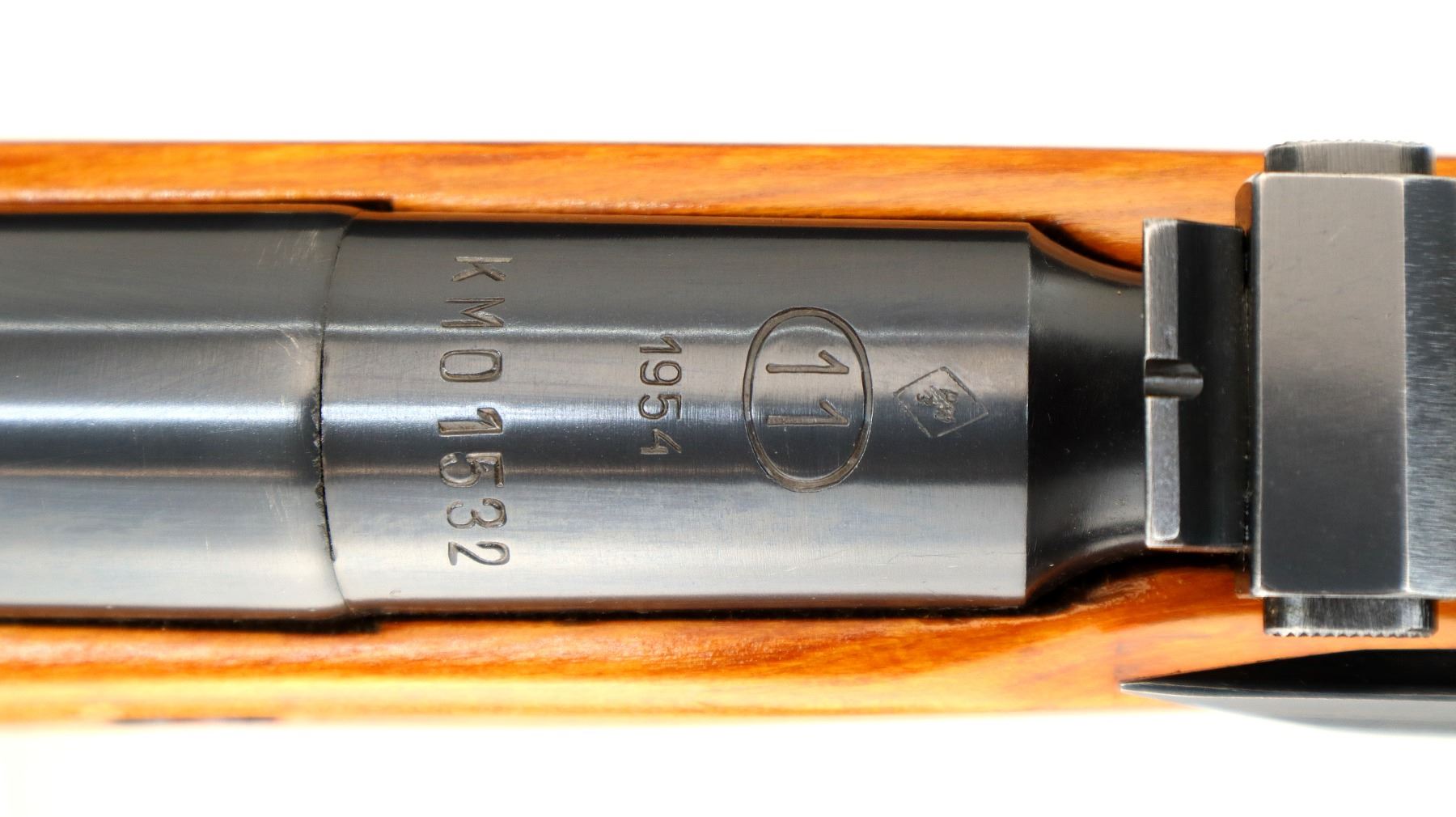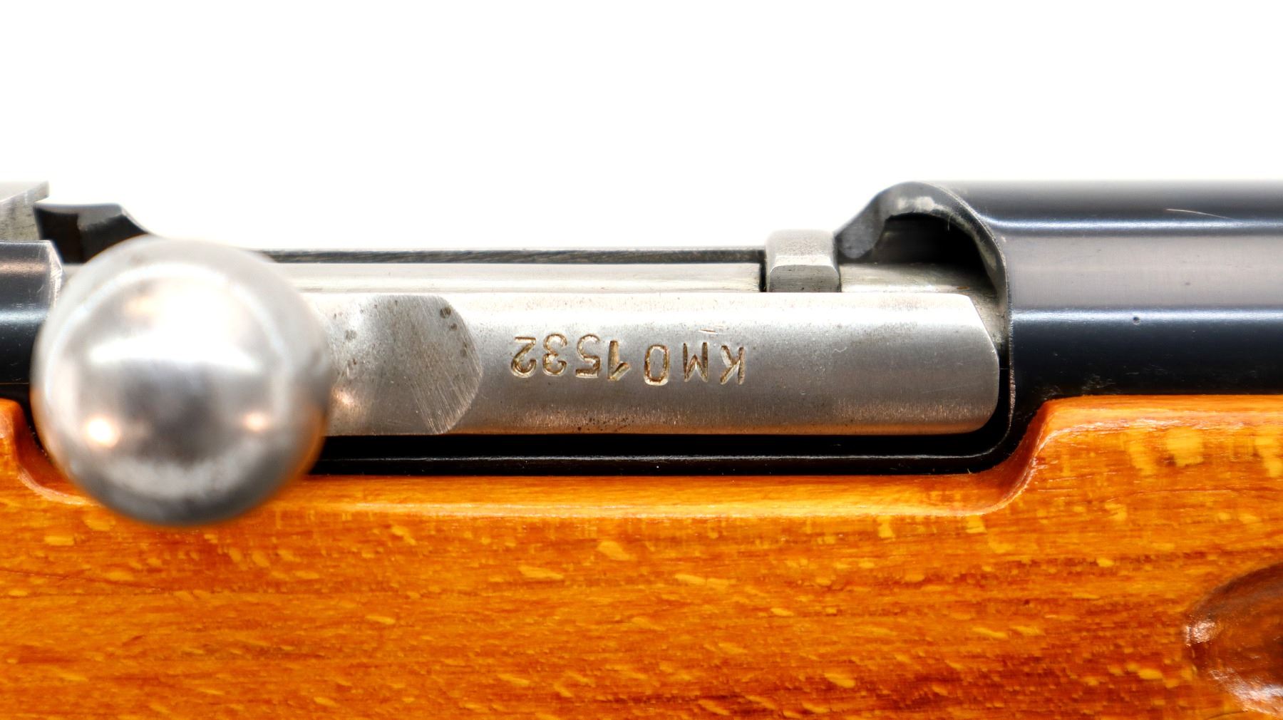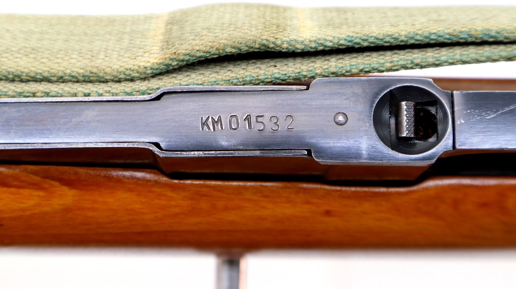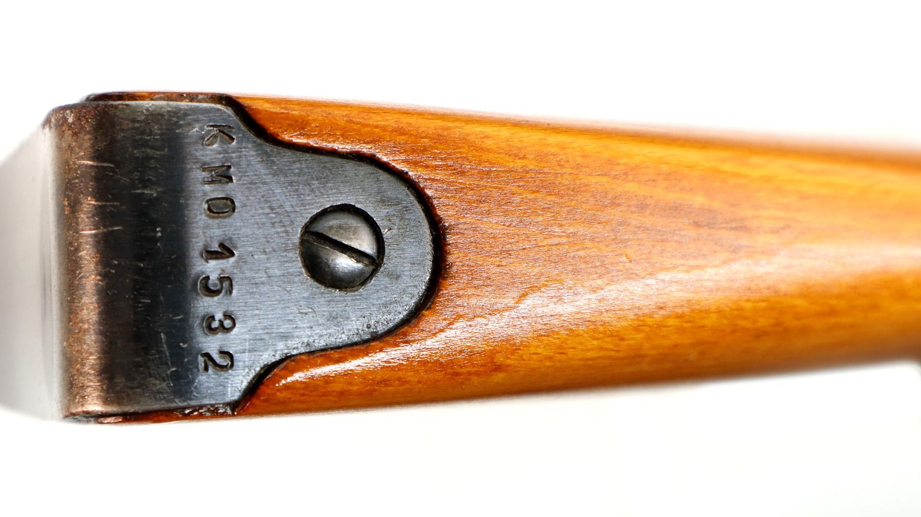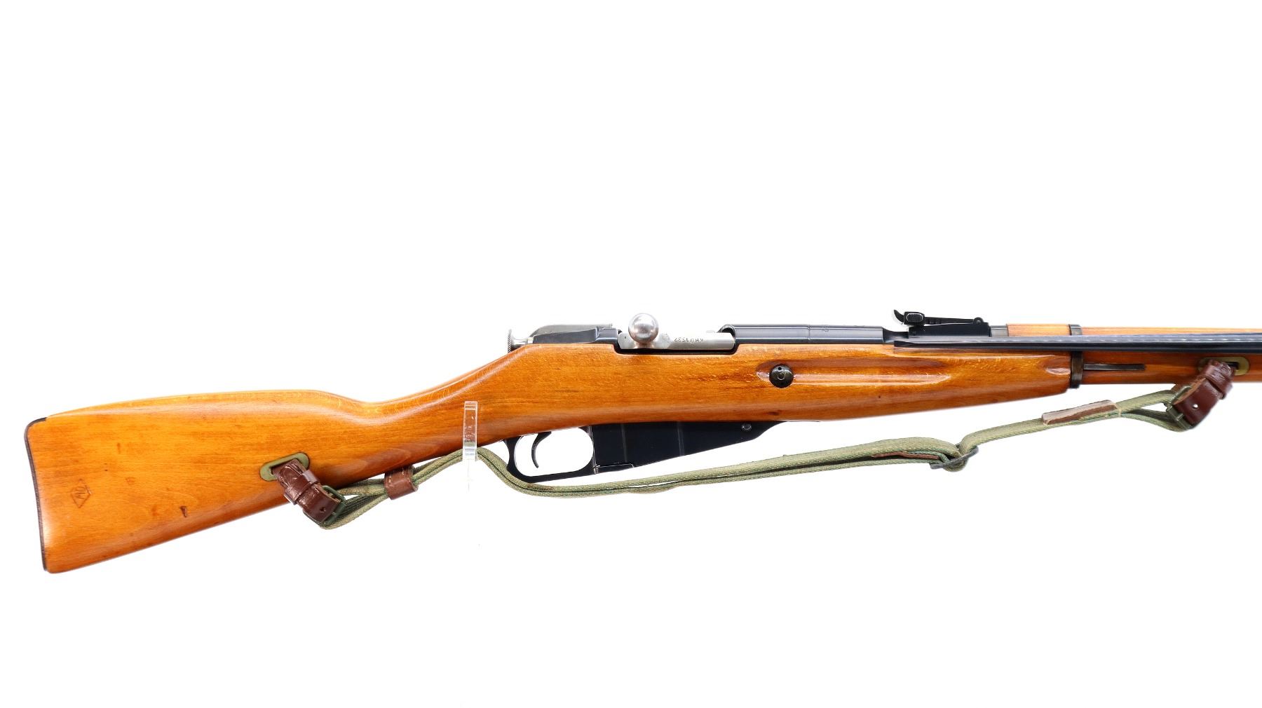 Main Description: Manufactured by Factory 11, 1954, visible serial numbers match. Post front sight with hood and ramp, adjustable u notched rear sight, blued finish, round receiver, silver bolt with straight handle. Two piece full military wood stocks, finger grooved forearm, straight grip, smooth steel butt plate, sling slots with leather and green canvas military sling, cleaning rod and attached folding cruciform bayonet.