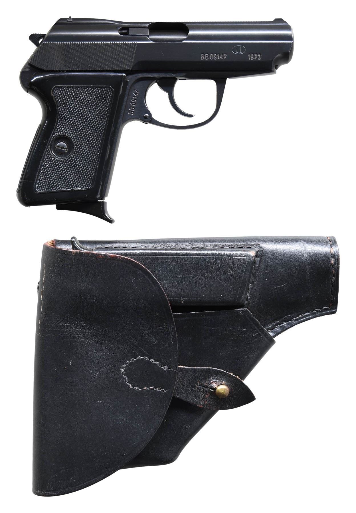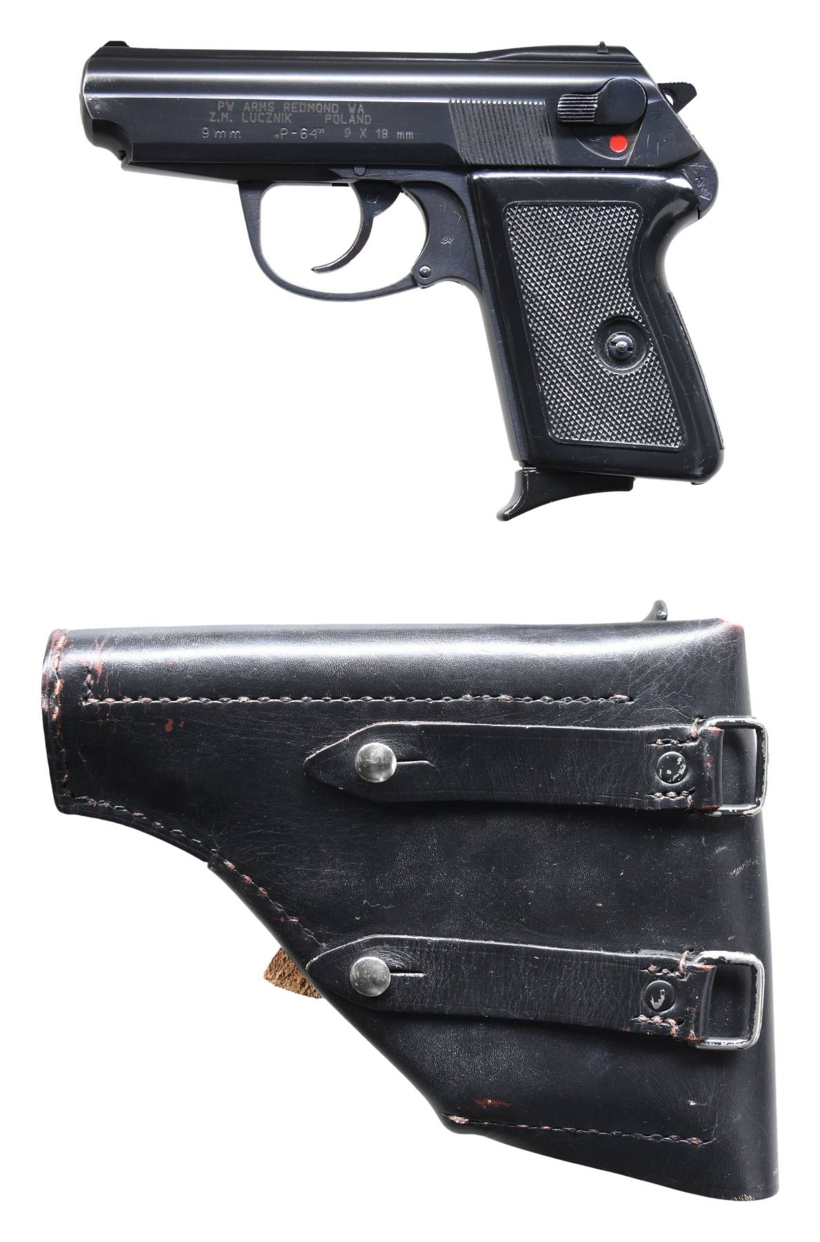 HOLSTER. Cal. 9x18mm. S# BB09147. Bbl.3 1/4". Model P-64 semi-automatic pistol mfg. in Poland at the Radom arsenal in 1973, and later imported by PW Arms. The left side of the slide is marked with PW Arms' importer information above the model and cal. designations, with the S#, followed by a Radom encircled "11", and "1973" marked on the right. Metal components exhibit a blue finish overall. Frame is mounted with 2-piece inverse checkered black synthetic grips. Slide features a checkered matte rib, with a fixed blade front sight and dovetailed square notch rear sight. All serialized parts are matching and include the frame and slide. MAGS: 2 6-rd. mags., with black synthetic grip extensions. 1 mag. is matching via "09147" in electro-pencil. UNATTACHED ACCESSORIES: Polish 1963 dated black leather holster. CONDITION: metal components retain the vast majority of their arsenal blue finish, exhibiting a few spots of light wear and thinning, as well as a few superficial marks from handling and storage. Brilliant mirror bore, exhibiting some grease, while retaining well defined rifling throughout. Grips show some superficial marks from handling and storage, but otherwise remain sturdy and serviceable. Holster is very good, remaining malleable, and exhibiting some scattered handling marks, as well as a few spots of age related cracking. (25-2390/MLW). CURIO. $150-250.