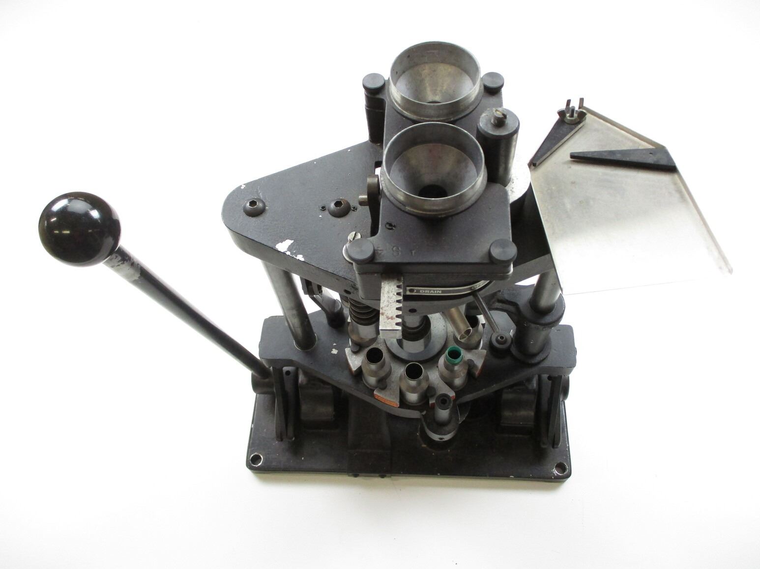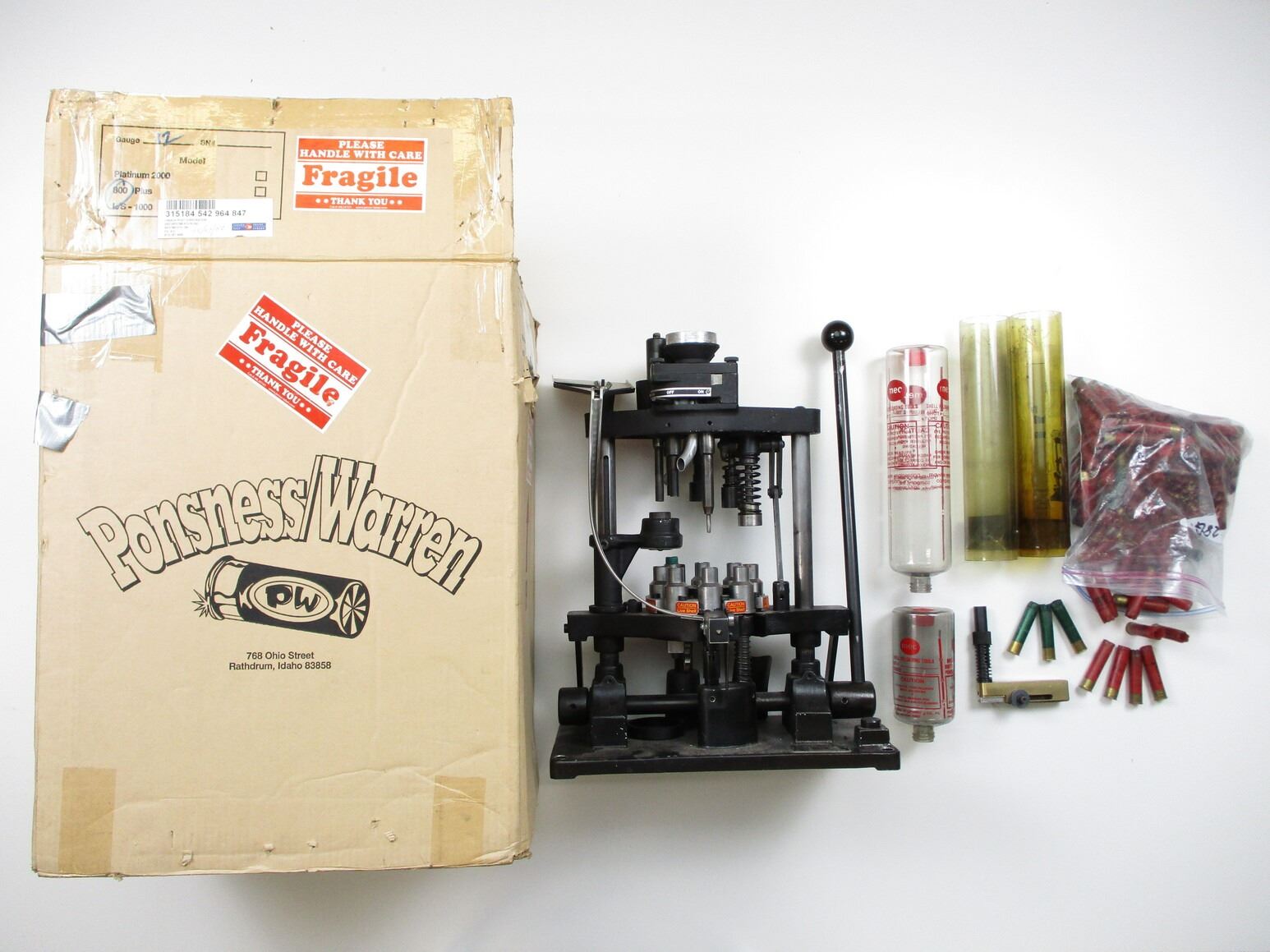 PONSNESS WARREN 28 GAUGE SHOTSHELL PRESS LOT, LOT INCLUDES; (1) SIZE-O-MATIC PRESS WITH (4) BOTTLES, (1) PRIMING TRAY, IN ORIGINAL BOX & ASSORTED 28 GAUGE SHOTSHELL CASES. PRESS MAY BE INCOMPLETE OR NEED ADJUSTMENT(S). SEE PHOTOS.