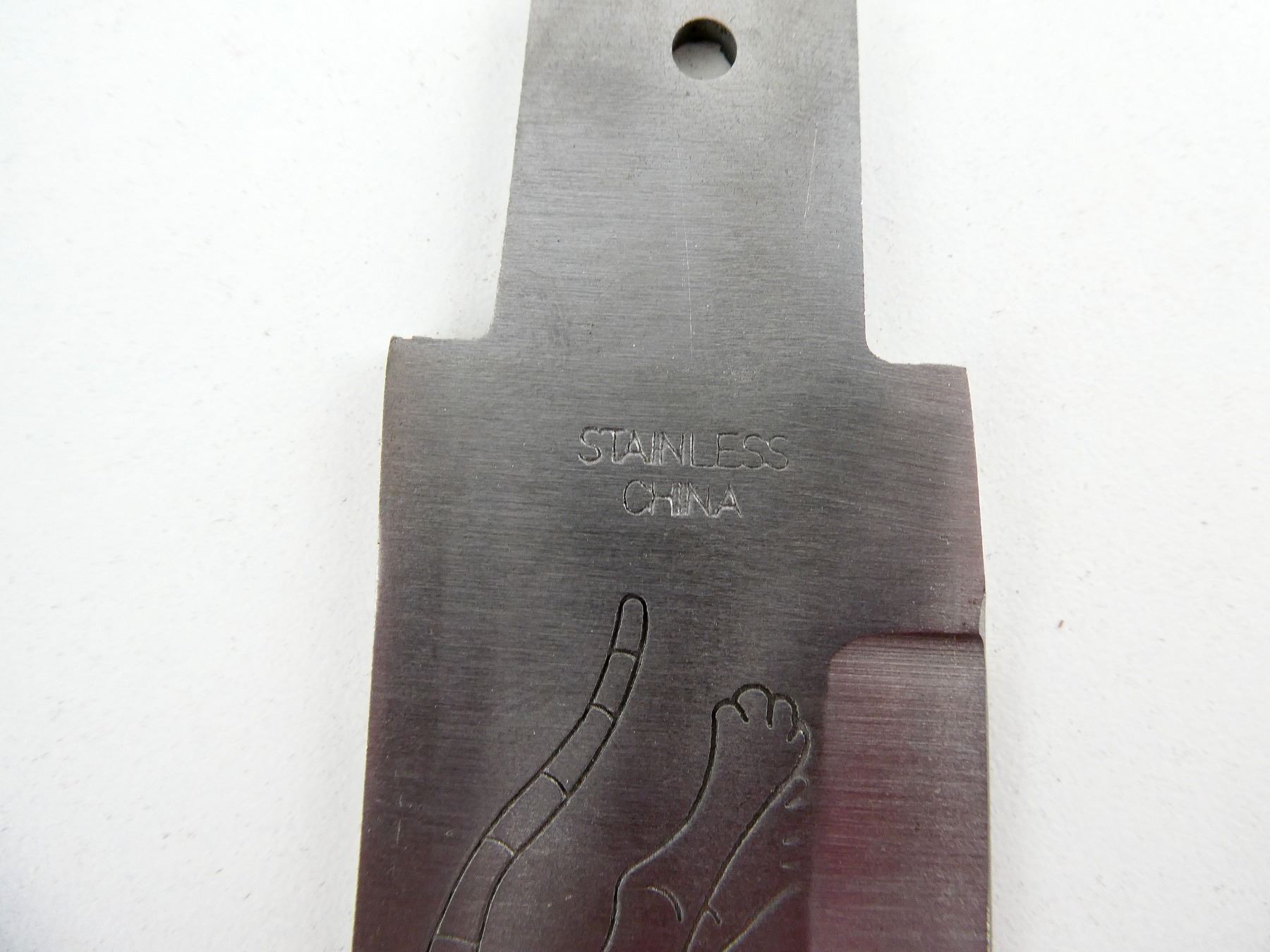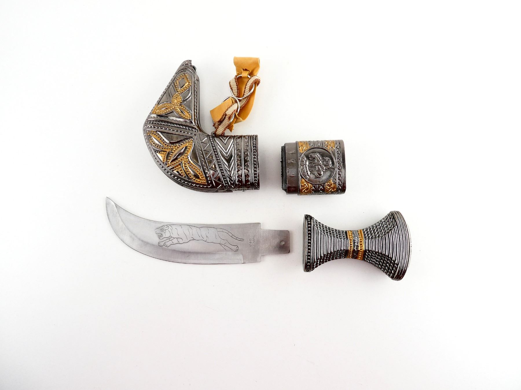 (1) STAINLESS STEEL BLADE, ENGRAVED WITH A TIGER, ORNATE METAL HANDLE, SHOWS WEAR & TEAR / USE MARKS, BLADE BROKEN (DETACHES), BLADE OVERALL LENGTH APPROX. 5.5", OVERALL LENGTH APPROX. 9.25", WITH ORNATE METAL SHEATH, BROKEN (CHIPS). SEE PHOTOS.