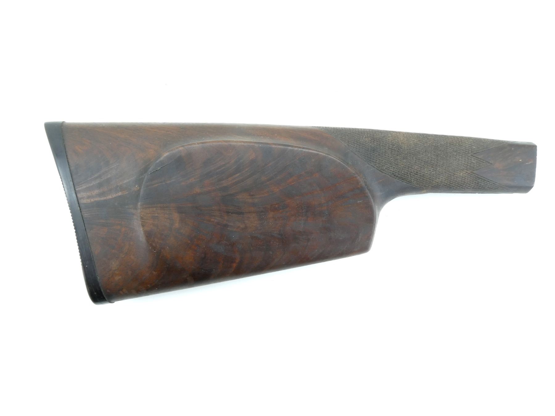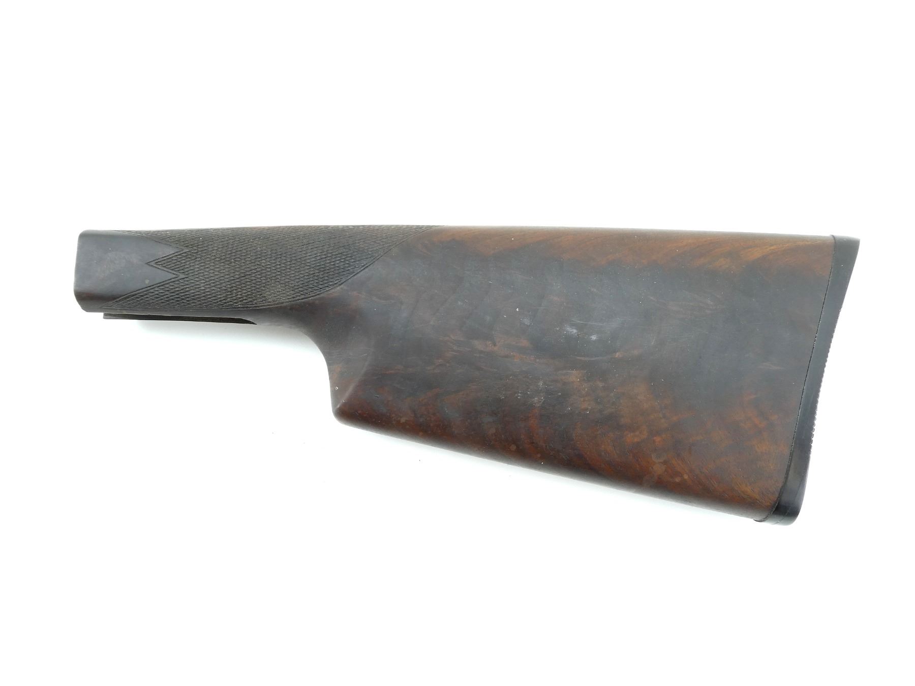 (1) WOODEN BUTT STOCK, CHECKERED, UNMARKED, WITH LH CHEEK REST, OVERALL LENGTH APPROX. 13". MAY REQUIRE FITTING. SEE PHOTOS.