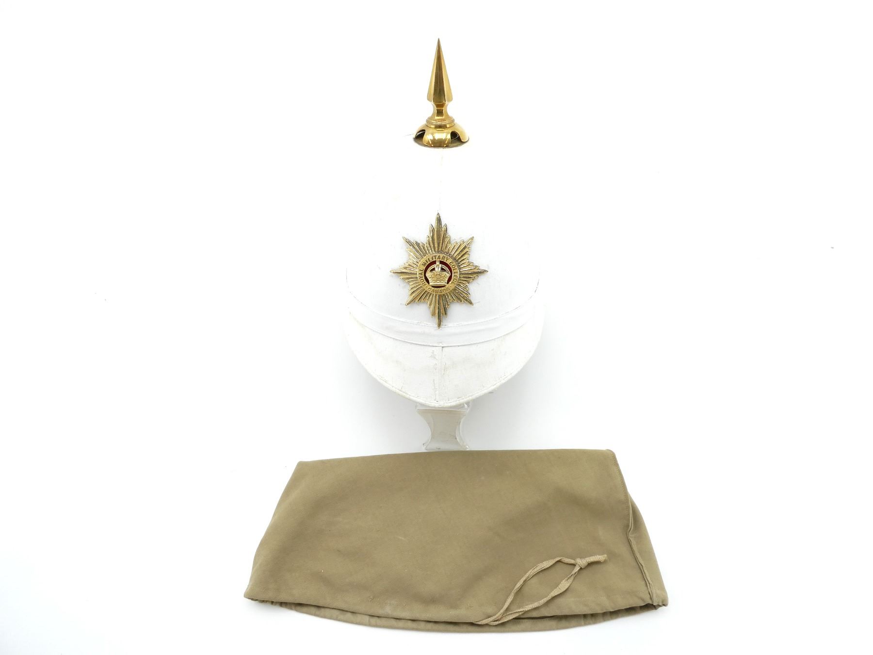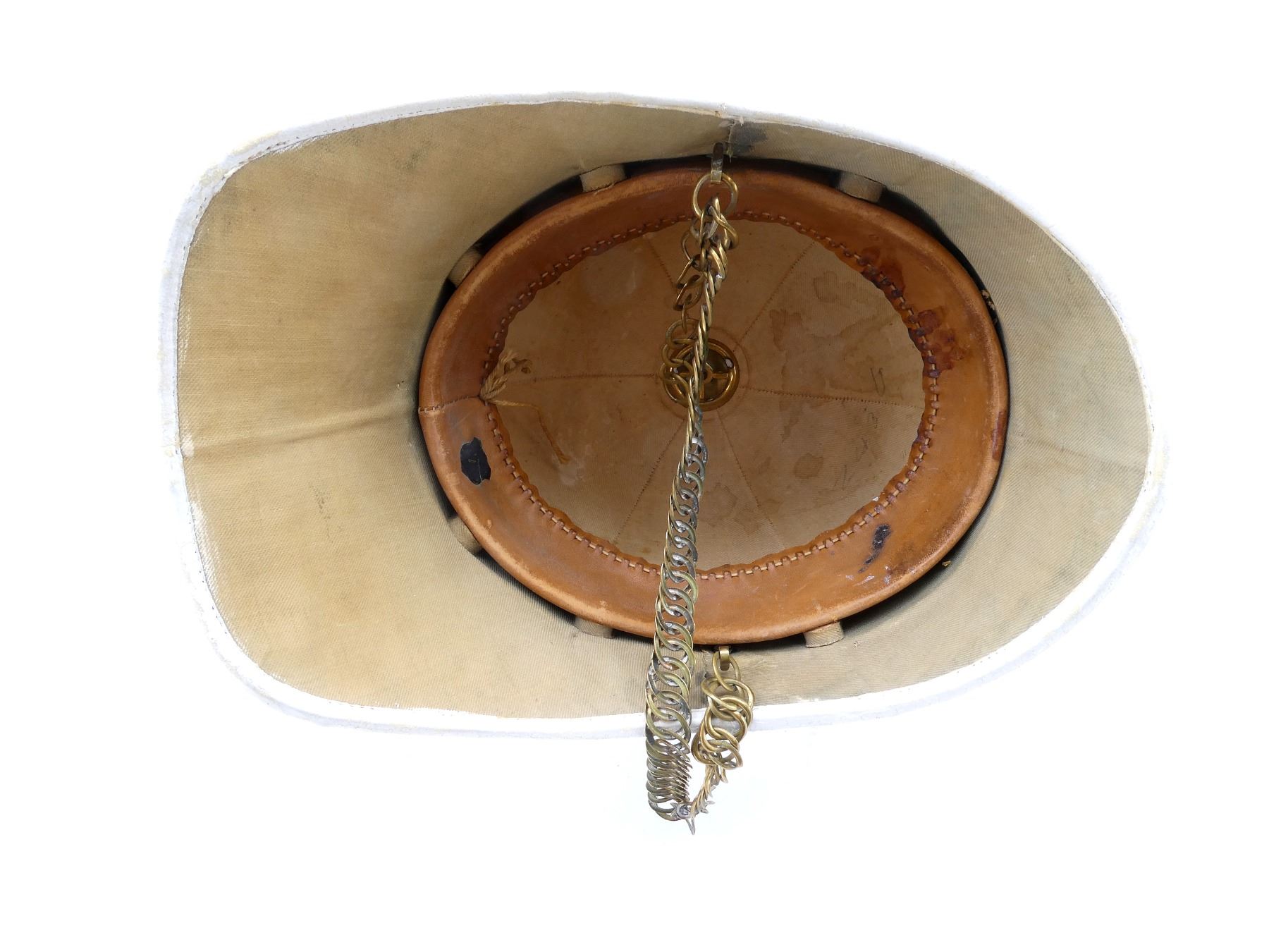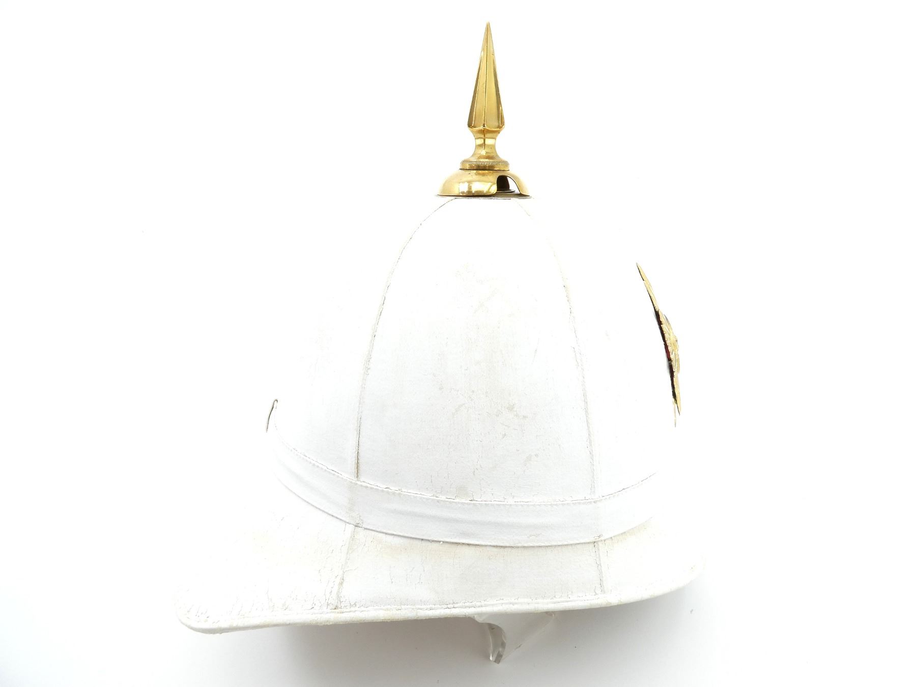 (1) WHITE PAINTED CANVAS / FIBER PITH HELMET WITH BRASS ROYAL MILITARY COLLEGE CANADA CAP BADGE, CAP BADGE WITH KING'S CROWN, BRASS SPIKE ON TOP OF HELMET, LEATHER HEAD BAND, LEATHER IS SOFT, TAN CANVAS INSIDE HELMET, HELMET MARKED: "2436", BRASS CHAIN CHIN STRAP, TAN CANVAS HELMET COVER WITH MATCHING NUMBER: "2436", NO OTHER VISIBLE MARKINGS, DRAWSTRING CLOSURE. SEE PHOTOS.