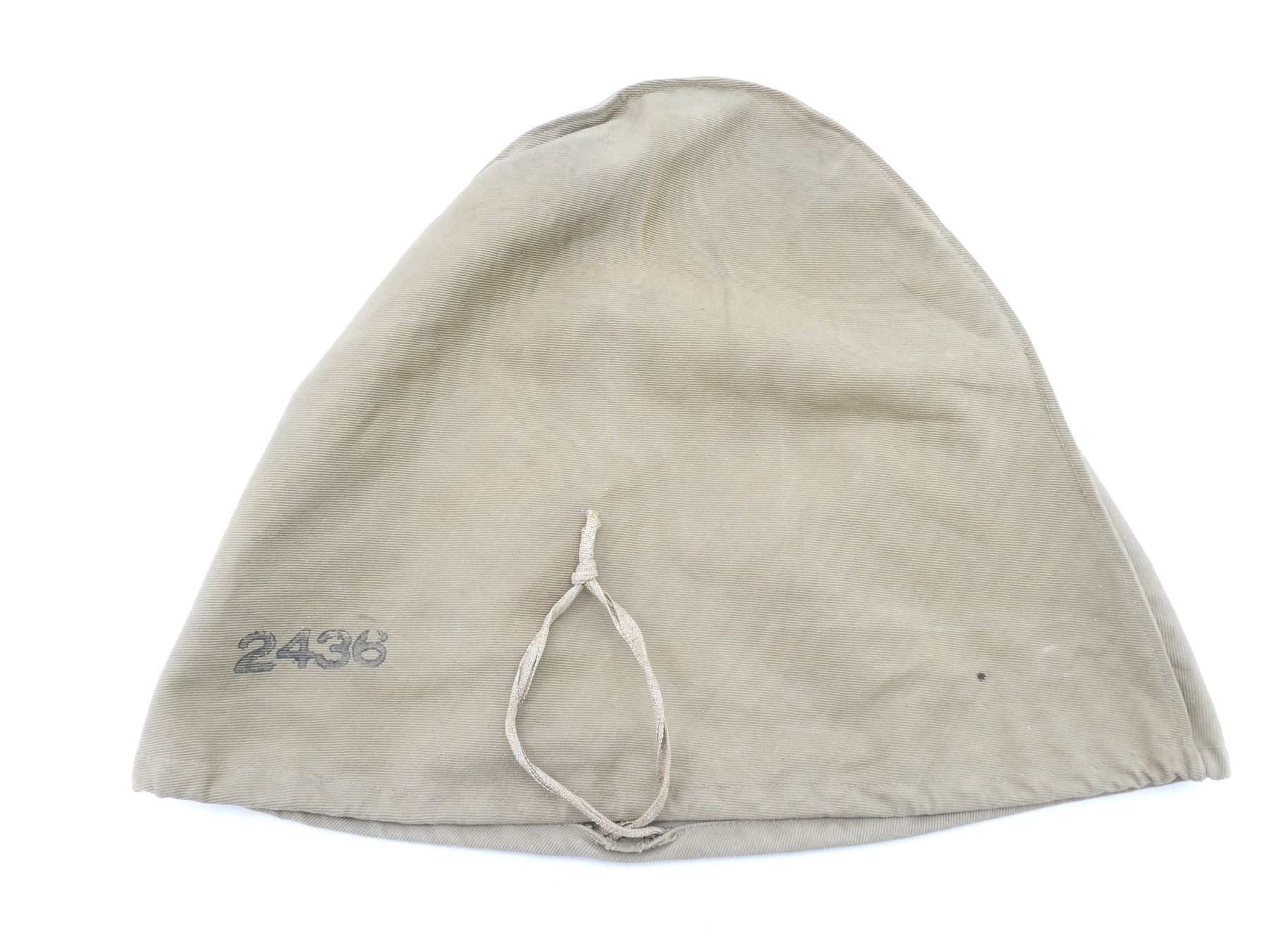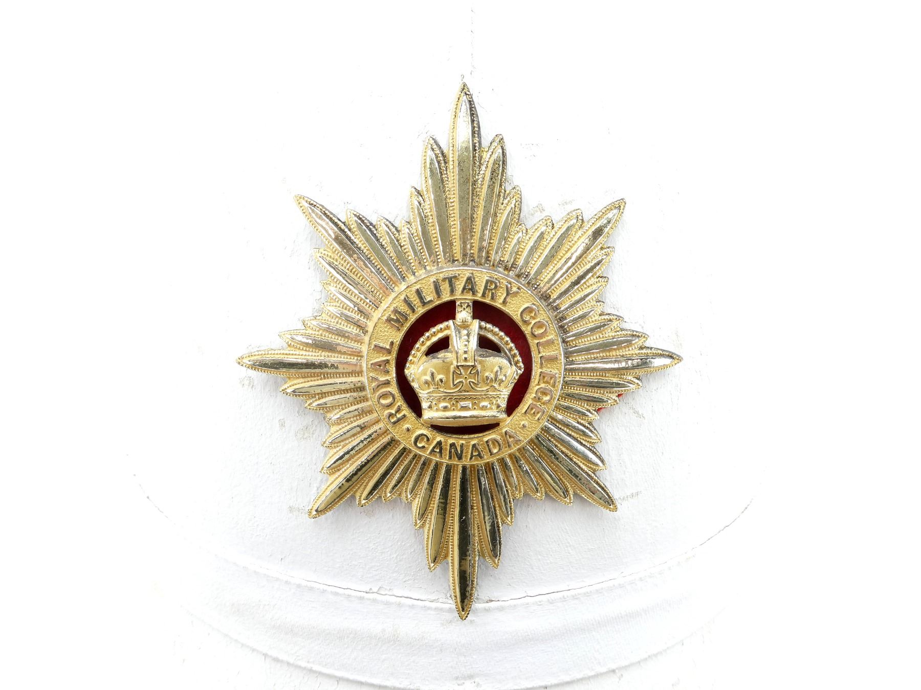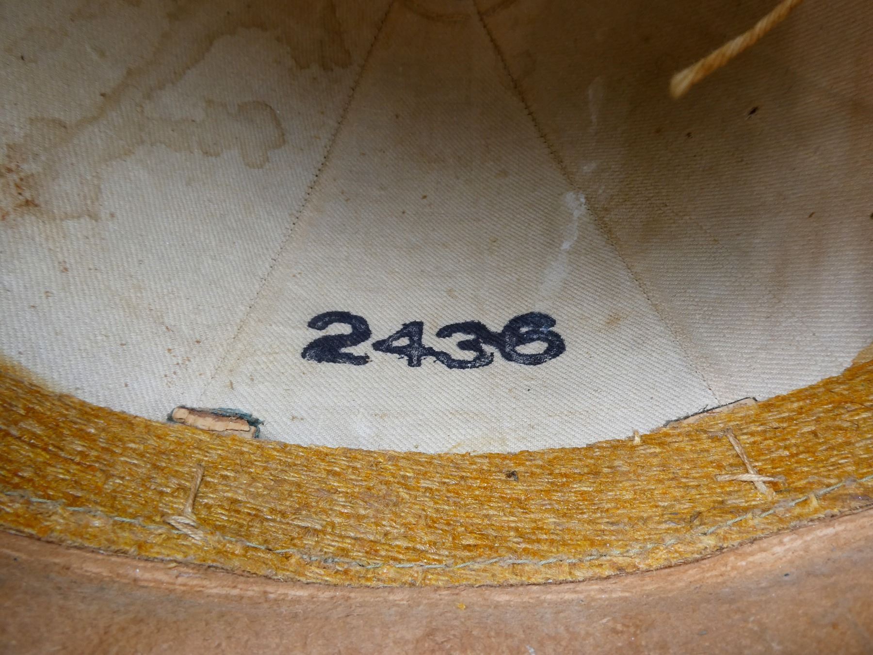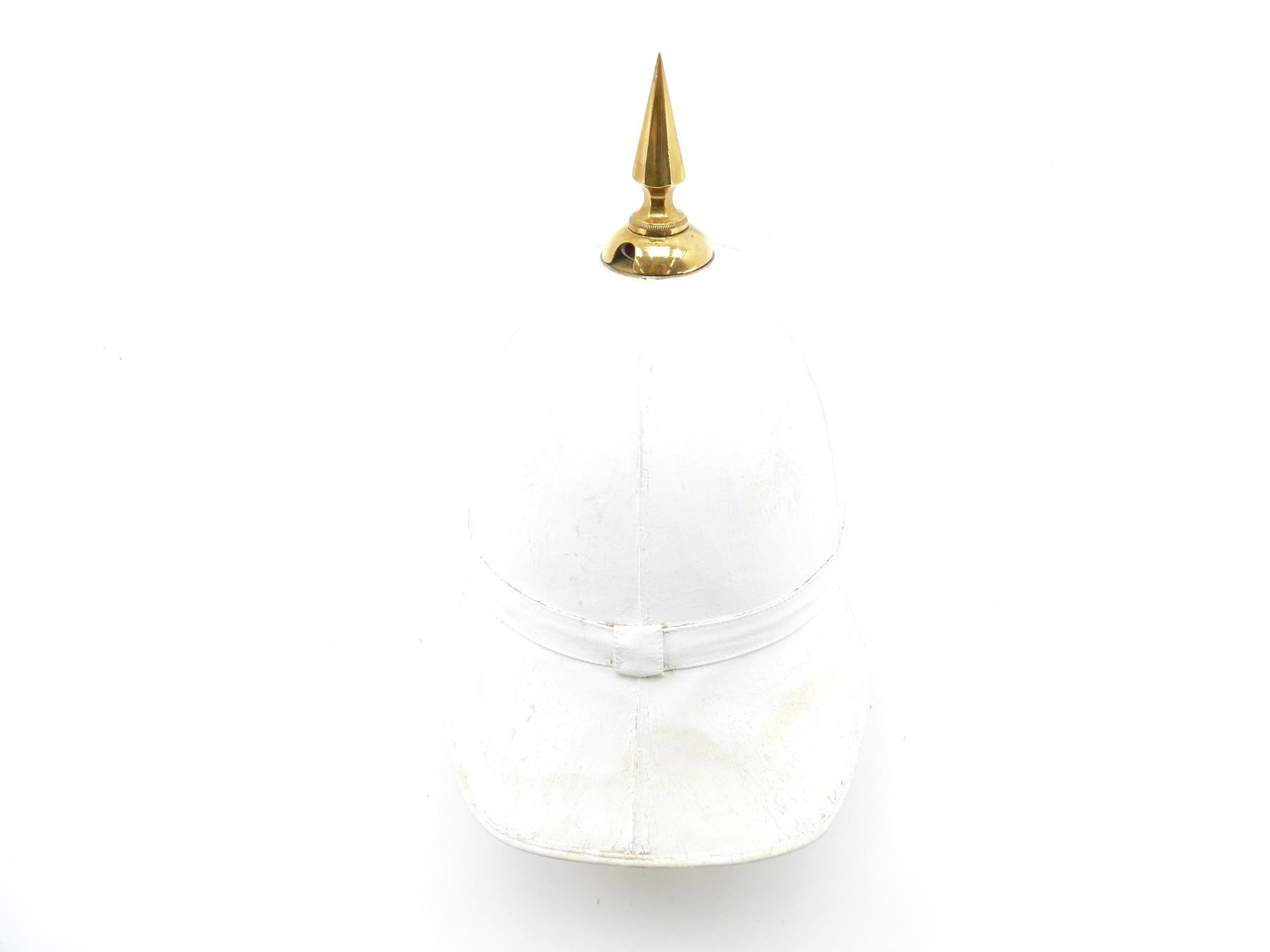 (1) WHITE PAINTED CANVAS / FIBER PITH HELMET WITH BRASS ROYAL MILITARY COLLEGE CANADA CAP BADGE, CAP BADGE WITH KING'S CROWN, BRASS SPIKE ON TOP OF HELMET, LEATHER HEAD BAND, LEATHER IS SOFT, TAN CANVAS INSIDE HELMET, HELMET MARKED: "2436", BRASS CHAIN CHIN STRAP, TAN CANVAS HELMET COVER WITH MATCHING NUMBER: "2436", NO OTHER VISIBLE MARKINGS, DRAWSTRING CLOSURE. SEE PHOTOS.