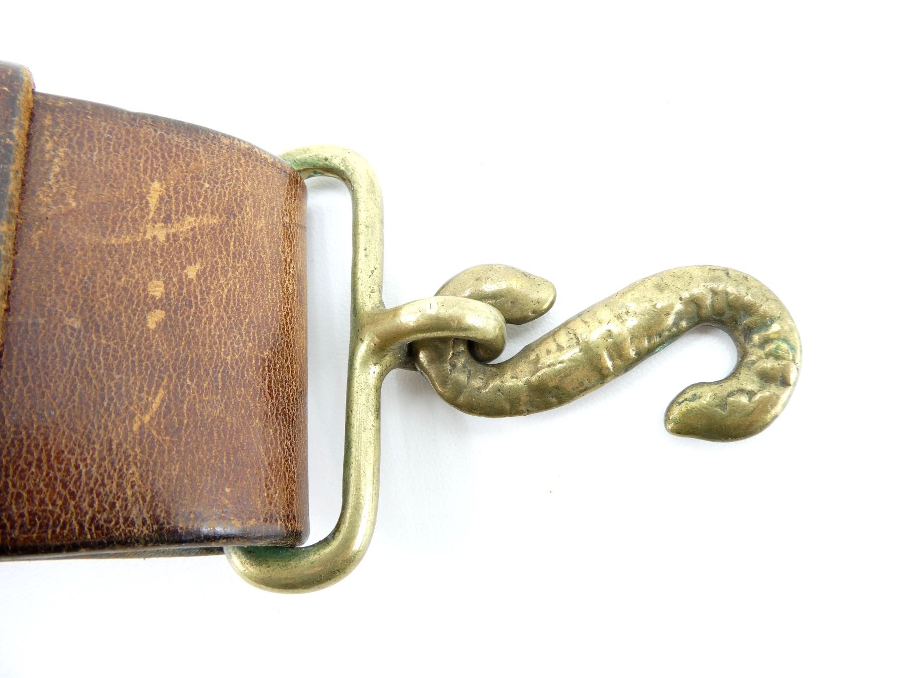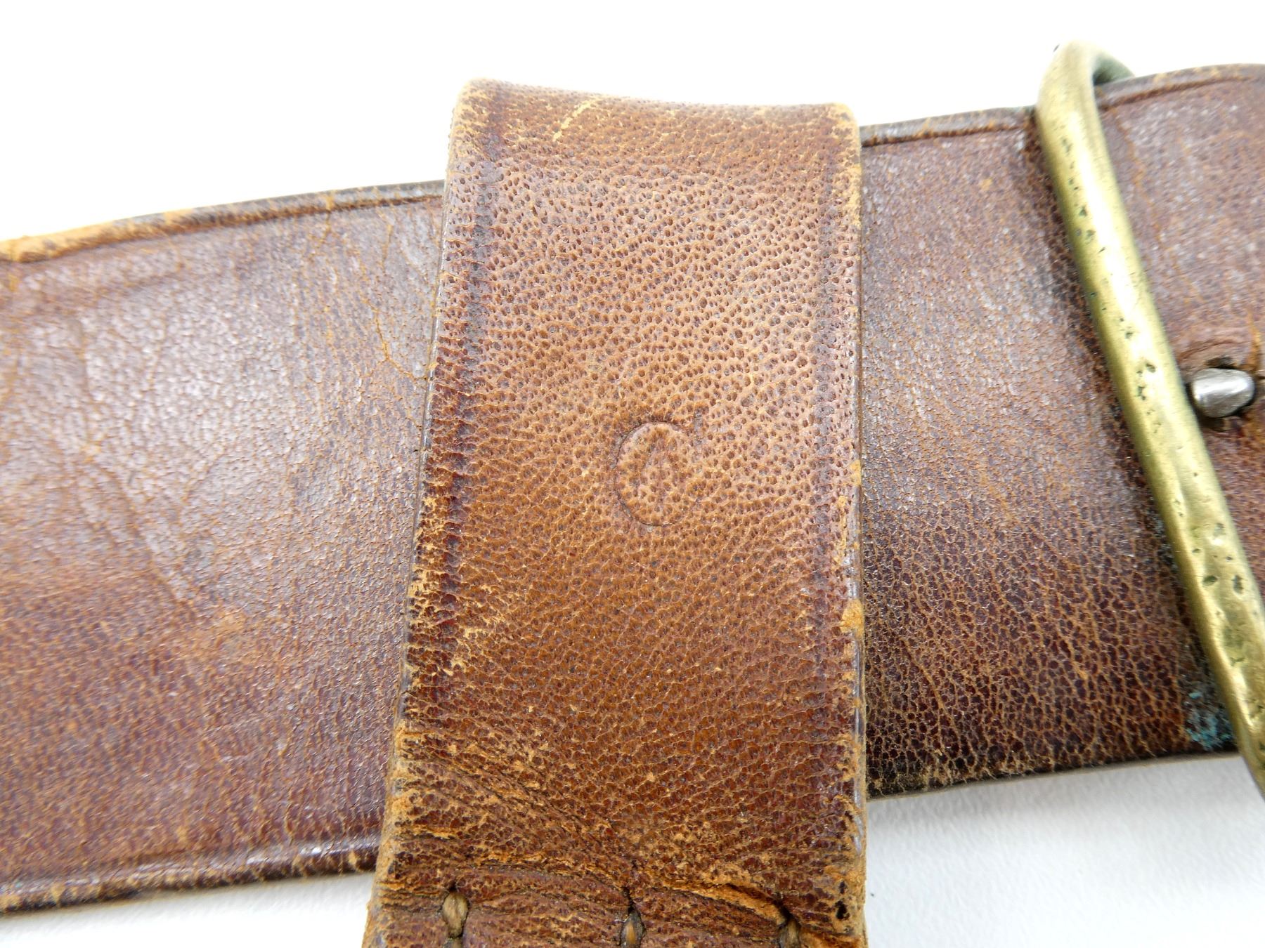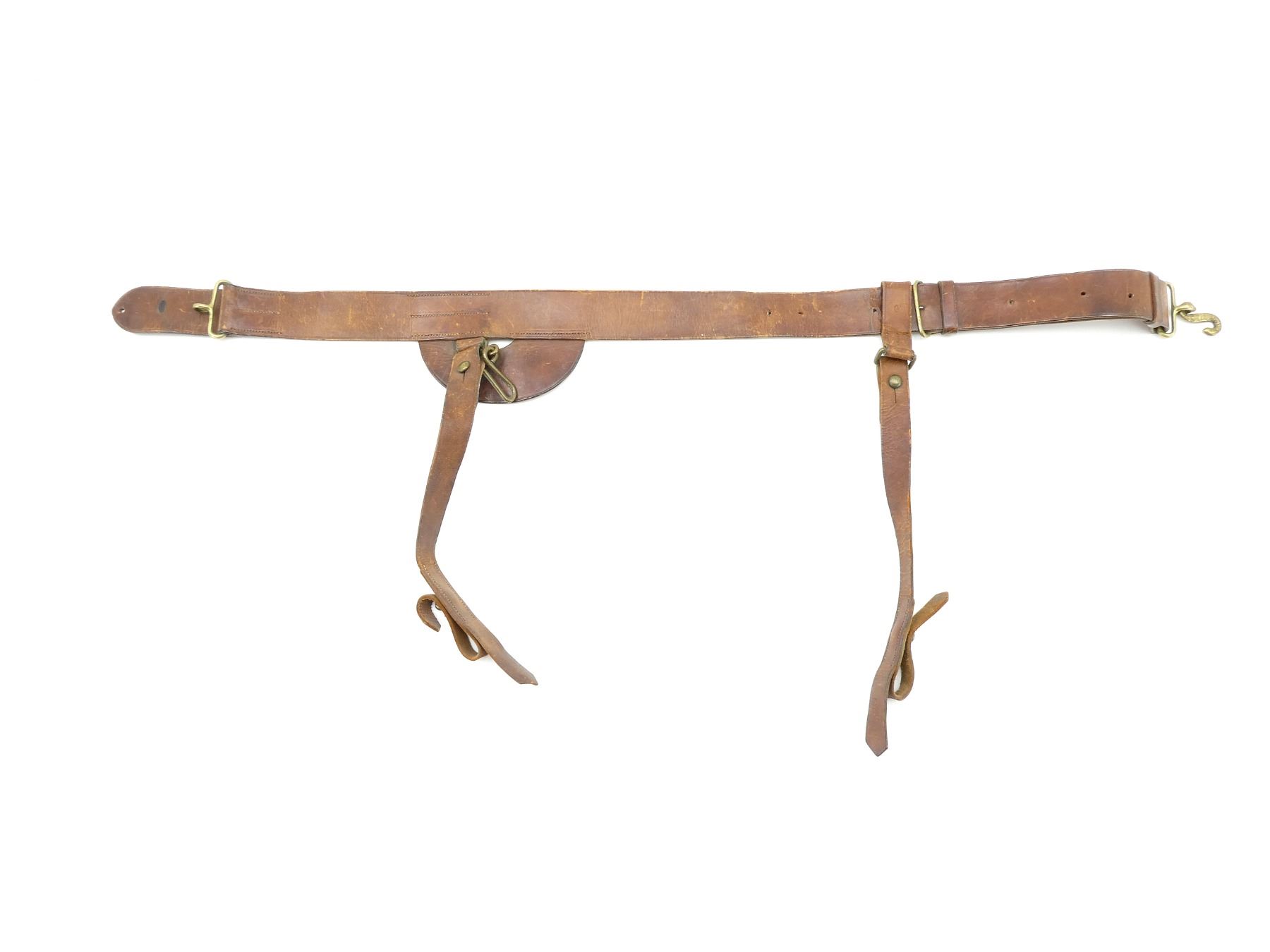 (1) BROWN LEATHER BELT WITH BRASS FITTINGS, SNAKE BUCKLE & SWORD HANGER STRAPS, ALL LEATHER IS SOFT, DESIGNED TO CARRY 1885 TO 1908 PATTERN SCABBARDS, BELT MARKED: "ADAMS BRO?, 1921" WITH C-BROAD ARROW, SWORD HANGERS MARKED WITH C-BROAD ARROWS, BELT OVERALL LENGTH APPROX. 38", ADJUSTABLE. SEE PHOTOS.