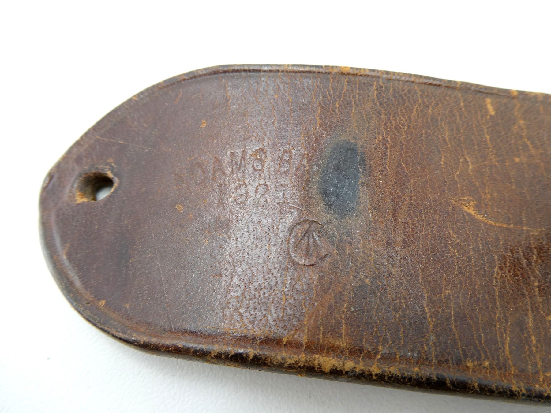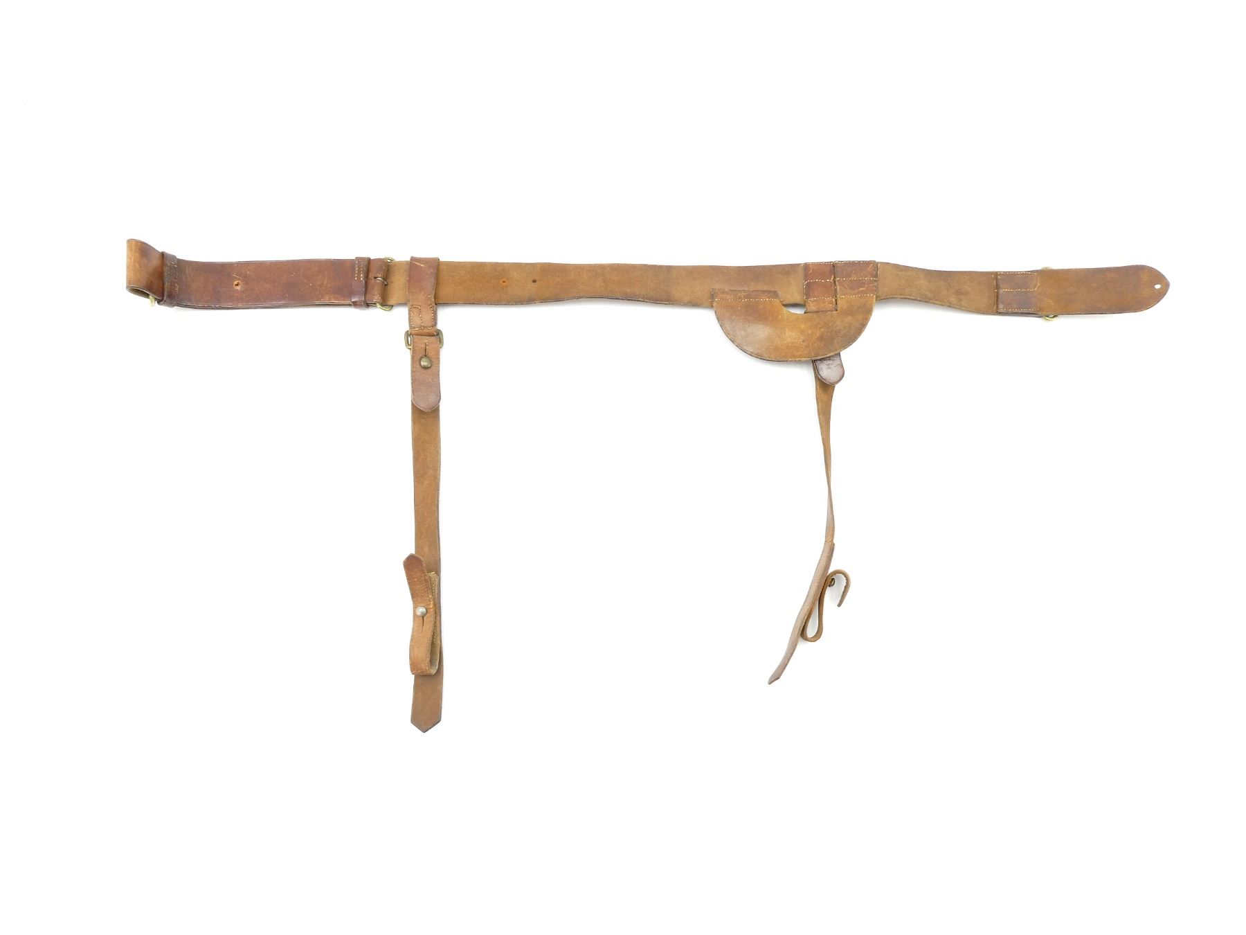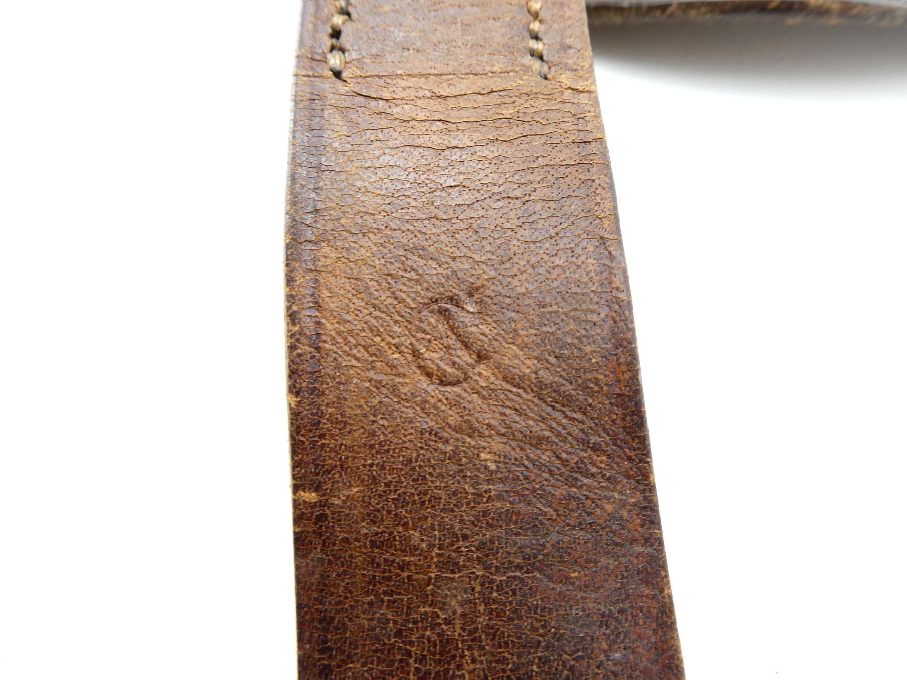 (1) BROWN LEATHER BELT WITH BRASS FITTINGS, SNAKE BUCKLE & SWORD HANGER STRAPS, ALL LEATHER IS SOFT, DESIGNED TO CARRY 1885 TO 1908 PATTERN SCABBARDS, BELT MARKED: "ADAMS BRO?, 1921" WITH C-BROAD ARROW, SWORD HANGERS MARKED WITH C-BROAD ARROWS, BELT OVERALL LENGTH APPROX. 38", ADJUSTABLE. SEE PHOTOS.