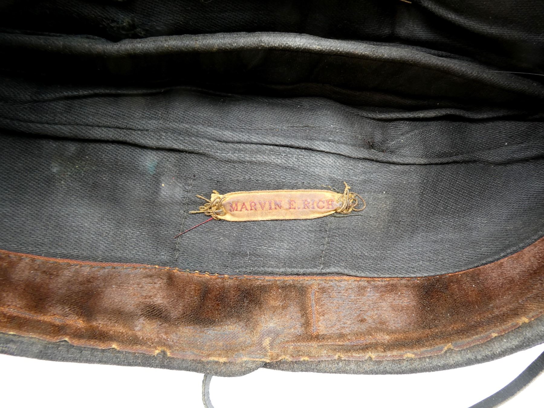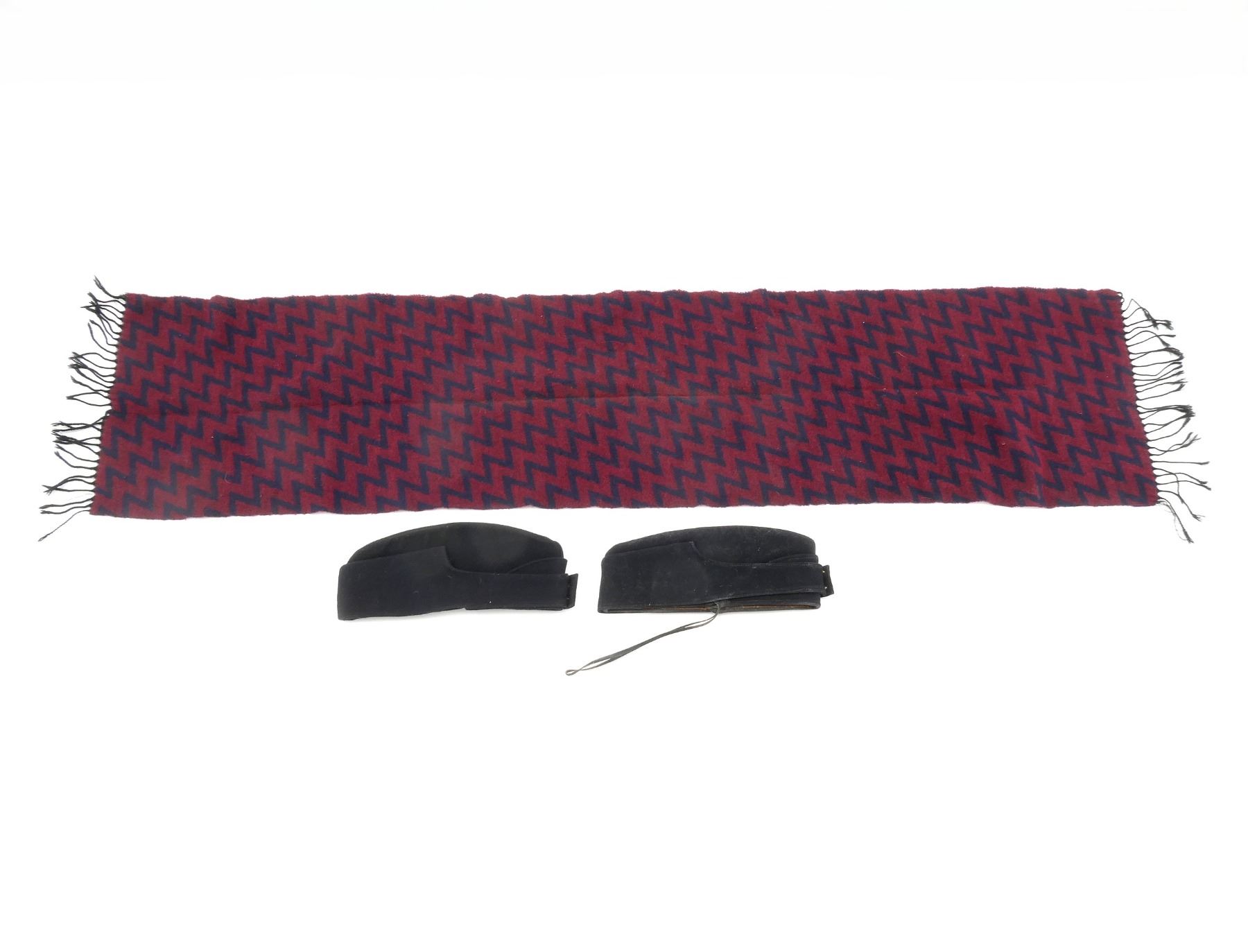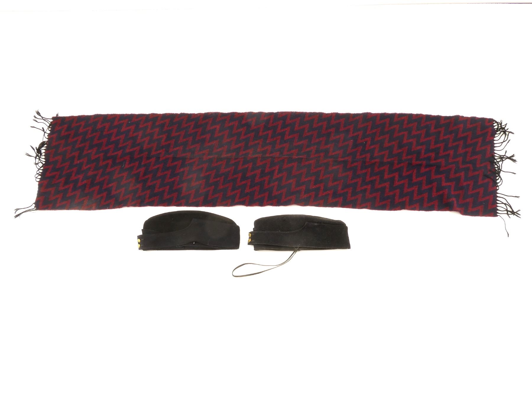 LOT INCLUDES; (1) NAVY BLUE / BLACK WOOL WEDGE CAP WITH BRASS KING'S CROWN CANADIAN SERVICES COLLEGES BUTTONS, NAME TAG INSIDE MARKED: "MARVIN E. RICH", NO OTHER VISIBLE MARKINGS, WITH CHIN STRAP, SHOWS AGE / WEAR / TEAR, (1) 1951 NAVY BLUE / BLACK WOOL WEDGE CAP WITH BRASS KING'S CROWN CANADA BUTTONS, INSIDE MARKED: "BUFFALO CAP & NECKWEAR LTD., WINNIPEG 1951 CANADA, SIZE 7 1/8", WITH MAPLE LEAF PROOF MARK, SHOWS SOME AGE / WEAR & (1) UNKNOWN POSSIBLY MILITARY SCARF, NO VISIBLE MARKINGS, OVERALL LENGTH APPROX. 56.5". SEE PHOTOS.