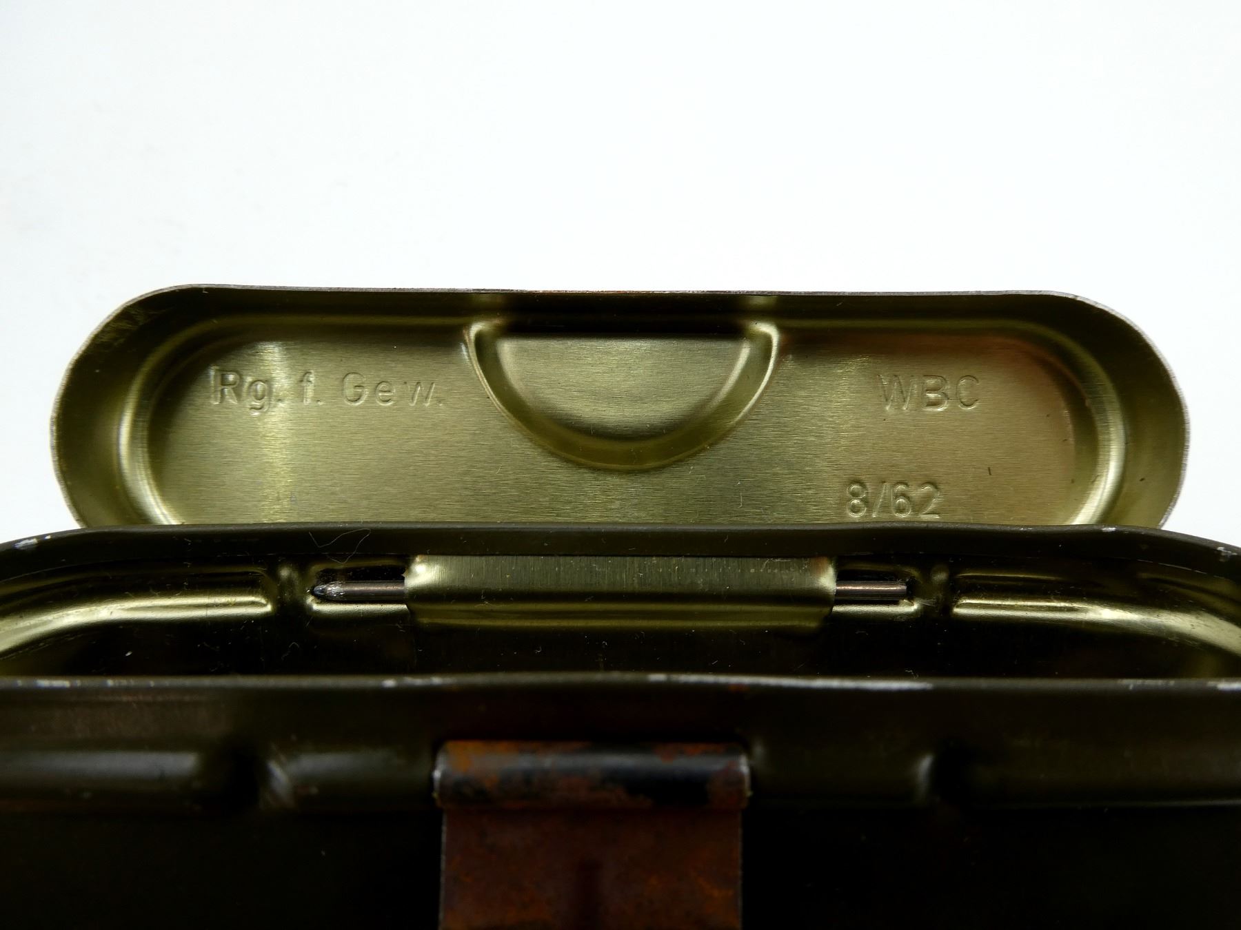 (1) CLEANING KIT FOR MAUSER K98 RIFLES, ETC., GREEN PAINTED TIN WITH PLASTIC OILER, CHAIN PULL-THRU, BRUSHES, ETC., TIN MARKED: "RG. F. GEW.", "WBC, 8/62". SEE PHOTOS.
