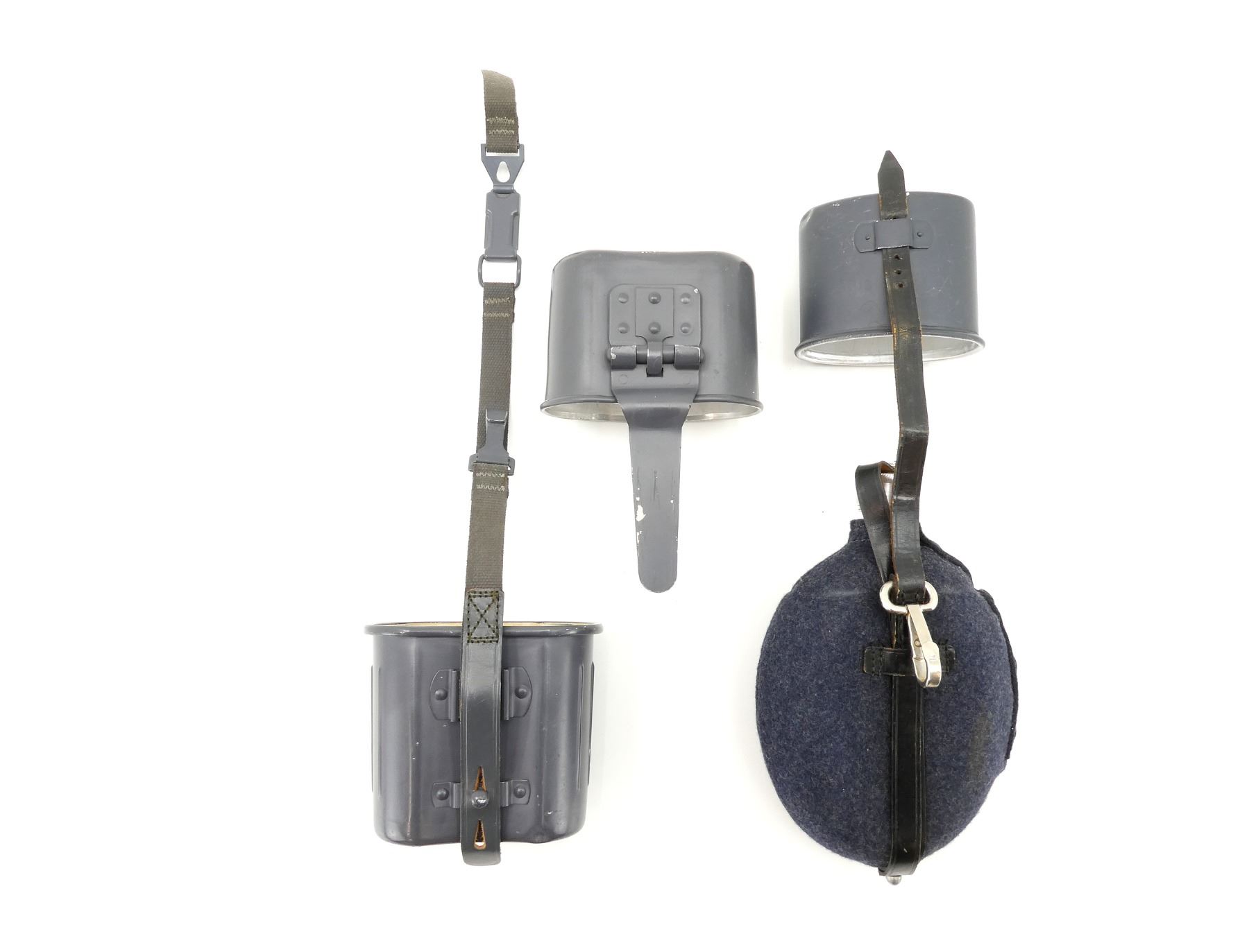 LOT INCLUDES; (1) WEST BERLIN POLICE 1L CANTEEN WITH CUP, BLUEISH GREY FELT CANTEEN COVER WITH SNAP CLOSURE, BLUEISH GREY PAINTED CANTEEN CUP MARKED: "PPRBLN", FOLDING HANDLES, BLACK LEATHER STRAPPING TO HOLD TOGETHER WITH METAL CLIP FOR BELT, NO VISIBLE MARKINGS, TEAR ON STRAP NEAR BOTTOM OF CANTEEN & (1) BUNDESWEHR ARMY CANTEEN, BLUEISH GREY PAINTED, FOLDING HANDLE, NO VISIBLE MARKINGS, GREY CANVAS / LEATHER STRAPPING TO HOLD TOGETHER, NO VISIBLE MARKINGS, METAL FITTINGS. SEE PHOTOS.