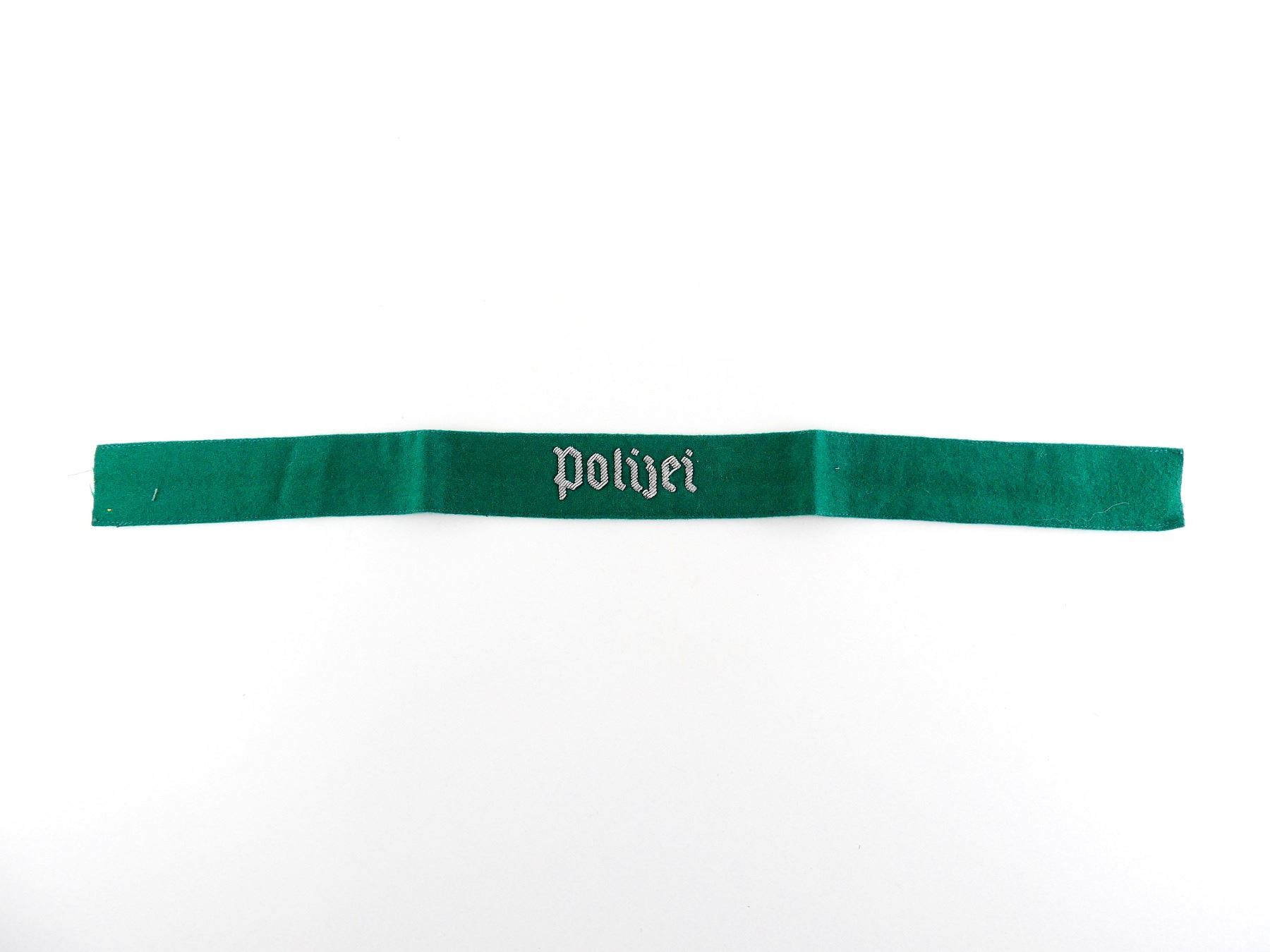 (1) GREEN FELT / WOOL CUFF TITLE MARKED: "POLIZEI" IN SILVER WIRE, NO OTHER VISIBLE MARKINGS, APPROX. 1.5" WIDE, OVERALL LENGTH APPROX. 19". SEE PHOTOS.