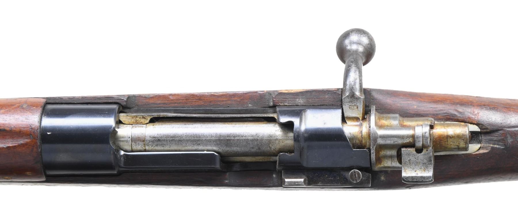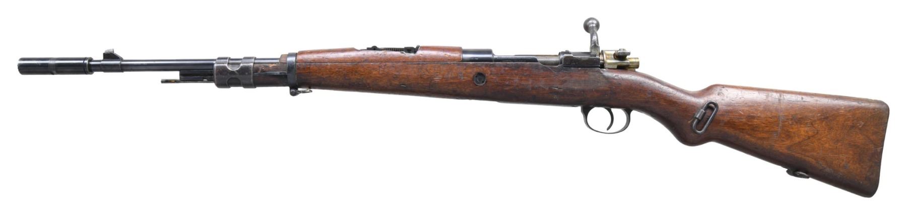 Cal. 30-06. S# 177. Bbl. 17 1/2" with muzzle brake & Century import marking. Blade front sight. Tangent rear sight graduated to 1400m. Matching numbers on receiver, bolt & front sight. Receiver ring is unmarked & left side of receiver has FN markings. Receiver is also notched. This type of FN carbine was made post war for varying foreign contracts & is labeled "Moroccan" by collectors but it is unknown exactly what countries used this model carbine. Blued & black enamel finishes. Hardwood stock set with bottom mounted & left side sling swivels. Front band swivel is reversed. Top & right side of butt have white paint "177" rack number. Short blued cleaning rod present. CONDITION: stock shows some chipping on forend from improper band removal, scattered dirt staining, dings & handling marks. Metal retains 60% mix of blue & enamel with flaking enamel on bottom metal, fading to gray on bands & scattered oxidation. Action functions properly when hand cycled. Near excellent bright bore (25-2670/MJC). CURIO. $300-500.