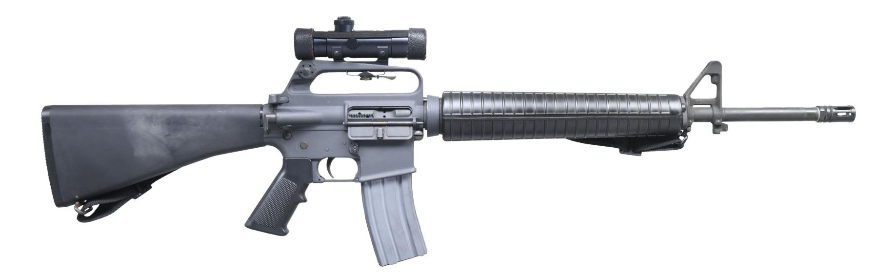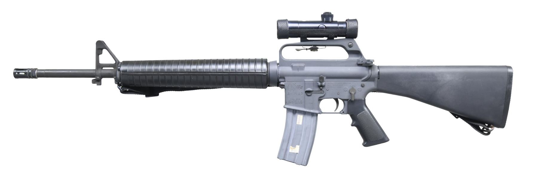 Cal.5.56mm. S# SP311369. Bbl. 20". Threaded barrel w/ A2 flash hider, marked "C MP 5.56 NATO 1/7". Protected post front sight / gas block / bayonet lug. Rifle length A2, round handguards, retained w/ tapered delta ring. Carry handle upper receiver w/ windage adjustable, dual aperture rear sight & forward assist but no brass deflector. Currently sporting Colt 3x20 scope w/ duplex reticle. Slab side lower receiver. Black plastic pistol grip. A2 shoulder stock w/ trap door containing cleaning rods. SP1 profile bolt carrier. Sling swivels, front & rear w/ black nylon sling. MAGS: 1 Colt 30 rd. CONDITION: Finish on exterior surfaces complete & consistent w/ only a few light drag lines, typical of those earned in storage. Clean bore w/ strong rifling. Fire control mechanism appears to function correctly when cycled by hand. (25-2342/JZ). MODERN. $800-1,200.