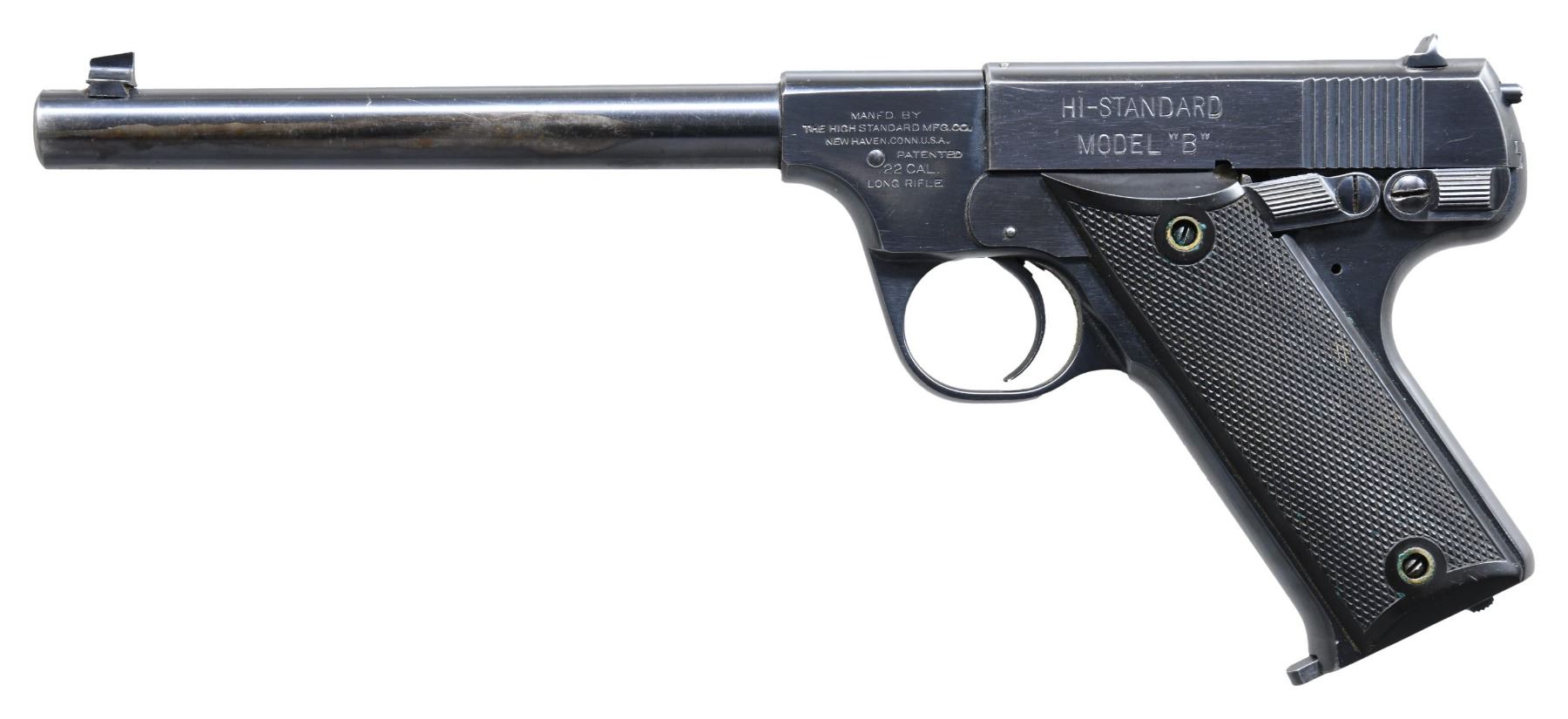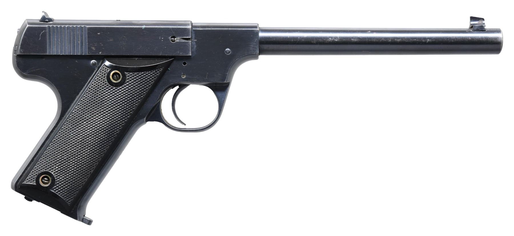 Cal. 22 LR. S# 6035. Mfg. 1933. Bbl. 6.75" w/ Blade front sight. Matching numbered slide has square notch rear sight. Type 1-A takedown design. Blue steel frame w/ black checkered hard rubber grips. MAGS: 1 two tone 10 rd. CONDITION: good blue with scratches, marks & large streaks of finish loss on sides of barrel. Good grips with light marks & spots of verdigris. Very good bore. (25-3187/MD). CURIO. $200-300.