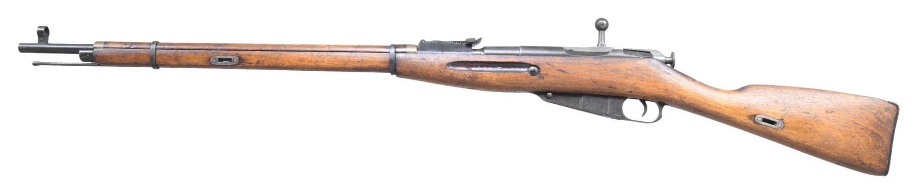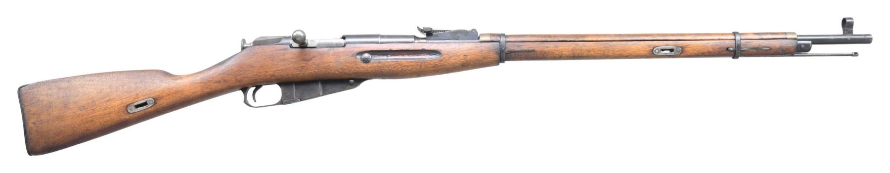 Cal. 7.62x54R. S# 41750. Bbl. 29". Post front sight with hood. Tangent rear sight graduated to 2000m. Matching numbers on buttplate & bbl. shank. Other parts are mismatched. Rifle appears to be Spanish Civil War issue but lacks "MADE IN USSR" or "MP8" markings. Bbl. shank has Tula star & 1937 date. Blued finish. Hardwood stock with screw in sling slots. Cleaning rod present but does not always stay in place. CONDITION: stock set has arsenal sanded appearance with some light chipping in cleaning rod channel, scattered dings & handling marks. Metal retains 40% original blue with overall fading,scattered oxidation & edge wear. Action functions properly when hand cycled. Good bright bore with scattered frosting & light pitting but good rifling. (25-3763/MJC). CURIO. $200-300.