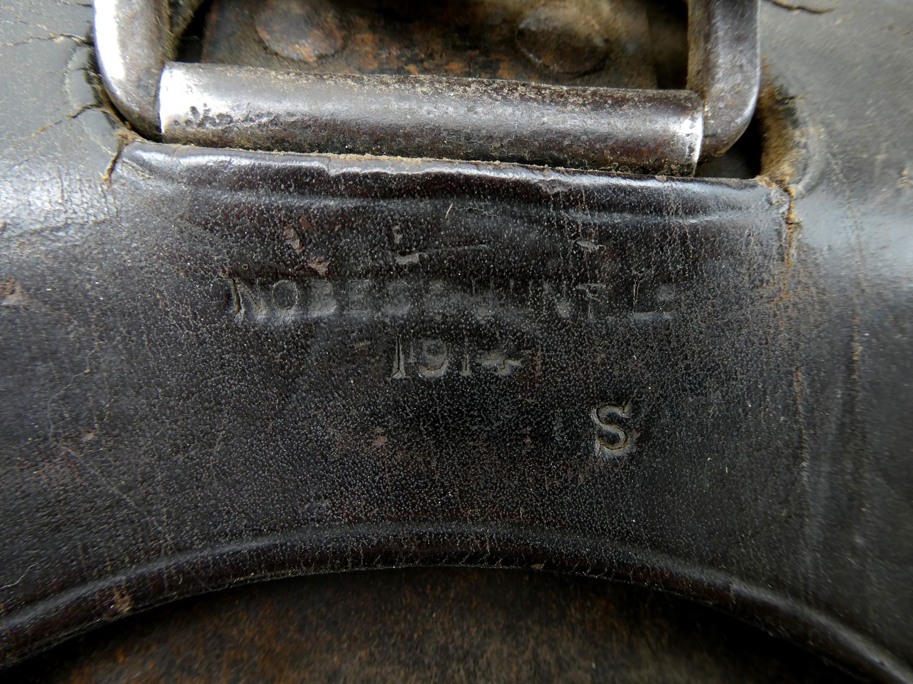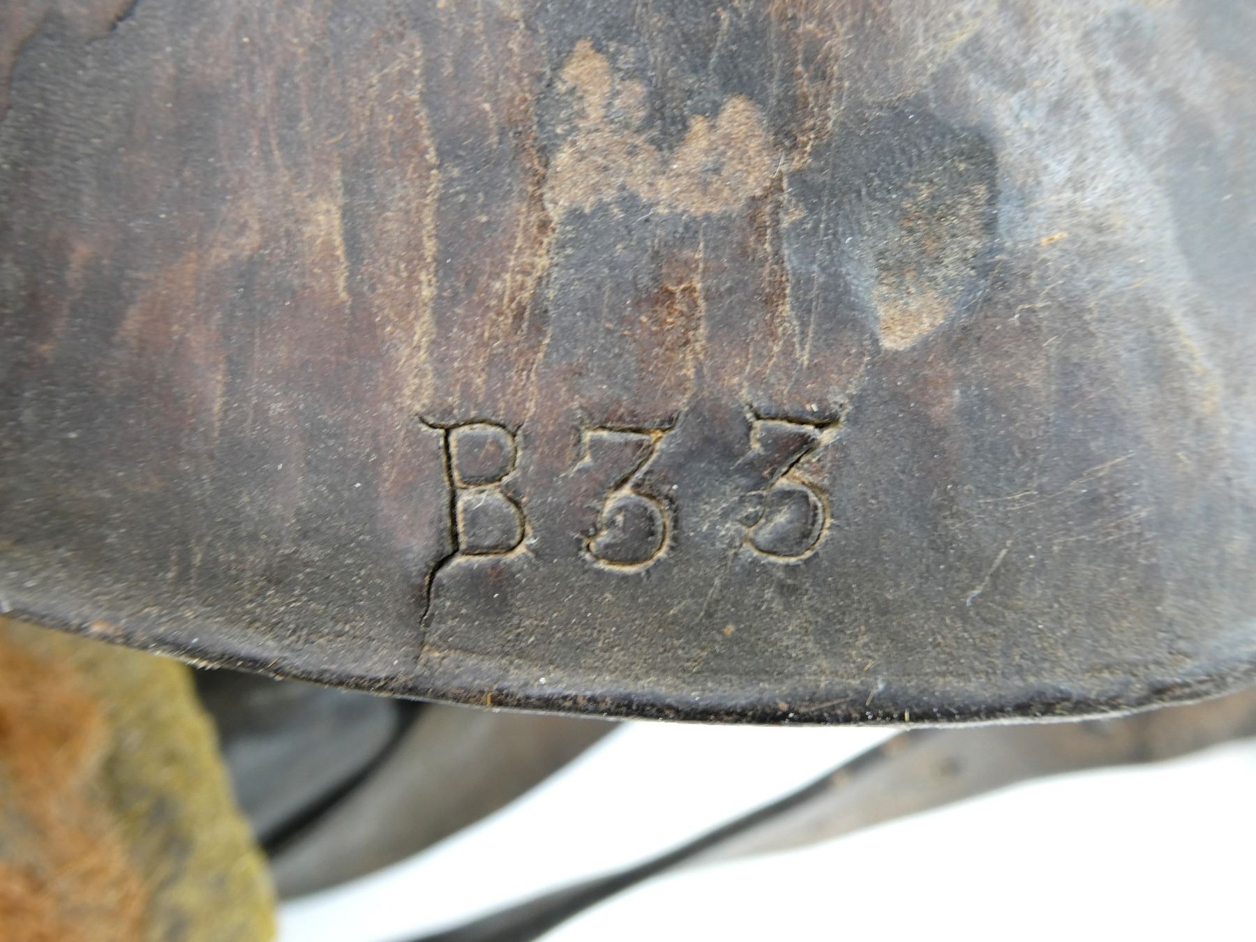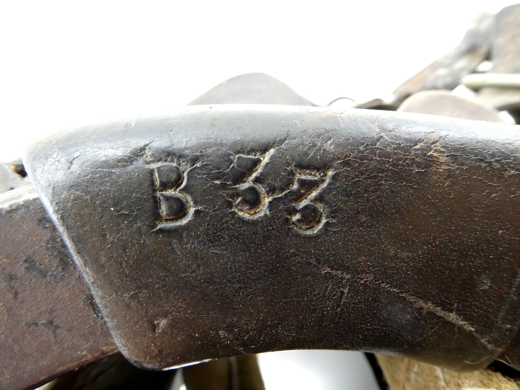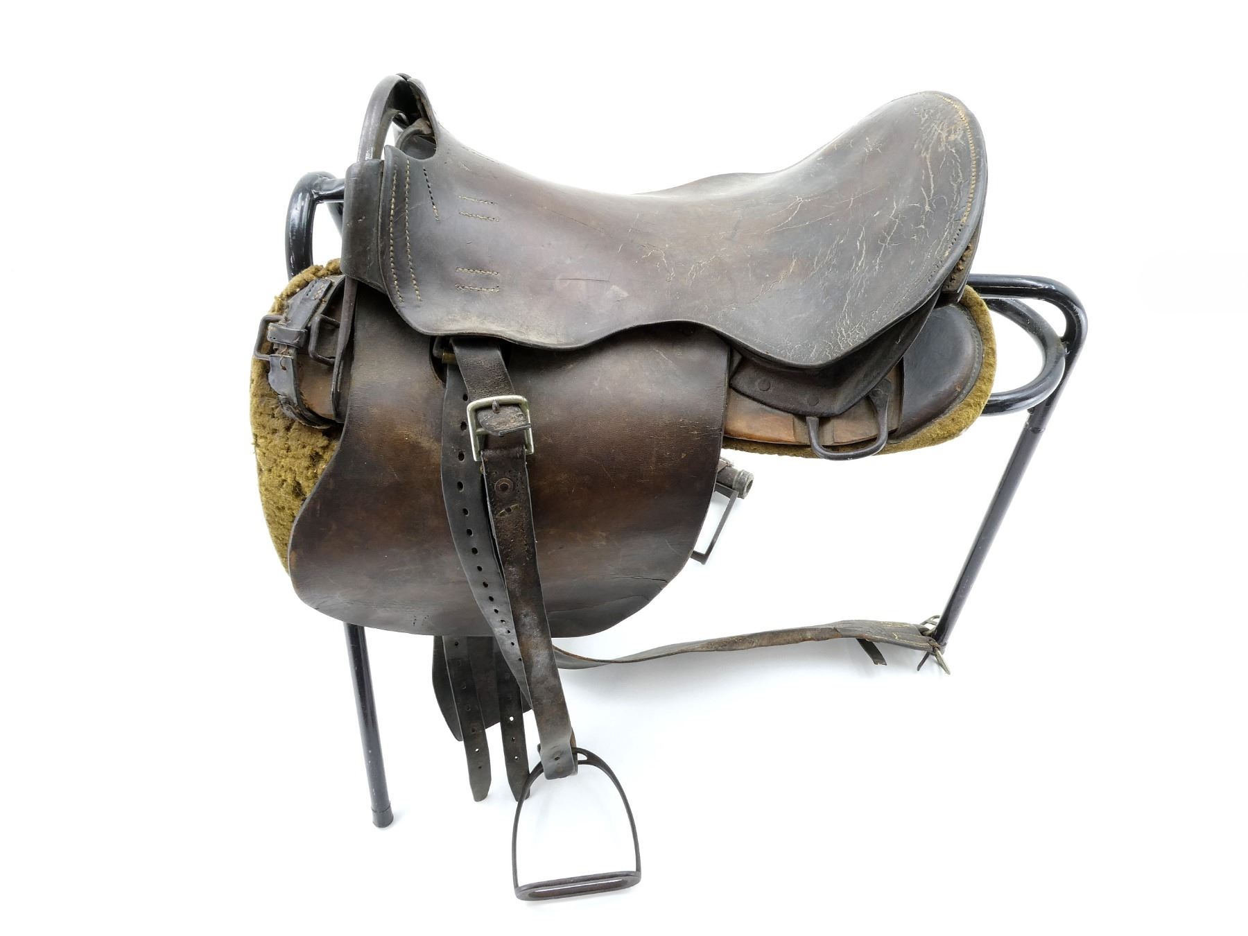 LOT INCLUDES; (1) BROWN LEATHER SADDLE WITH WOOL LINED WOODEN FRAME, LEATHER STRAP THAT GOES ACROSS HORSES BELLY MARKED: "HEPBORN GALE & FO?S LTD", "1914", "B33", "28", "17", "1", "I7", LEATHER ON FRONT MIDDLE OF SADDLE MARKED: "B33", UNDER-SIDE OF SADDLE ON BACK FAINTLY MARKED: "NOBES????NT. L., 1914, S", WOODEN FRAME MARKED: "?????? & SON, LONDON, C&M, 1898" WITH BROAD ARROW OVER "B", METAL STIRRUP ON BOTTOM MARKED: "4" OVER "02", BROAD ARROW OVER "T", "C&M" WITH VARIOUS OTHER FAINT MARKINGS, OTHER STIRRUP ON BOTTOM MARKED: "BROAD ARROW OVER "T" WITH VARIOUS OTHER FAINT MARKINGS, VARIOUS LEATHER STRAPS / METAL FITTINGS, SHOWS AGE / WEAR / TEAR, APPROX. 21" X 15" X 9.25" & (1) BLACK PAINTED METAL SADDLE STAND WITH REMOVEABLE LEGS, NO VISIBLE MARKINGS, WHEN SET UP APPROX. 25.5" X 19.75" X 24.5". SEE PHOTOS.