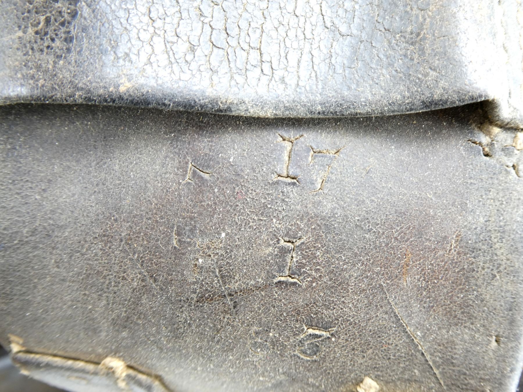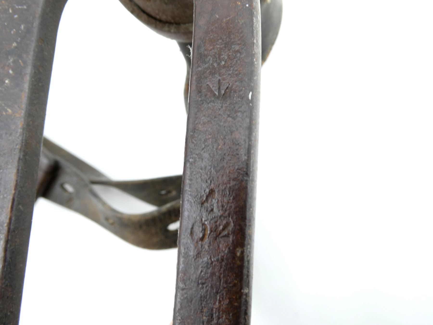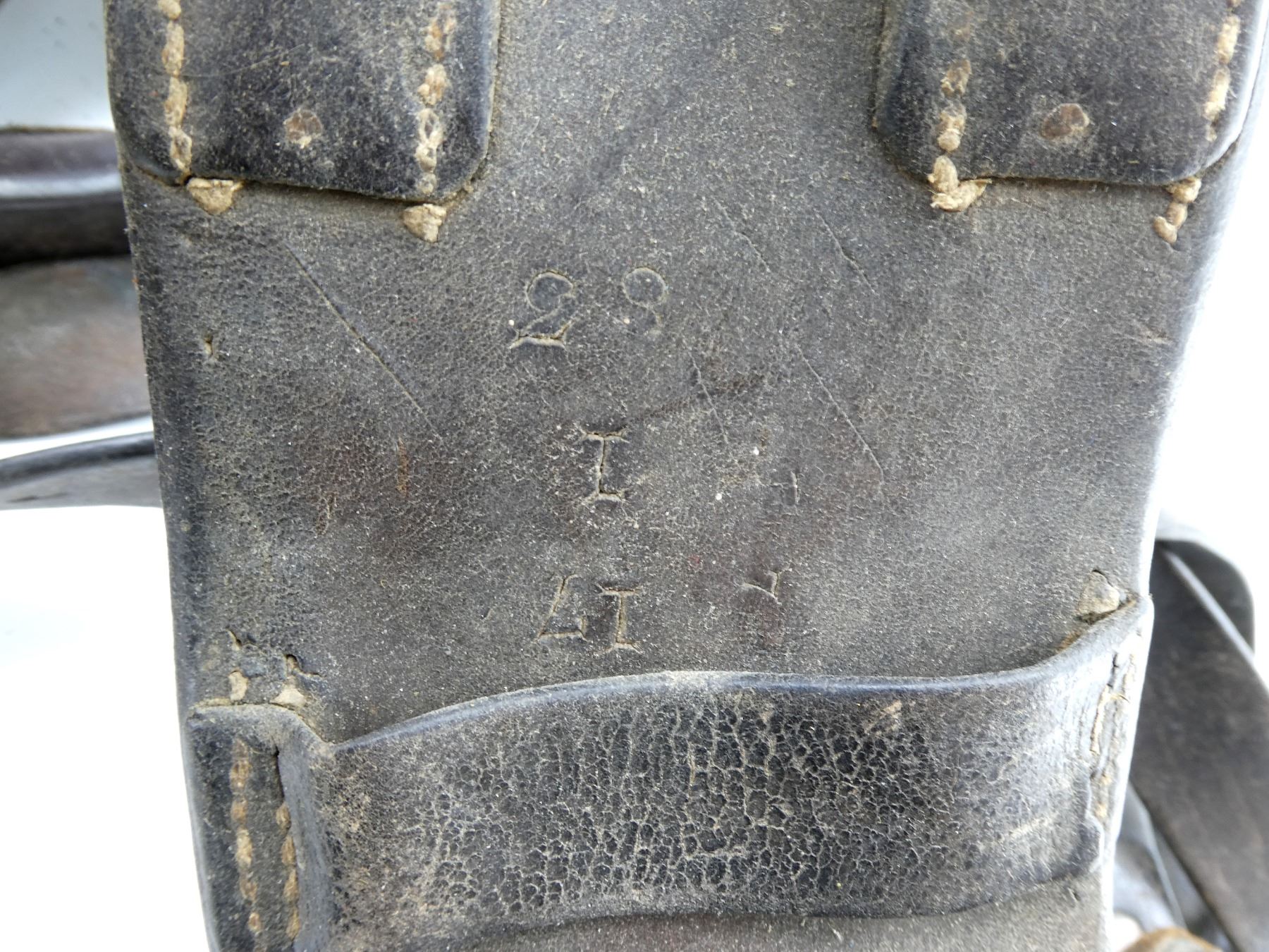 LOT INCLUDES; (1) BROWN LEATHER SADDLE WITH WOOL LINED WOODEN FRAME, LEATHER STRAP THAT GOES ACROSS HORSES BELLY MARKED: "HEPBORN GALE & FO?S LTD", "1914", "B33", "28", "17", "1", "I7", LEATHER ON FRONT MIDDLE OF SADDLE MARKED: "B33", UNDER-SIDE OF SADDLE ON BACK FAINTLY MARKED: "NOBES????NT. L., 1914, S", WOODEN FRAME MARKED: "?????? & SON, LONDON, C&M, 1898" WITH BROAD ARROW OVER "B", METAL STIRRUP ON BOTTOM MARKED: "4" OVER "02", BROAD ARROW OVER "T", "C&M" WITH VARIOUS OTHER FAINT MARKINGS, OTHER STIRRUP ON BOTTOM MARKED: "BROAD ARROW OVER "T" WITH VARIOUS OTHER FAINT MARKINGS, VARIOUS LEATHER STRAPS / METAL FITTINGS, SHOWS AGE / WEAR / TEAR, APPROX. 21" X 15" X 9.25" & (1) BLACK PAINTED METAL SADDLE STAND WITH REMOVEABLE LEGS, NO VISIBLE MARKINGS, WHEN SET UP APPROX. 25.5" X 19.75" X 24.5". SEE PHOTOS.