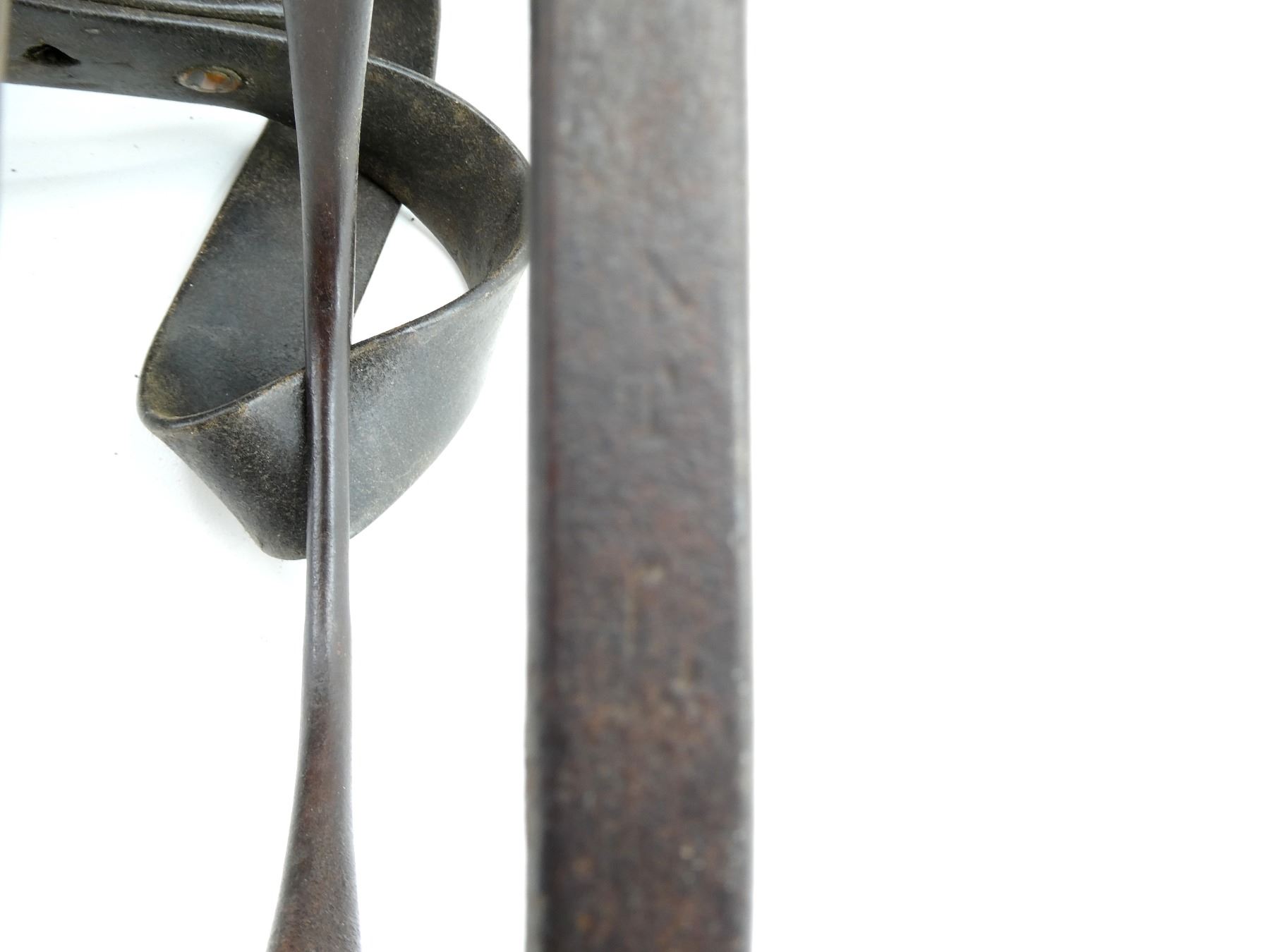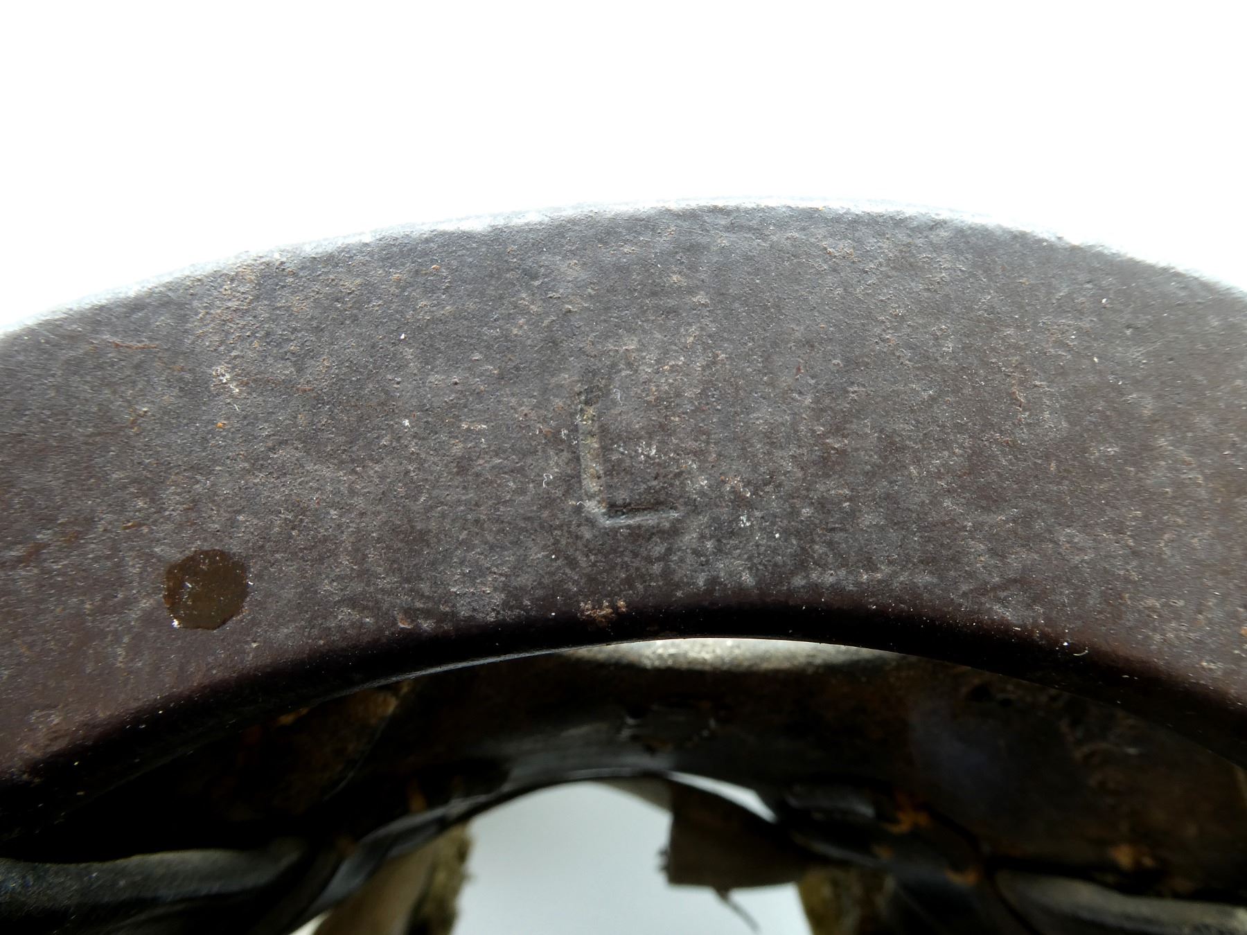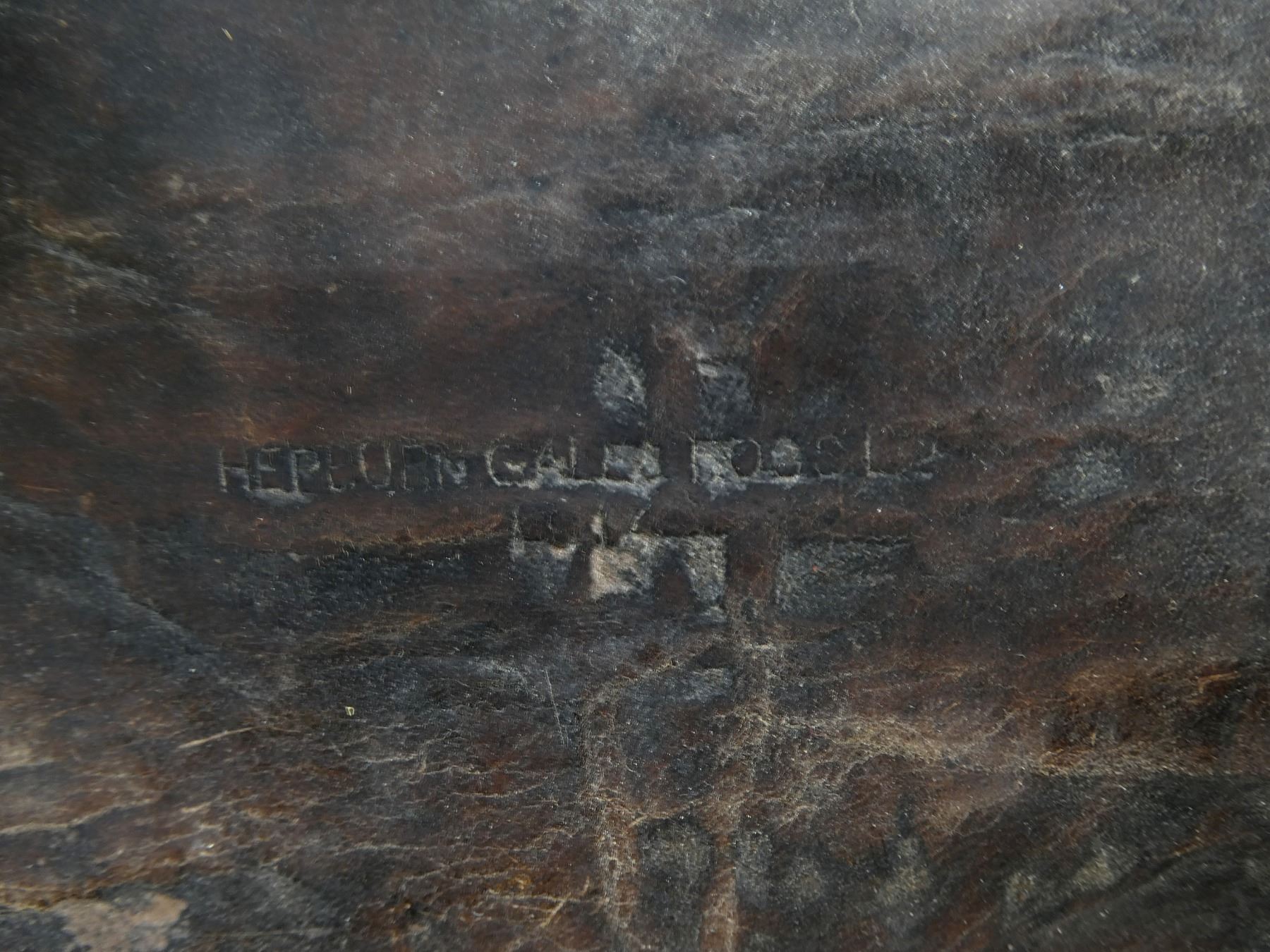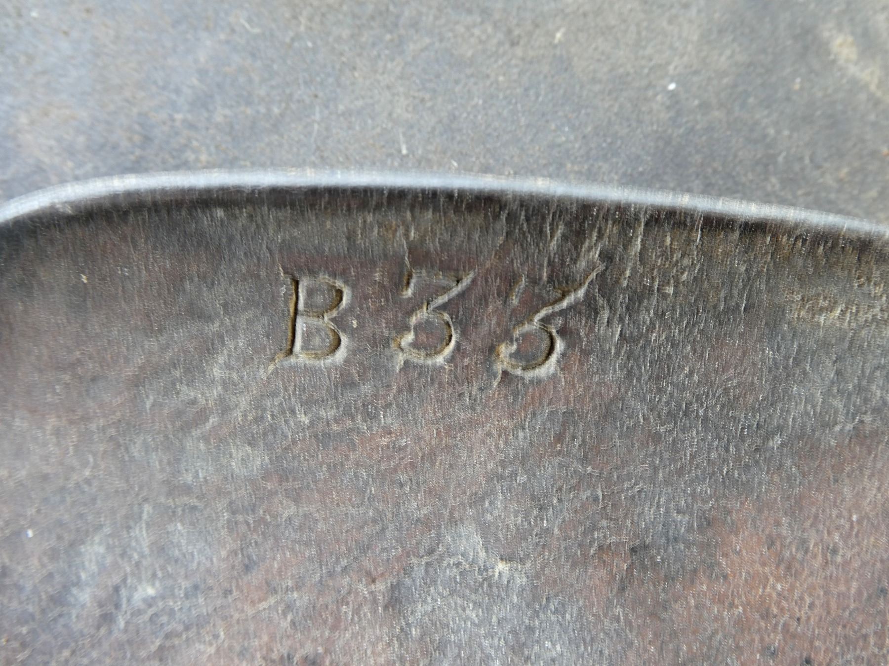 LOT INCLUDES; (1) BROWN LEATHER SADDLE WITH WOOL LINED WOODEN FRAME, LEATHER STRAP THAT GOES ACROSS HORSES BELLY MARKED: "HEPBORN GALE & FO?S LTD", "1914", "B33", "28", "17", "1", "I7", LEATHER ON FRONT MIDDLE OF SADDLE MARKED: "B33", UNDER-SIDE OF SADDLE ON BACK FAINTLY MARKED: "NOBES????NT. L., 1914, S", WOODEN FRAME MARKED: "?????? & SON, LONDON, C&M, 1898" WITH BROAD ARROW OVER "B", METAL STIRRUP ON BOTTOM MARKED: "4" OVER "02", BROAD ARROW OVER "T", "C&M" WITH VARIOUS OTHER FAINT MARKINGS, OTHER STIRRUP ON BOTTOM MARKED: "BROAD ARROW OVER "T" WITH VARIOUS OTHER FAINT MARKINGS, VARIOUS LEATHER STRAPS / METAL FITTINGS, SHOWS AGE / WEAR / TEAR, APPROX. 21" X 15" X 9.25" & (1) BLACK PAINTED METAL SADDLE STAND WITH REMOVEABLE LEGS, NO VISIBLE MARKINGS, WHEN SET UP APPROX. 25.5" X 19.75" X 24.5". SEE PHOTOS.