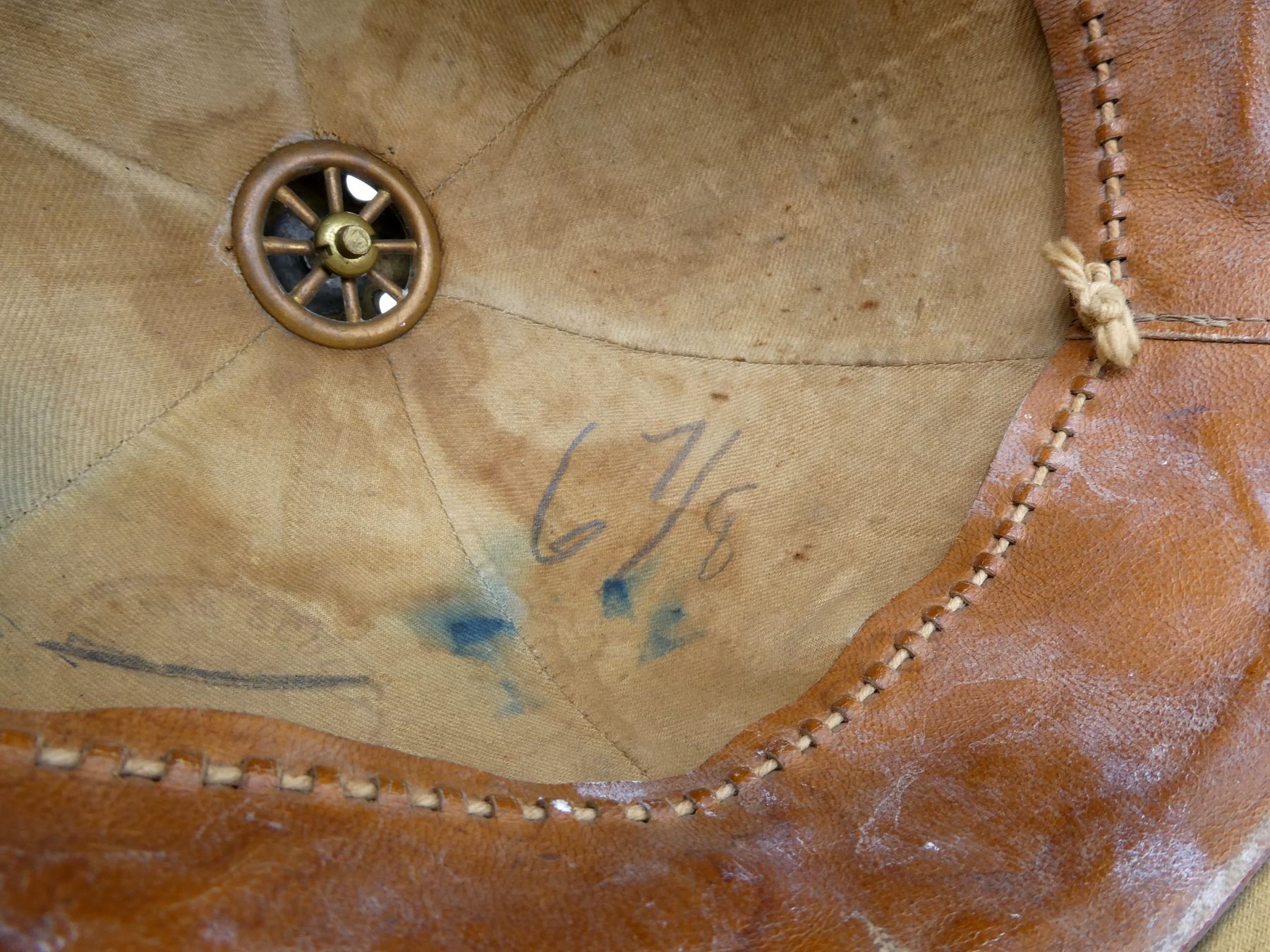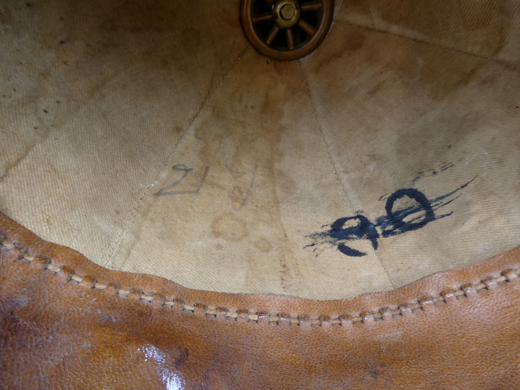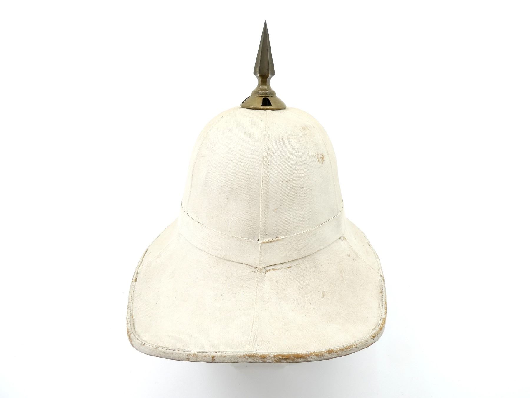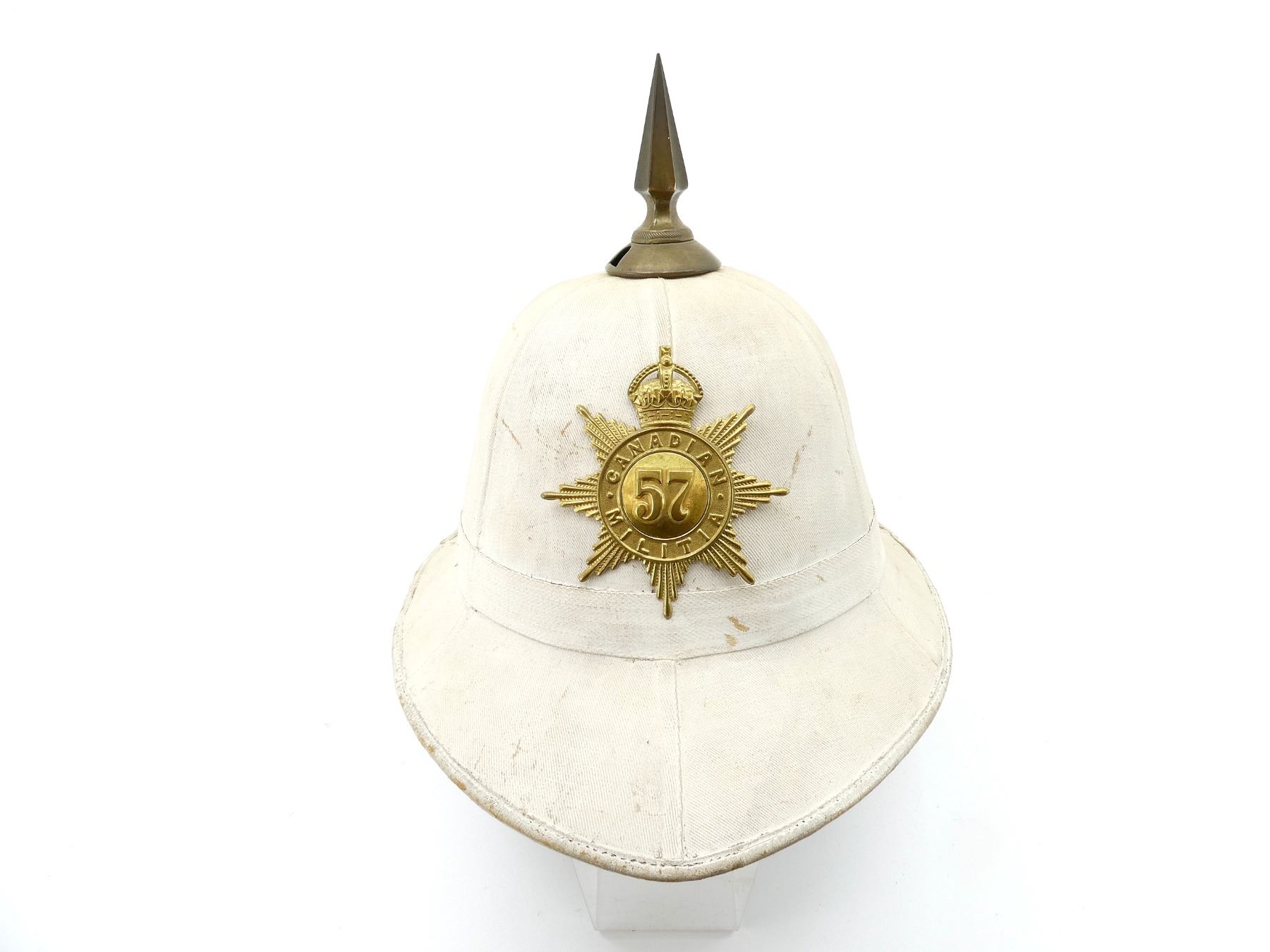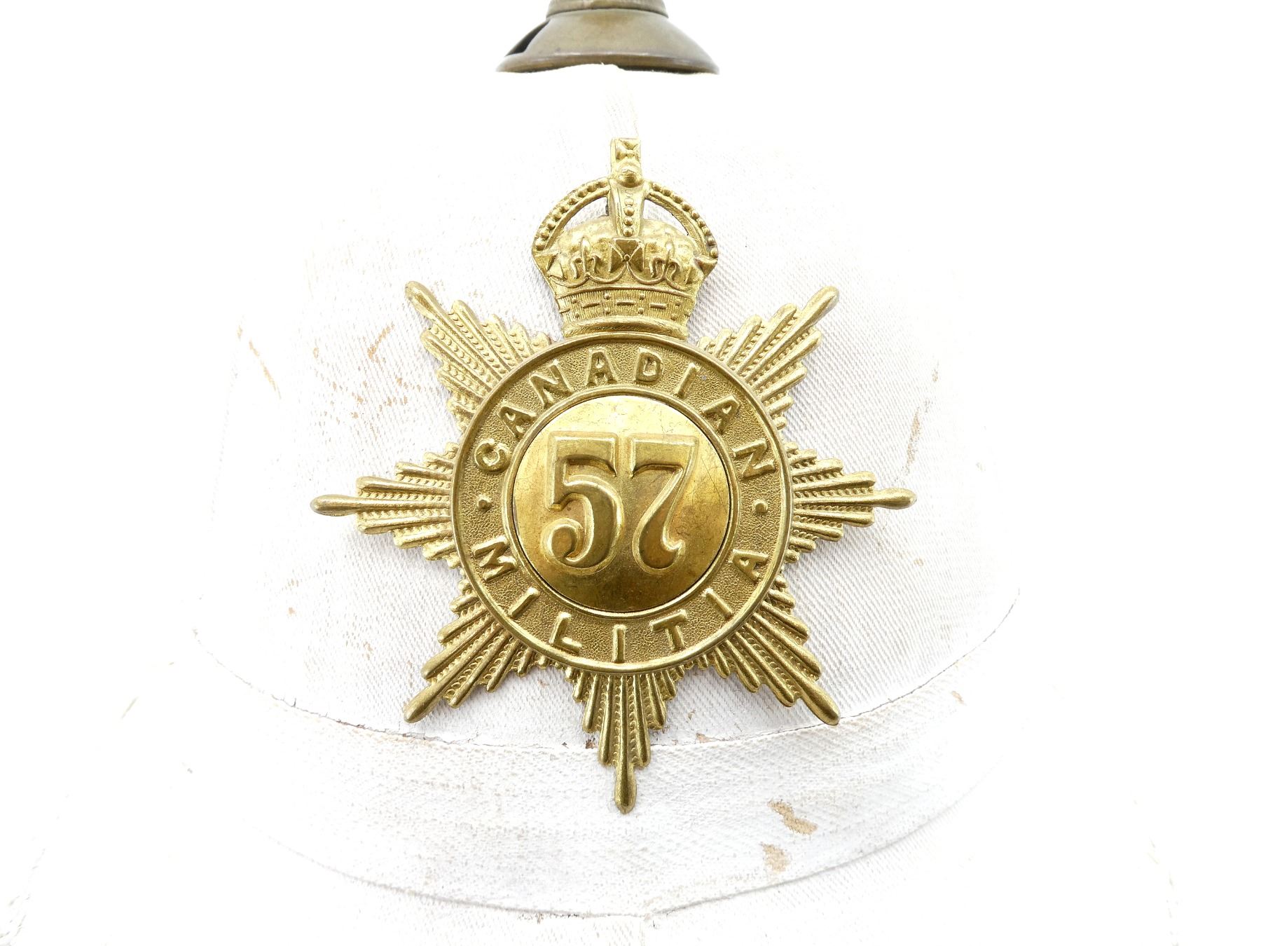 (1) WHITE COTTON AND/OR CANVAS COVERED HELMET WITHOUT PUGGAREE, BRASS SPIKE WITH VENTS, BRASS KING'S CROWN CAP BADGE MARKED: "57, CANADIAN MILITIA", (PETERBOROUGH RANGERS), TAN CANVAS / COTTON LINED INTERIOR / BRIM, LEATHER HEAD BAND, VARIOUS CROSSED-OUT NUMBER INK STAMPS, HAND-WRITTEN: "6 7/8", FAINT INK STAMP MARKED: "WILLIAM SCULLY", MISSING CHIN STRAP, SHOWS AGE / WEAR. SEE PHOTOS.