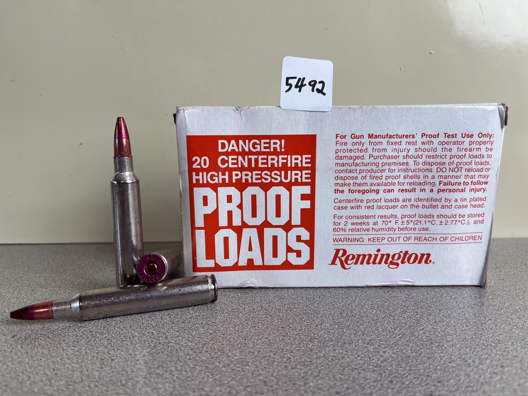 DANGER HIGH PRESSURE PROOF LOAD FOR GUN SMITH TESTING ONLY, NOT TO BE FIRED BY HAND, ONLY FOR USE INSIDE PROOF BOX BY QUALIFIED PERSONNEL