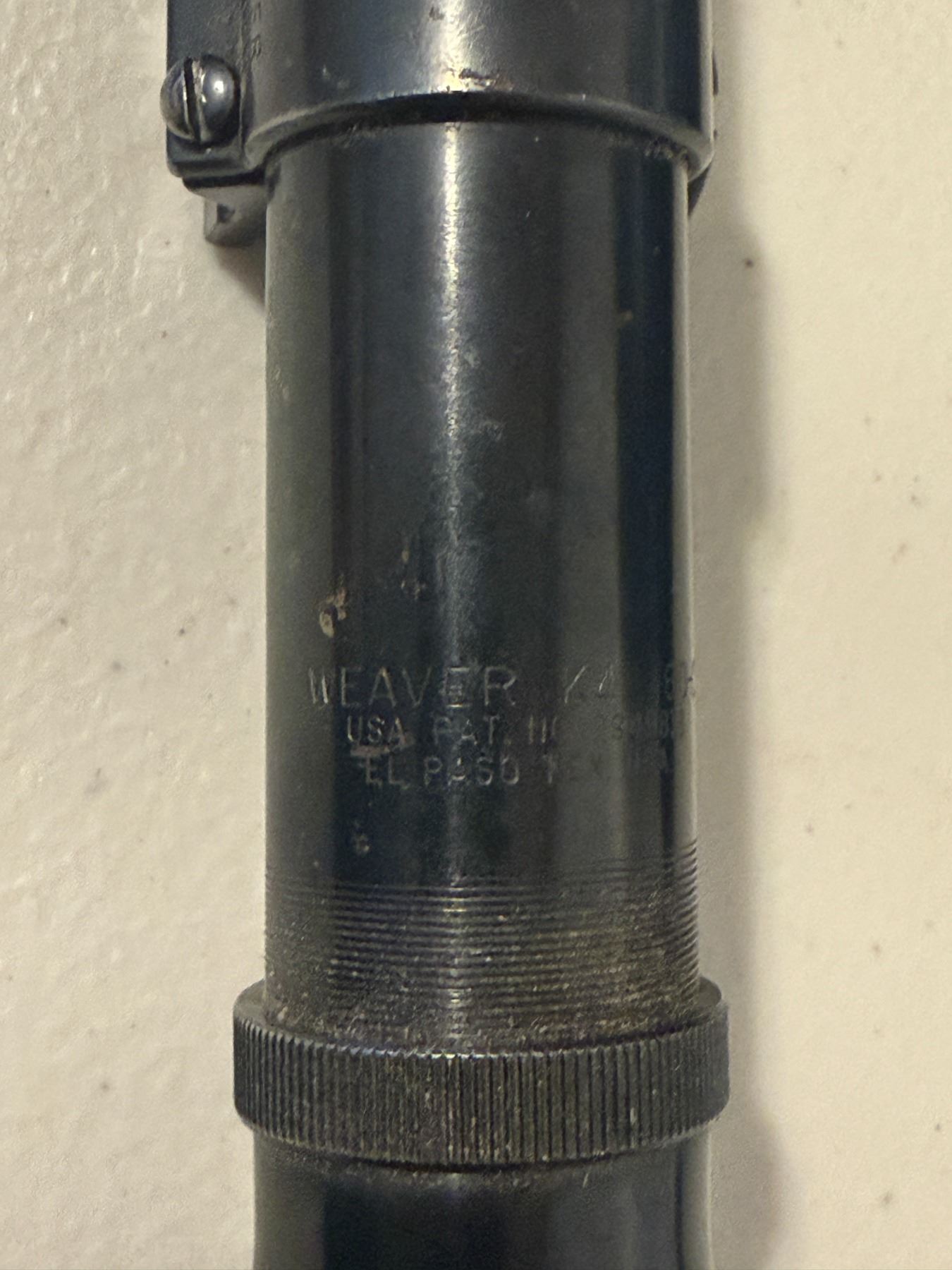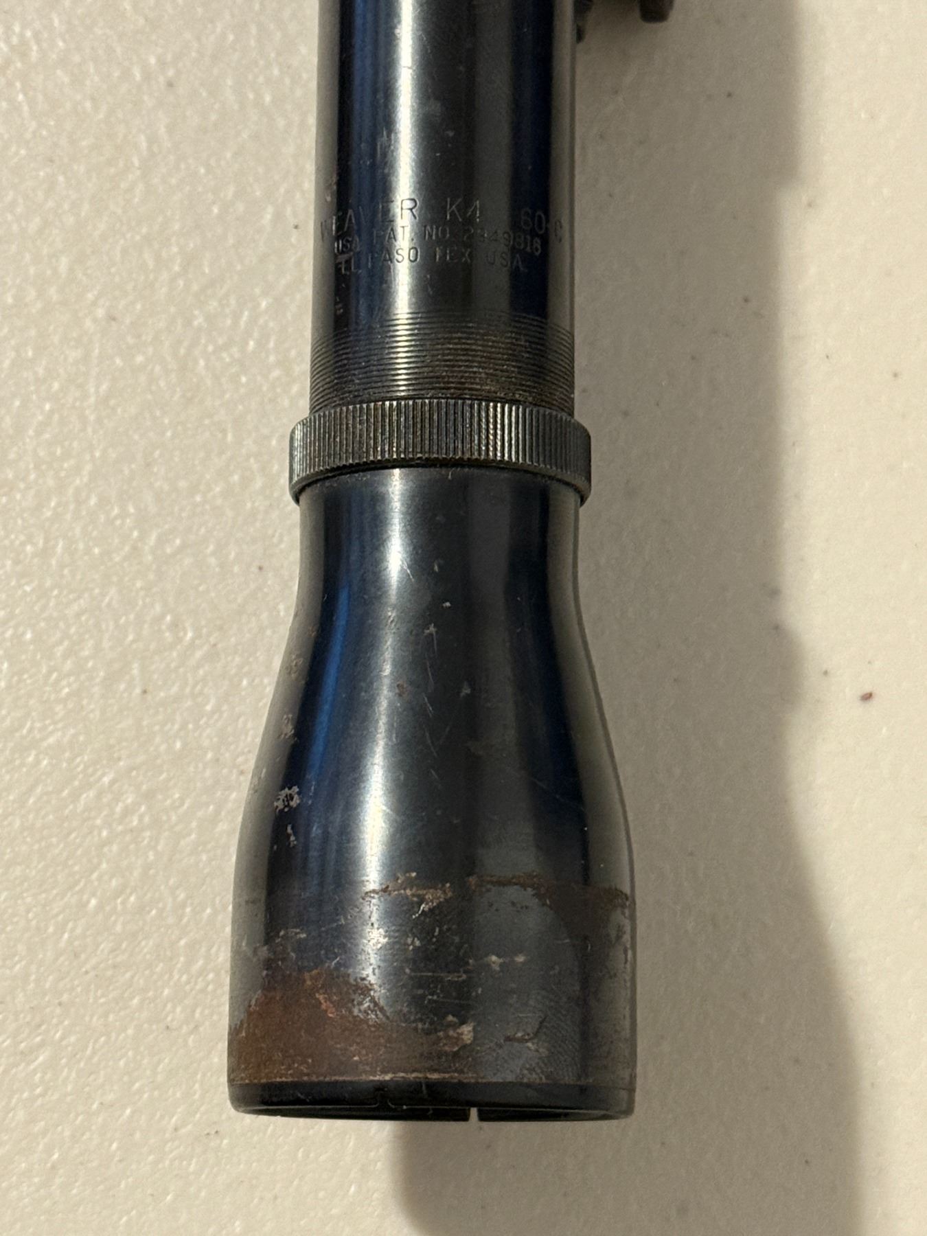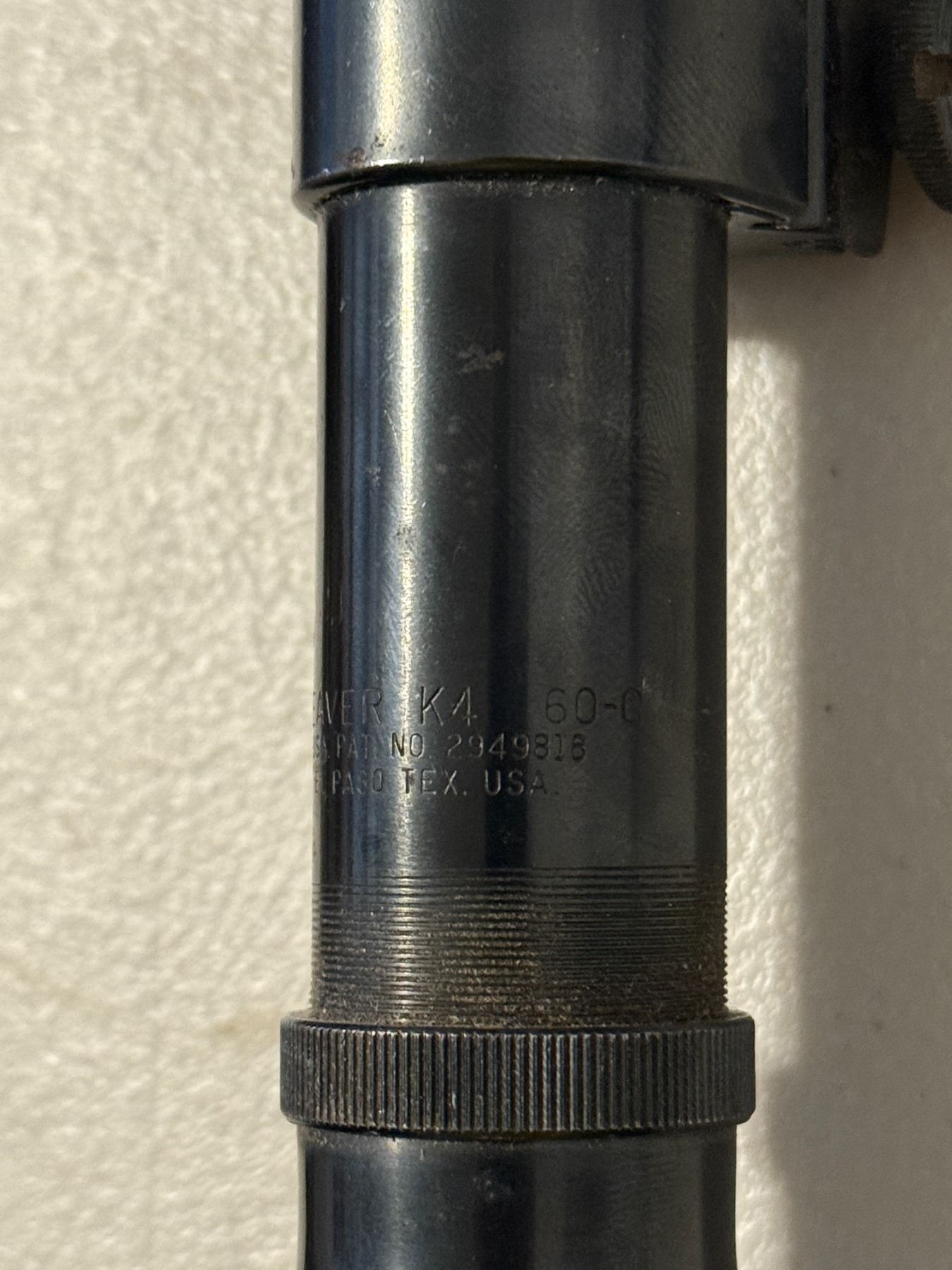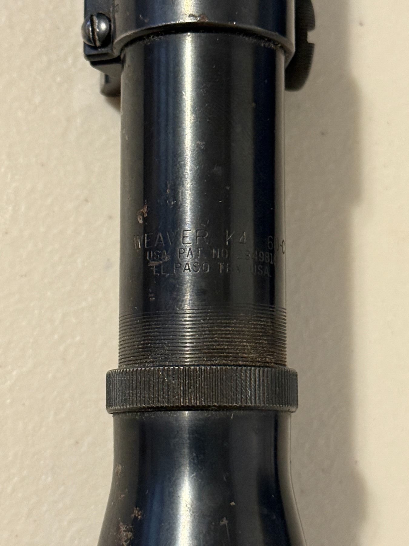 Classic vintage Weaver K4 fixed-power riflescope, marked K4 60-B and El Paso, Texas, USA. These steel-tube Weavers are sought after for their period-correct look on vintage hunting rifles. Includes original ring mounts.