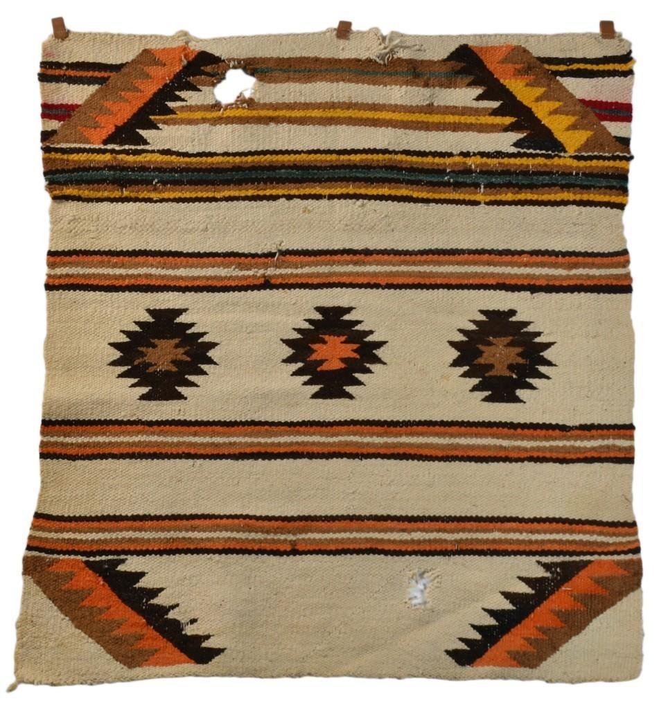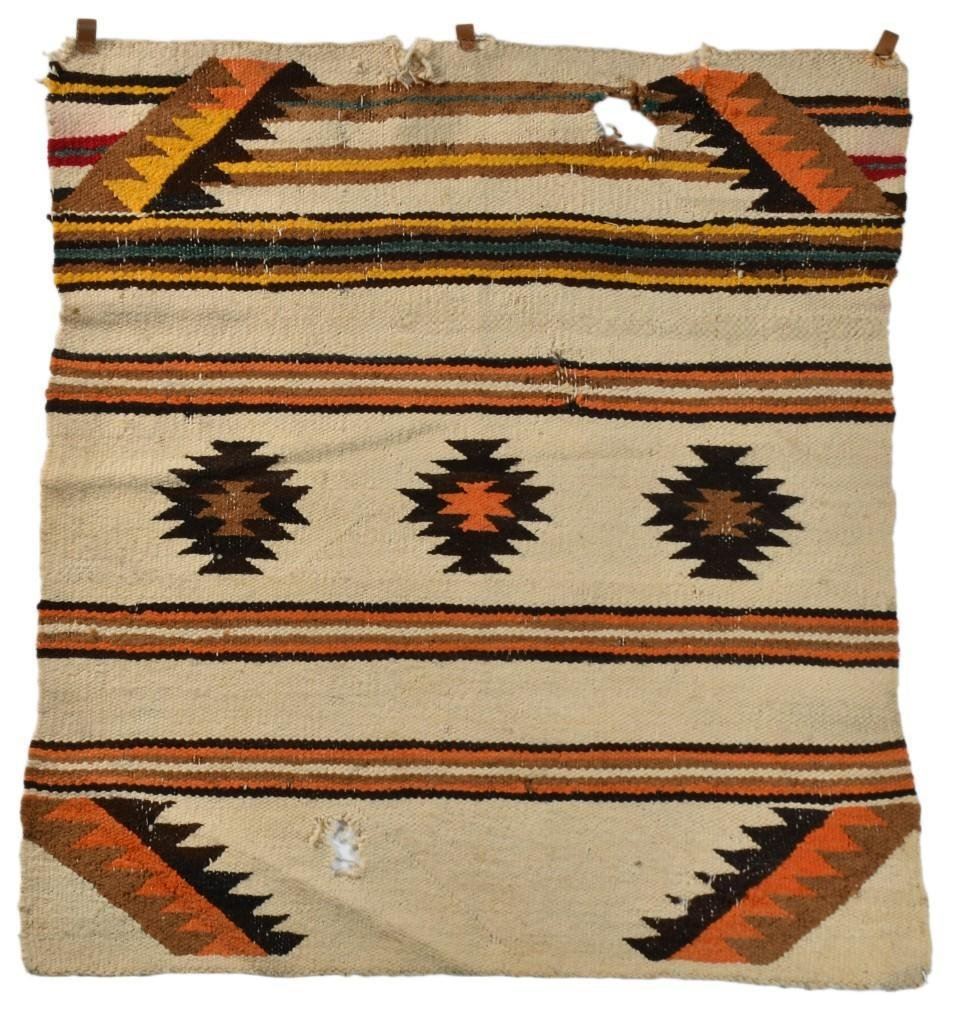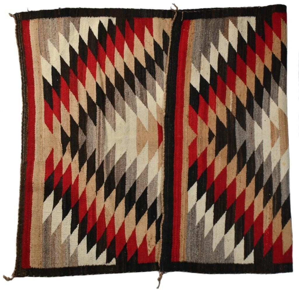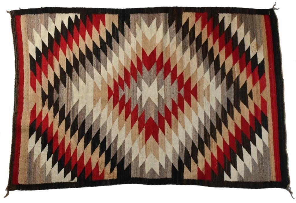 Lot consists of two western style rugs with ploychrome geometric motifs. Largest measures 39.25" x 57". **Fair condition. Some scattered soiling and staining. One with moderate moth holes, and pulling of weave.** $100-$300