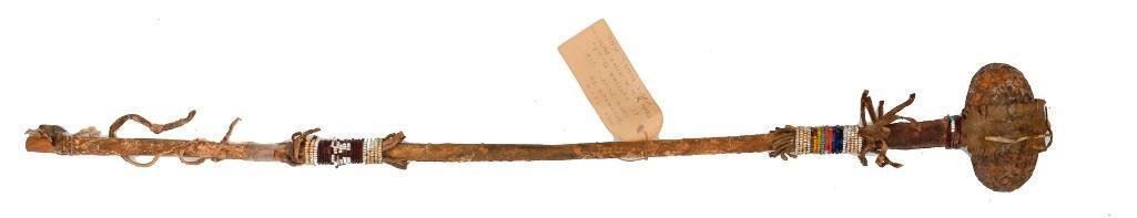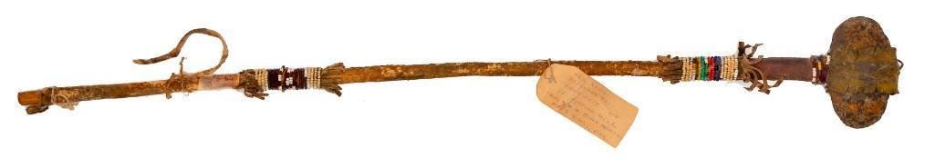 25.25" rawhide-covered haft with 4" x 2.5" stone head. Haft decorated in sections of beadwork in white, light blue, red, and tubular red. Some orange coloring remaining on head. Tag on haft reads "WAR CLUB/BELONGED TO/CROW FOOT-SON/OF SITTING BULL/FROM W.H. KING MUSEUM/HOT SPRINGS, ARK." Crow Foot, named after the eminent Blackfoot Chief, was the son of Lakota Chief Sitting Bull (TÈŸatȟáŋka Ãyotake) of the Hunkpapa Lakota. He was known as being wise for his age, not wishing to join the other boys in their games as young men usually did. At the behest of his father, he was educated in a Congregational day school and learned to read and write English. Crow Foot was killed alongside his father on December 15, 1890 at the Standing Rock Reservation in South Dakota. Several accounts of his death have been published, with varying degrees of involvement (or lack thereof) by Crow Foot. $6,000-$9,000