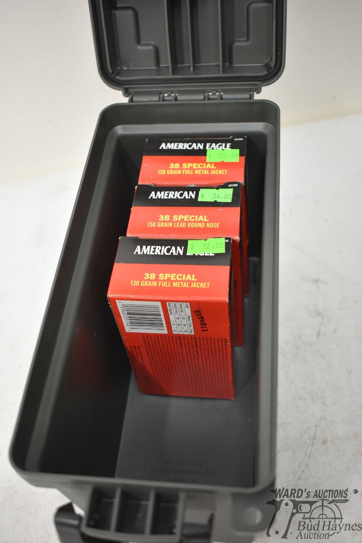 Plastic ammo box w/ three full 50 count boxes American Eagle .38 spl 158 gr lead round nose