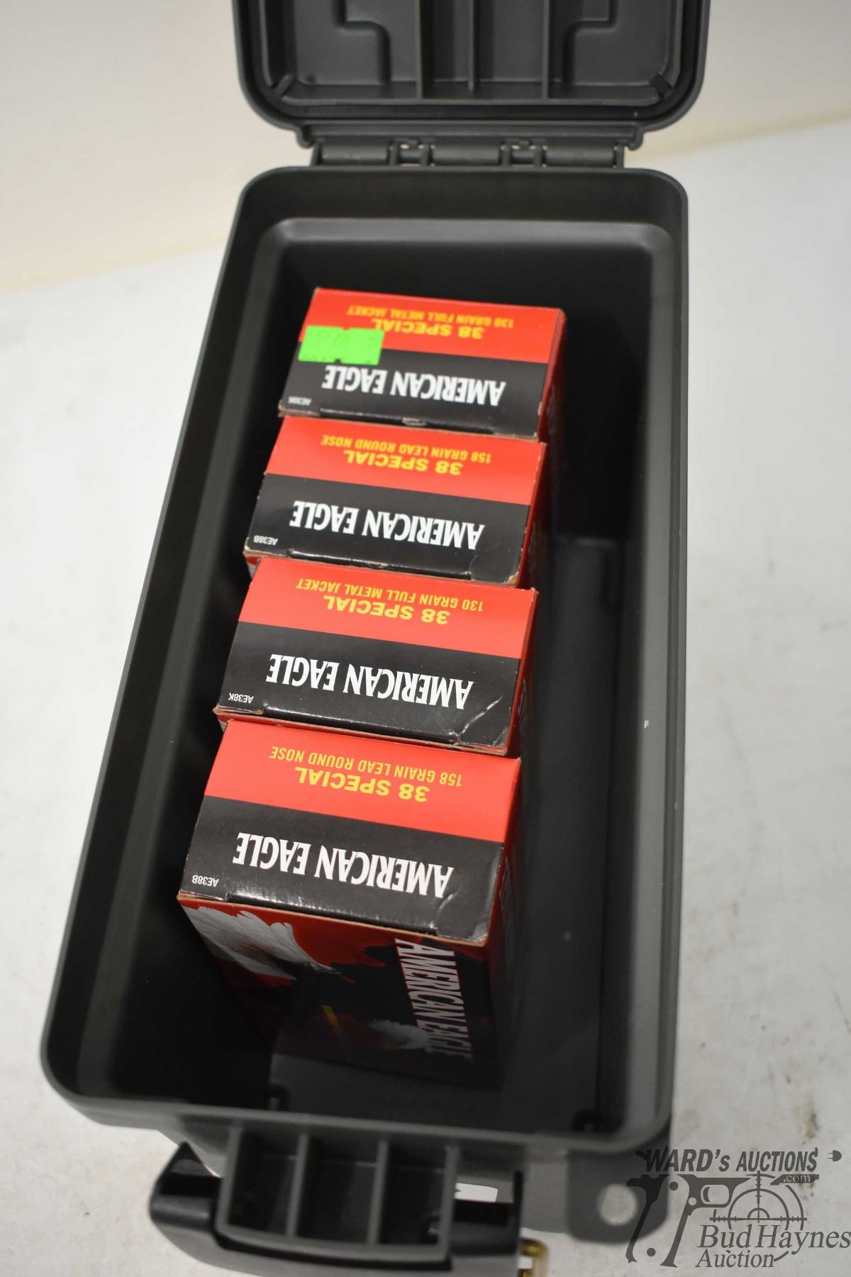 Plastic ammo box w/ three full 50 count boxes and one partial 26 count box American Eagle .38 spl 158 gr lead round nose
