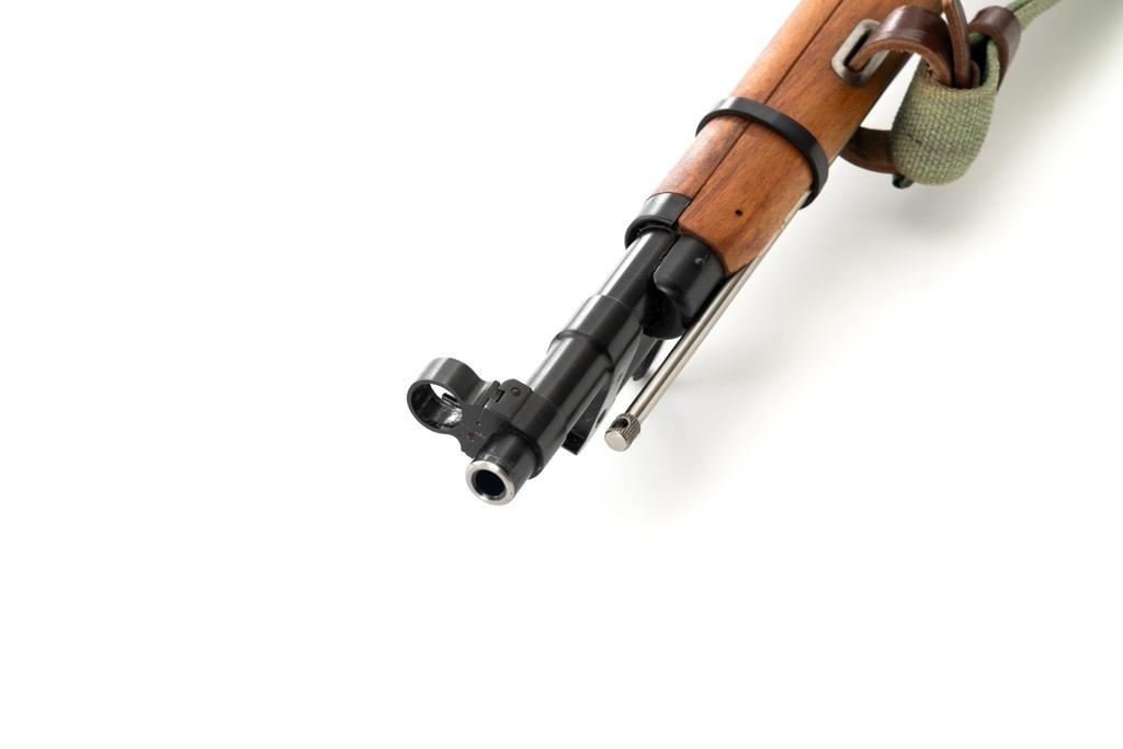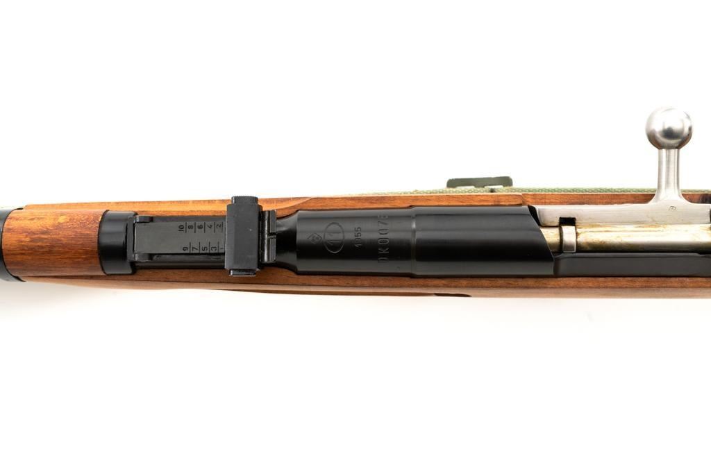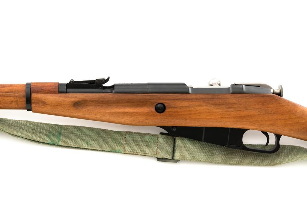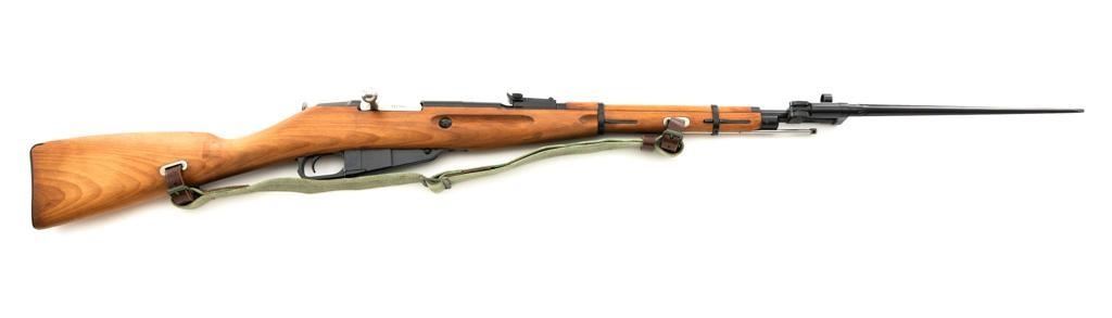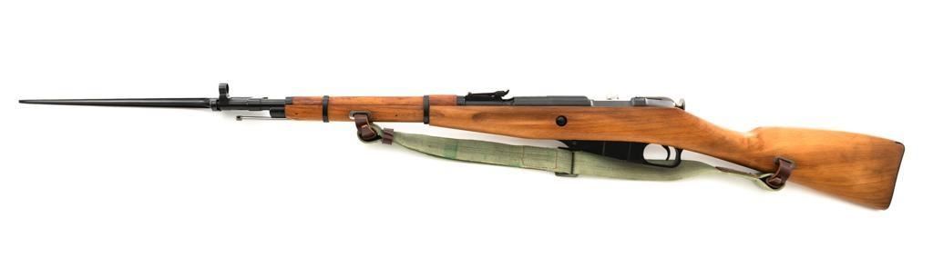 Polish M44 Mosin Nagant Bolt Action Rifle with Bayonet, #DK0076, 7.62x54Rmm cal., 20.5" barrel, blue finish, hardwood stock and handguard, hooded post front sight, and adjustable tangent rear sight with "U"-notched groove, graduated to 1000 meters. Includes folding bayonet, cleaning rod, and light green Polish cotton sling with leather collars. Bayonet and sling are in excellent condition. Top of the receiver ring is marked "(diamond )PW3" with arsenal "11" code, and dated 1955. There is a "(diamond)OW" stamp on right side of the buttstock. Matching numbers. No visible import marks. Rifle is in excellent overall condition, retaining almost all of its dark blue arsenal finish. Wood is in excellent condition, showing a darker stain around the stock wrist. Action operates smoothly. Bore rates very good with darkening toward the muzzle, and defined rifling. Est.: $350-$500. (C&R)