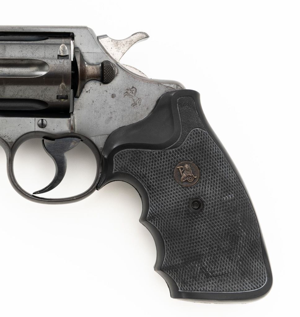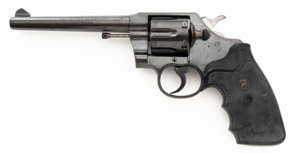 Post-War Colt Official Police Double Action Heavy Barrel Revolver, #523644, .38 Spl. cal., 6" heavy barrel, blue finish, checkered rubber Pachmayr "Gripper" two-piece combat grips, serrated blade front sight, and fixed square-notch rear sight. Mfgd 1949. Revolver is in fine overall condition, retaining approx. 90%-95% factory blue finish, with light wear at the muzzle and light scratches along the barrel. Frame shows edgewear and a spot of fine pin prick pitting on the right side, behind the recoil shield. Factory lettering is clear. Grips are very good and would benefit from cleaning. Action functions well and locks up securely. Bore with crisp rifling. Est.: $500-$700. (C&R/PPT)