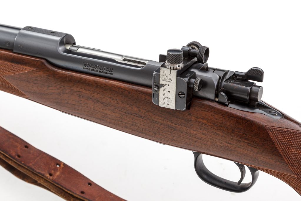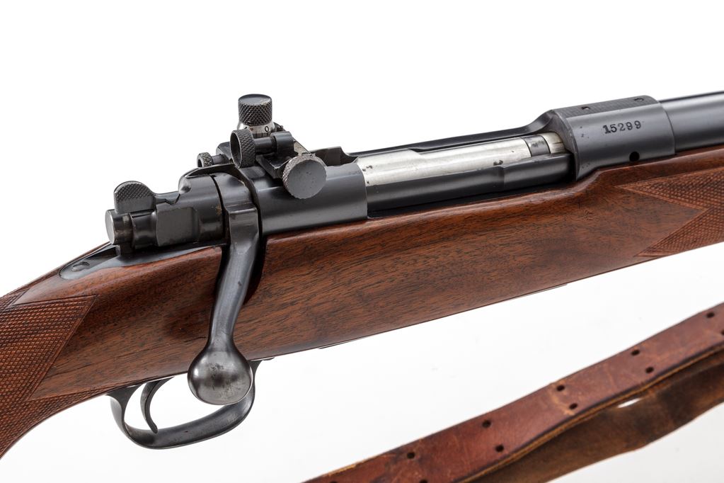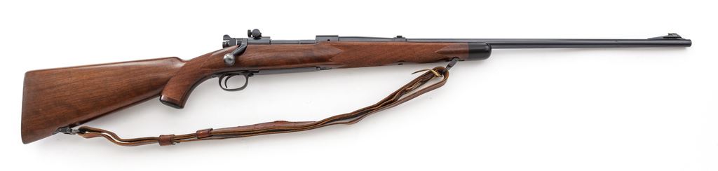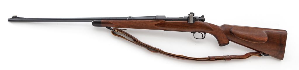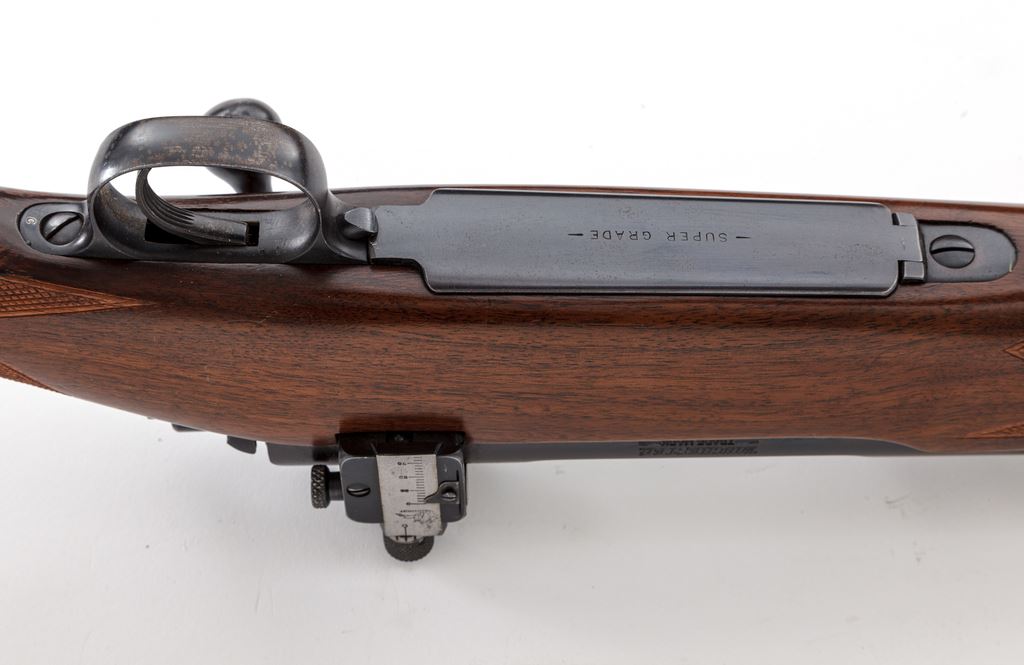 Pre-War Winchester Super Grade Model 70 Bolt Action Rifle, #15299, .220 Swift cal., 26'' barrel, blue finish, Super Grade checkered cheekpiece pistol-grip walnut stock features bird's beak checkering that completely surrounds the wrist area, as well as ebony forend cap and Winchester marked black hard rubber pistol grip cap; factory checkered steel buttplate, with period correct commercial brown leather sling; gold bead front and Redfield rear receiver sight. Magazine floorplate marked ''Super Grade''. Mfg'd 1938. Condition is excellent retaining approx. 96% lightly thinning blue, with most of the losses as flaking to the outside of the trigger guard. Stock with only the lightest marks from handling and mild impressions overall, and no real evidence of field use. Good action, mirror bright bore. Est.: $3,500-$5,000. (C&R)