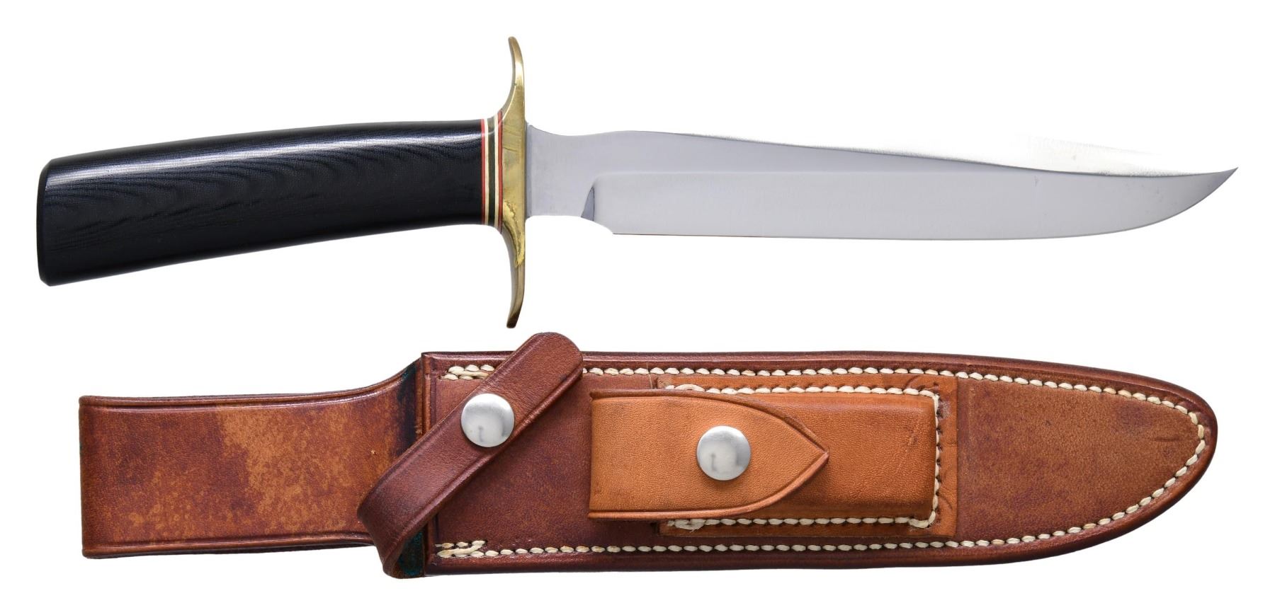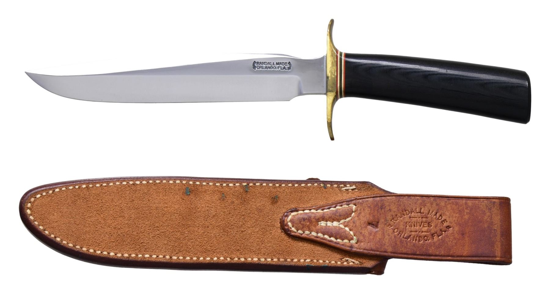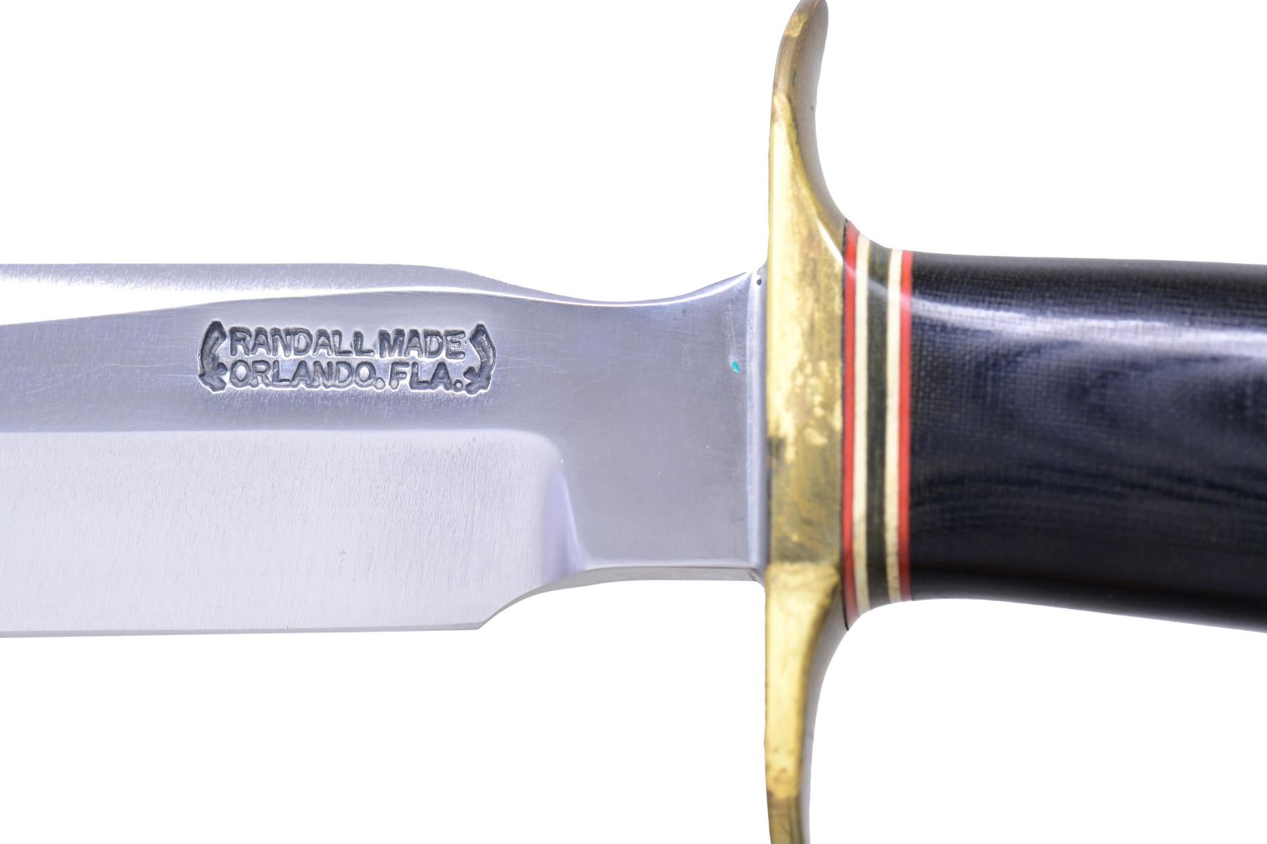 SHEATH. Model 1-7 All Purpose fighting knife produced by Randall. Left side of the blade is marked "RANDALL MADE/ ORLANDO, FLA." between 2 swords. Blade measures 7" from the point to the bottom of the ricasso, with an overall length of 11 5/8". Black Micarta handle, with red, white, and black spacers, as well as a brass full guard. UNATTACHED ACCESSORIES: brown leather sheath marked with Randall's mfg. information above "7" on the rear of the belt loop. Complete with its sharpening stone. CONDITION: blade is very good, showing some superficial handling marks, with a few spots of light cleaned pitting present on the right side, up towards the point. Brass guard exhibits a mellow patina, with spots of verdigris. Micarta handle is very good to excellent overall. Sheath remains malleable, showing areas of darker discoloration, as well as some spots of verdigris from the guard. PROVENANCE: From the Estate of Jon Thomas, Gunsport, LTD. (02-24071/MLW). $300-500.