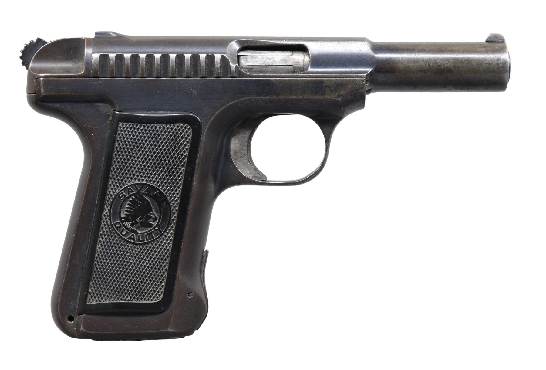 SEMI-AUTOMATIC PISTOL. Cal. 7.65mm. S# 153471. Bbl. 3 3/4". Model 1907 semi-automatic pistol mfg. by Savage under contract for the French military during World War I, this example falling within the appropriate 136000-167000 S# range. Top of the slide is marked with Savage's mfg. and patent information, followed by the dual cal. designation "CAL. 32./ 7.65. M-M.". Left side of the frame is marked "SAVAGE". Metal components exhibit a blue finish overall, save for on the trigger, which is case color hardened, as well as the bbl., which is polished in-the-white. Frame is mounted with 2-piece Savage checkered black hard rubber grips. Fixed half-moon blade front sight, with fixed U-notch rear sight. Additional features include a loaded chamber indicator, as well as a provision for a lanyard loop on the heel of the frame. MAGS: 1 10-rd. CONDITION: metal components retain large amounts of their original factory blue finish, exhibiting areas of wear and thinning that show through to gray patina, areas of mild pitting (on the slide, near the muzzle), as well as light to mild surface oxidation overall. Trigger retains traces of its original case color hardened finish. Fair bore, exhibiting consistent mild to moderate pitting, while retaining strong rifling throughout. Grips show smoothing and scattered superficial marks from handling and storage, but otherwise remain sturdy and serviceable. (25-2539/MLW). CURIO. $300-400.