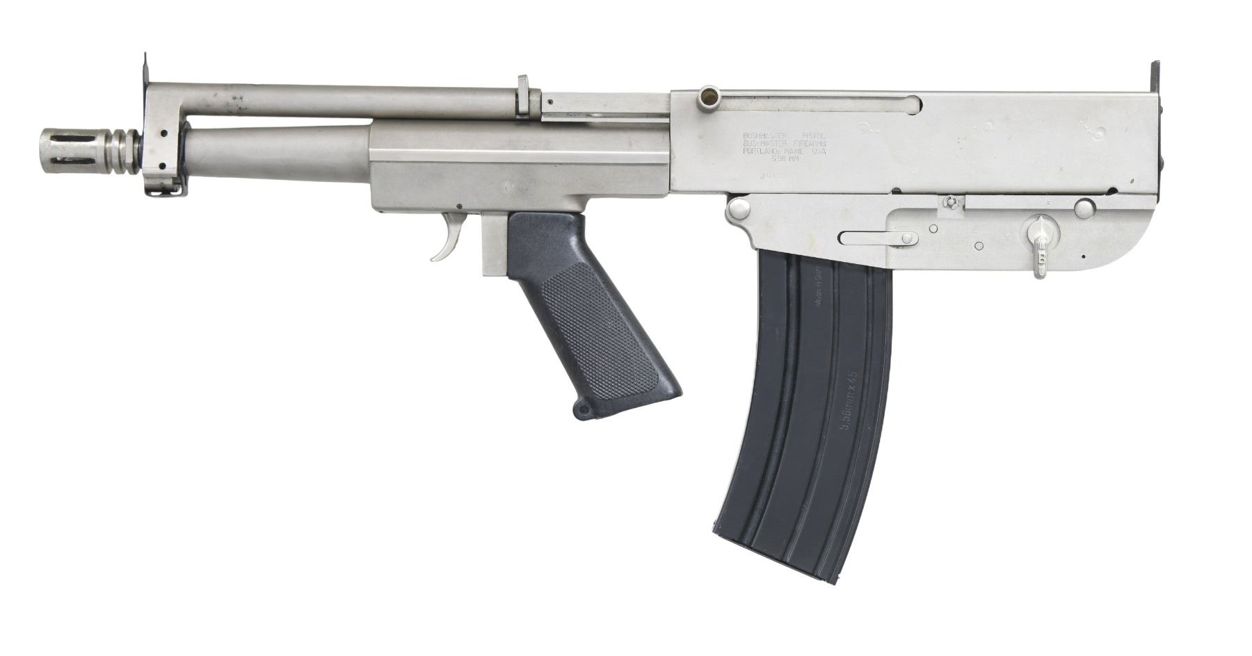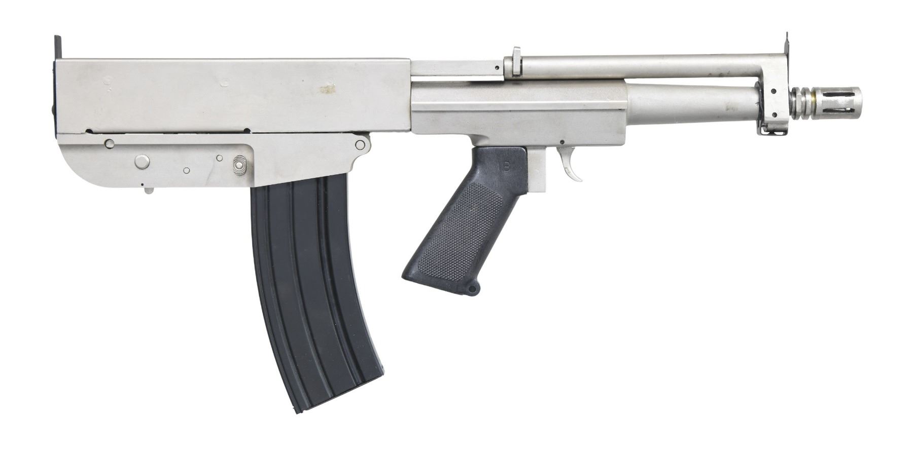 ARM PISTOL. Cal. 5.56mm. S# J01347. Bbl. 11". A Portland, Maine manufactured Bushmaster Pistol. This unique early Bushmaster version of the Colt Imp pistol swivels in front of the chamber to accommodate left hand or right hand shooting. Post front sight remains at 12 O'clock on barrel orientation but swivels several degrees clockwise & counter clockwise, w/ manually adjusted rear notch sight to match. Pistol is held flat to extended forearm to aim. Top mounted ejection port w/ left side charging handle. A1 style flash hider. Left side safety / selector. Satin Marine finish. MAGS: 1 steel 30 rd. CONDITION: Finish complete & consistent w/ some thinning in areas of mechanical intervention. Trigger guard absent. Bright bore w/ strong rifling. Fire control mechanism appears to function correctly when cycled by hand. (25-3237/JZ). MODERN. $600-900.