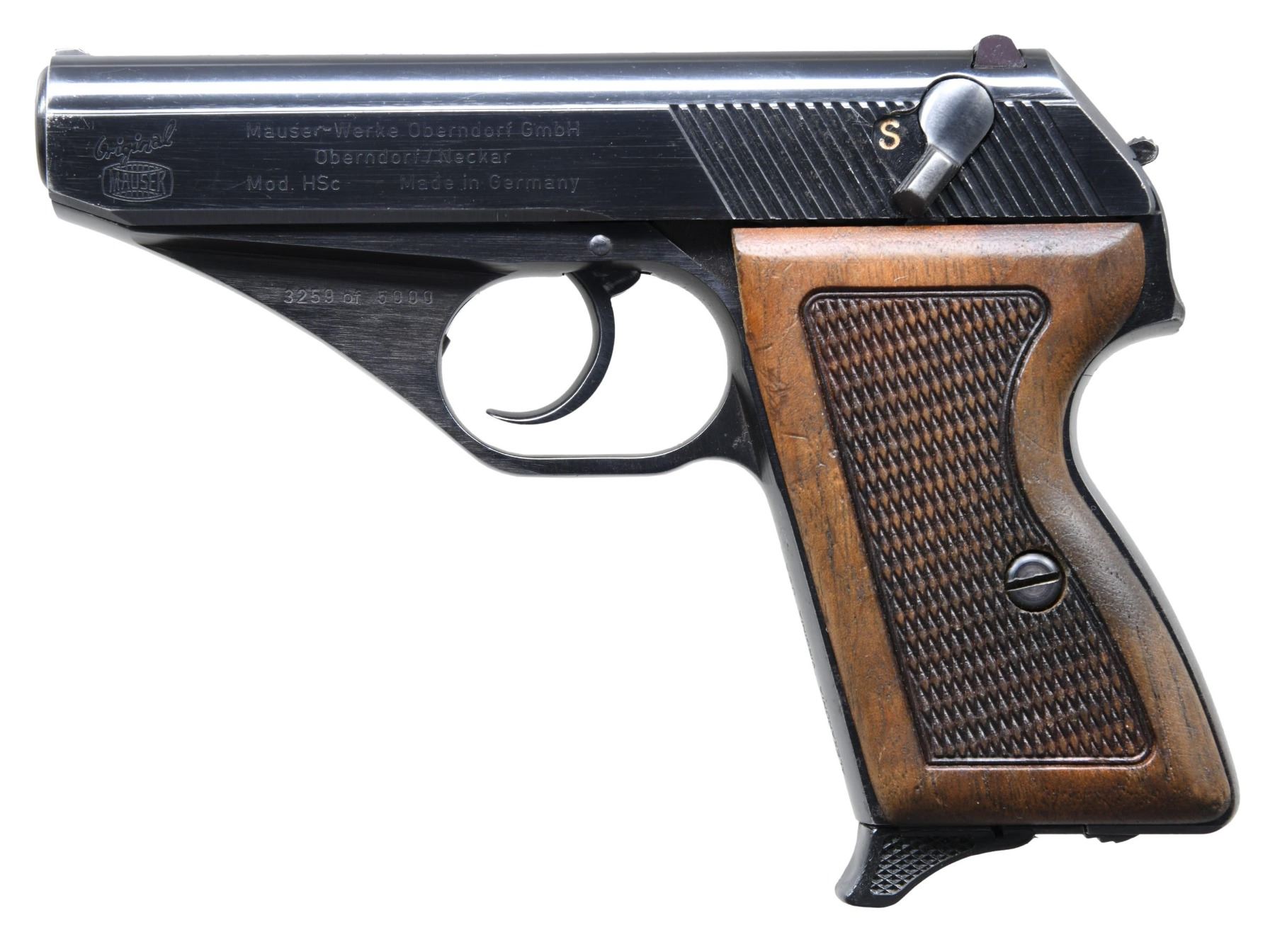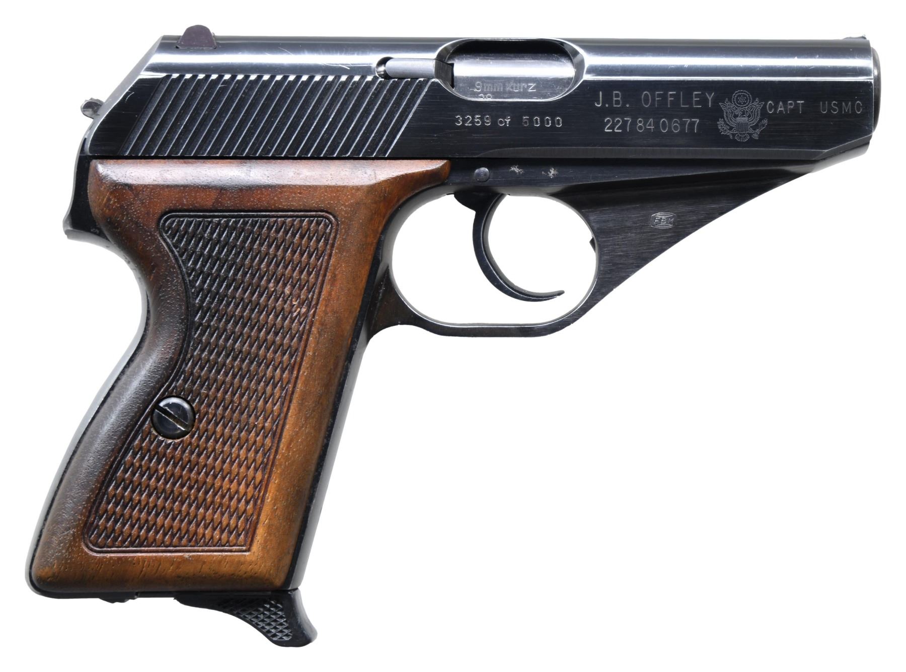 SEMI-AUTOMATIC PISTOL, INSCRIBED TO CAPTAIN J.B. OFFLEY, USMC. Cal. 9mm Kurz. S# 3259. Bbl. 3 1/4". 1 of only 5,000 Model HSc American Eagle semi-automatic pistols mfg. by Mauser and imported by Interarms. Left side of the slide is marked with the Original Mauser logo, followed by markings stipulating Mauser's mfg. information, as well as the model designation, with "3259 of 5000" (also present on left side of frame), followed by "J.B. OFFLEY/ 227 84 0677", a Great Seal of the United States, and "CAPT USMC" marked on the right. Front grip strap is marked with Interarms' importer information. Metal components exhibit a polished blue finish overall, with a matte blue finish present on the sight groove and rear of the slide. Bbl. is polished in-the-white. Frame is mounted with 2-piece checkered wood grips. Standard fixed blade front sight, with dovetailed square notch rear sight (rear faces of sights painted white). All serialized parts are matching and include the frame, slide, and bbl. MAGS: 1 7-rd. mag., with black synthetic grip extension. CONDITION: metal components retain the vast majority of their original factory blue finish, exhibiting a few spots of light edge wear and some scattered superficial handling marks overall. Front grip strap exhibits a small spot of light pitting, with the left edge of the rear grip strap exhibiting consistent light surface oxidation. Brilliant mirror bore, retaining well defined rifling throughout. Grips show scattered marks from handling and storage, with the left grip exhibiting a chip on the top left corner of the panel. (25-2364/MLW). MODERN. $400-800.